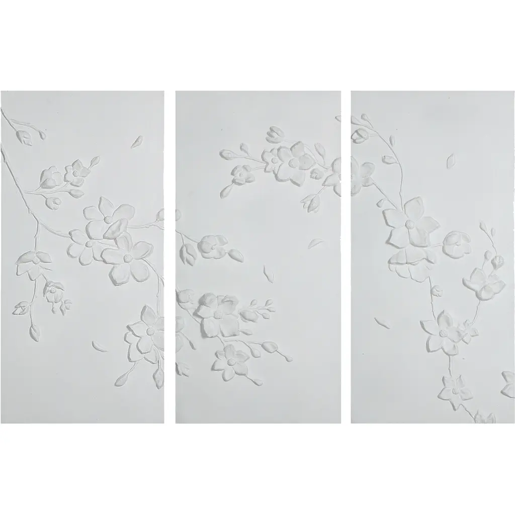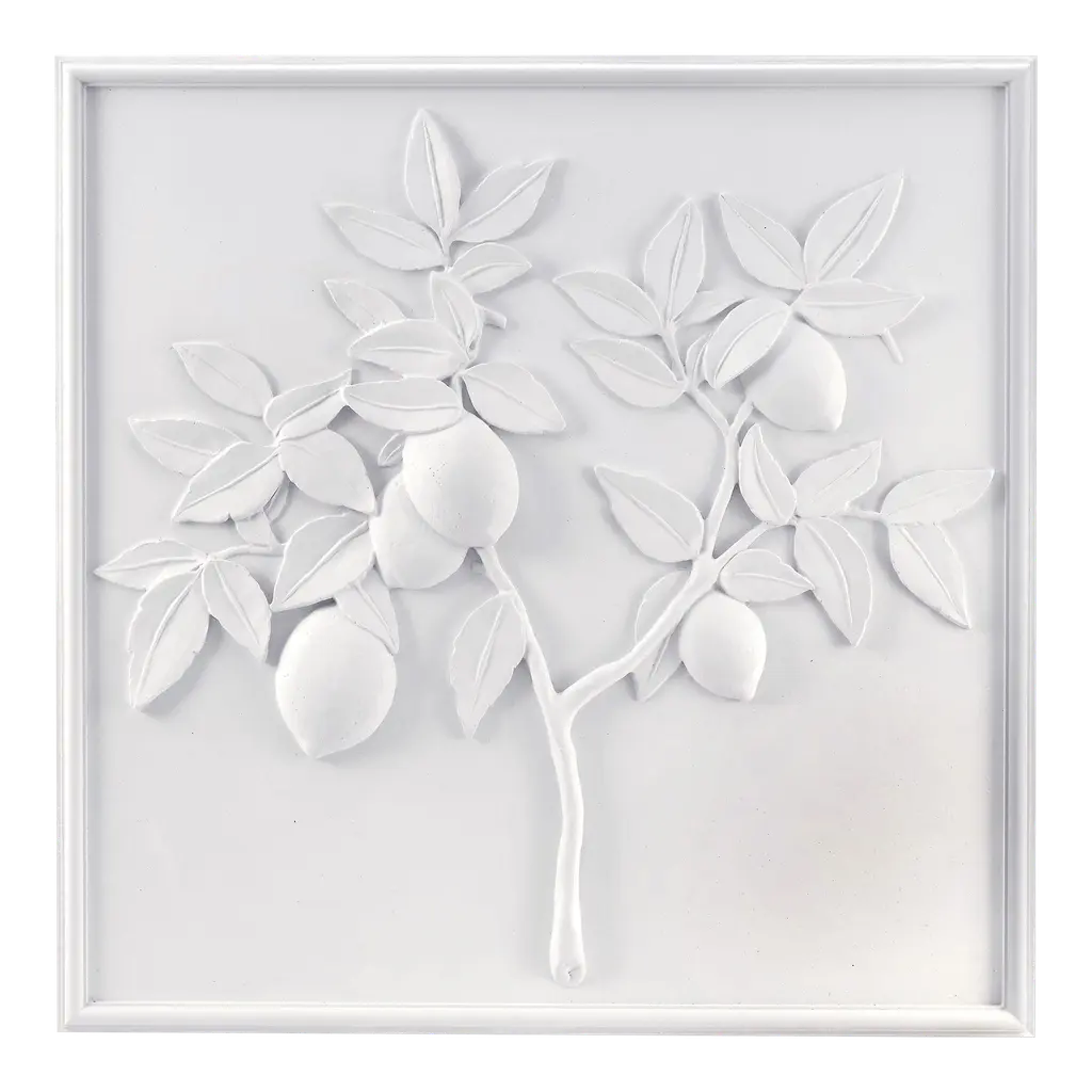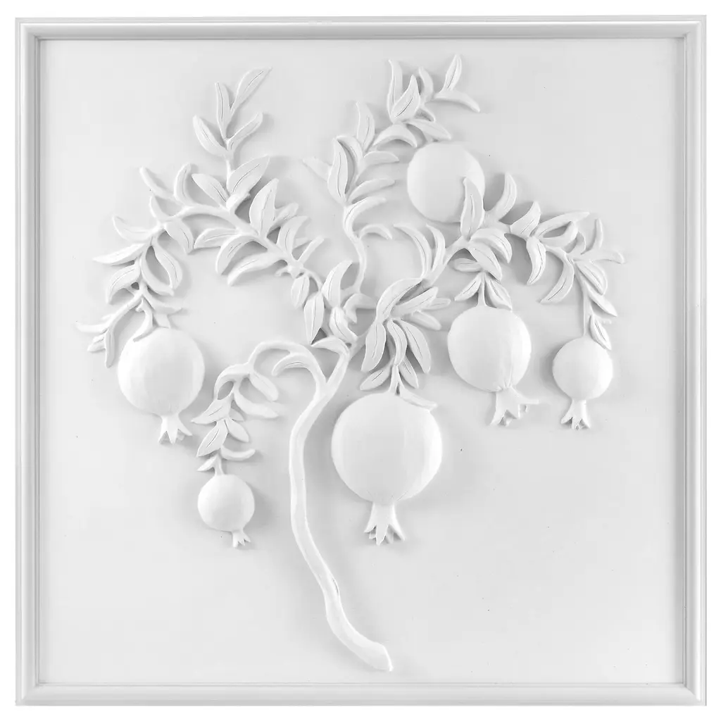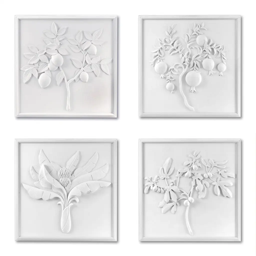 A set of four of our 18" x 18" plaster panels: Pomegranate, Fig, Banana, and Lemon. Handcrafted in the USA. Hand Cast Plaster with natural fiber reinforcement. Embedded hanger on back of panel for wall hanging. Suitable for indoor use only. Please note that we do not accept returns or cancellations on made to order items.