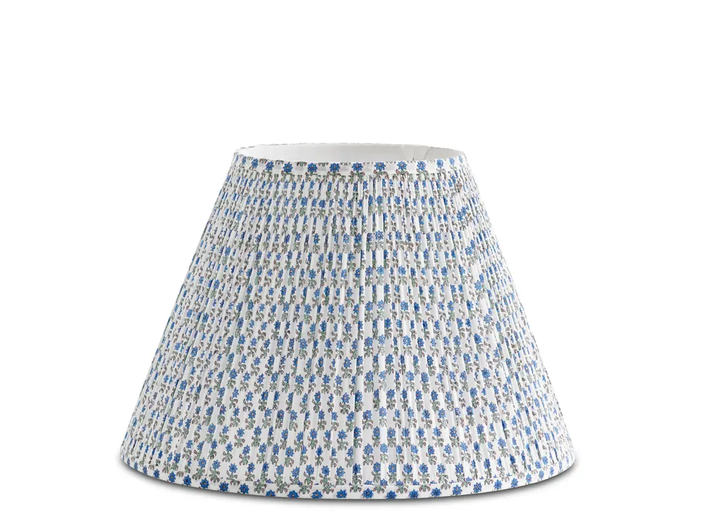 Patterned lampshades have long been a decorator’s secret to add color and texture to a space in a unique way. Our exclusive patterned shades are the perfect tool for this.  This small light blue flower pattern is pretty and delicate, a wonderful contrast to add to our Brush Stroke Lamp (Blue) or Chicken Feather Lamp (Blue). Scaled to work on nearly all of the Bunny Williams Home table lamps. This lamp shade features a spider fitting, which is the common standard and will fit most lamp bases. This shade also comes with a washer for a seamless fit with your lamp finial.