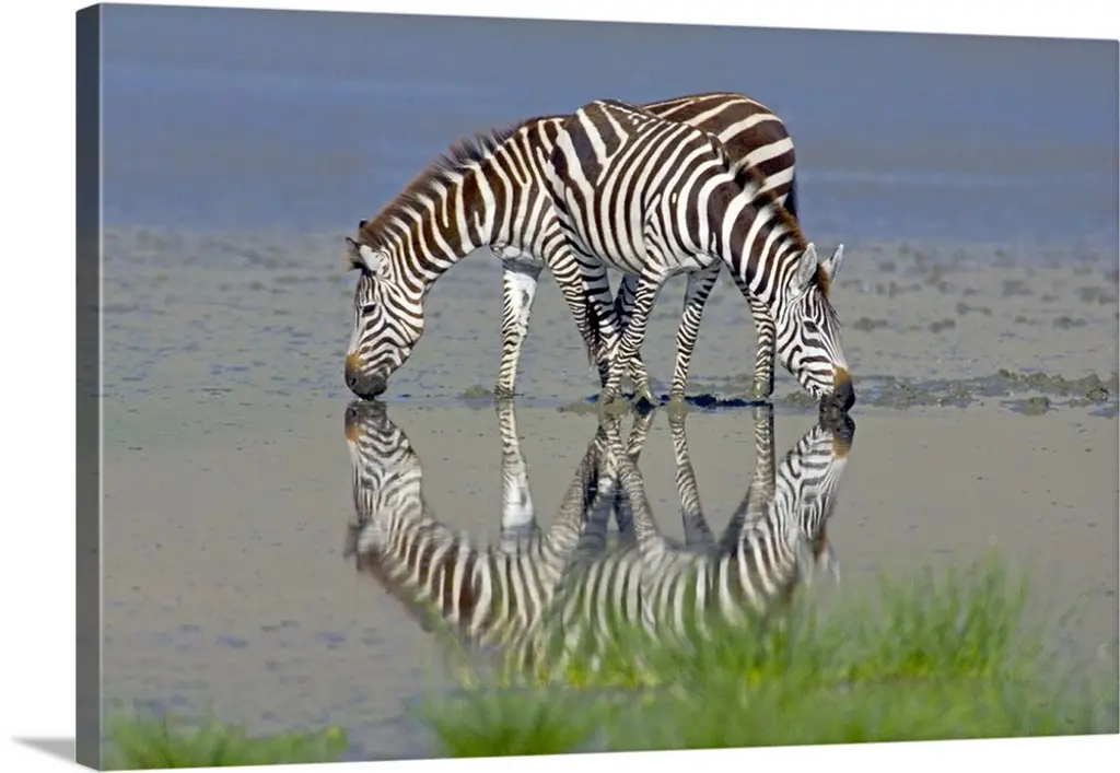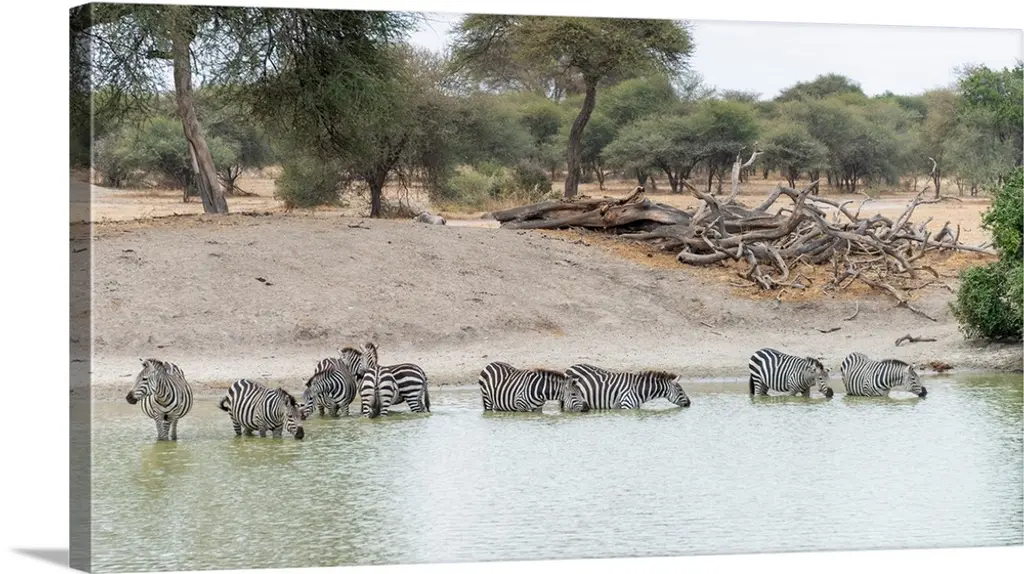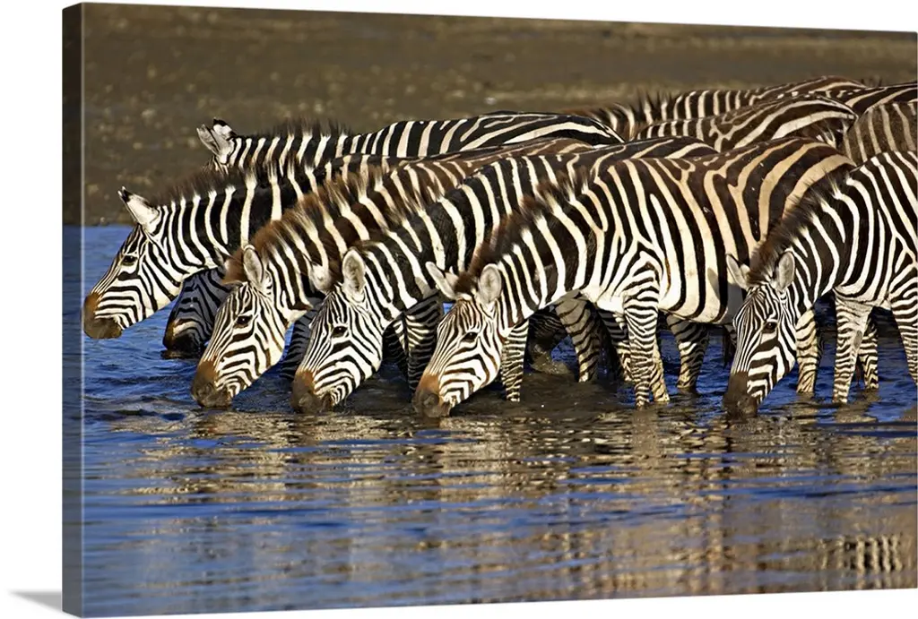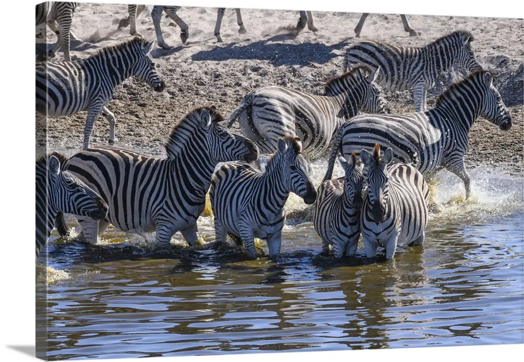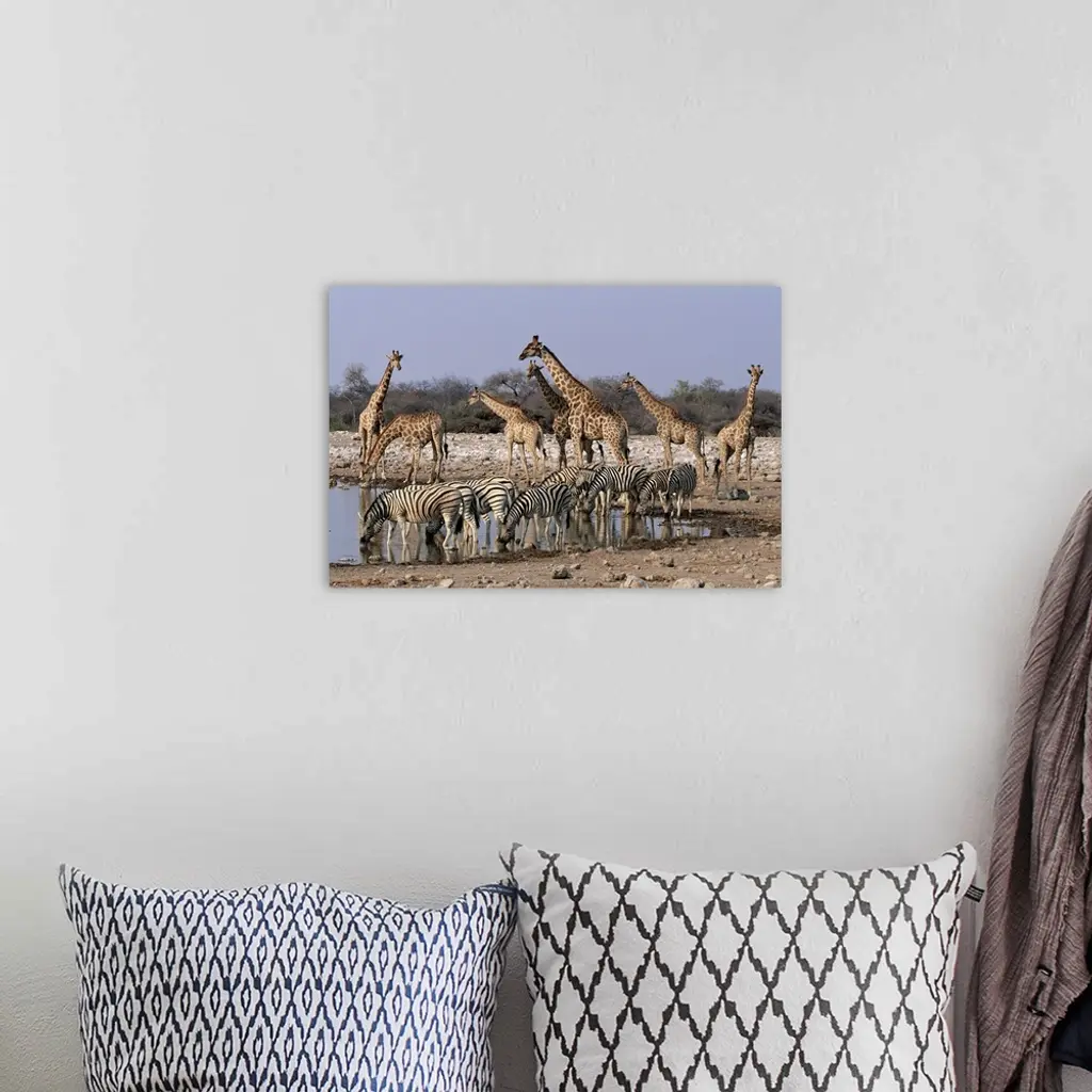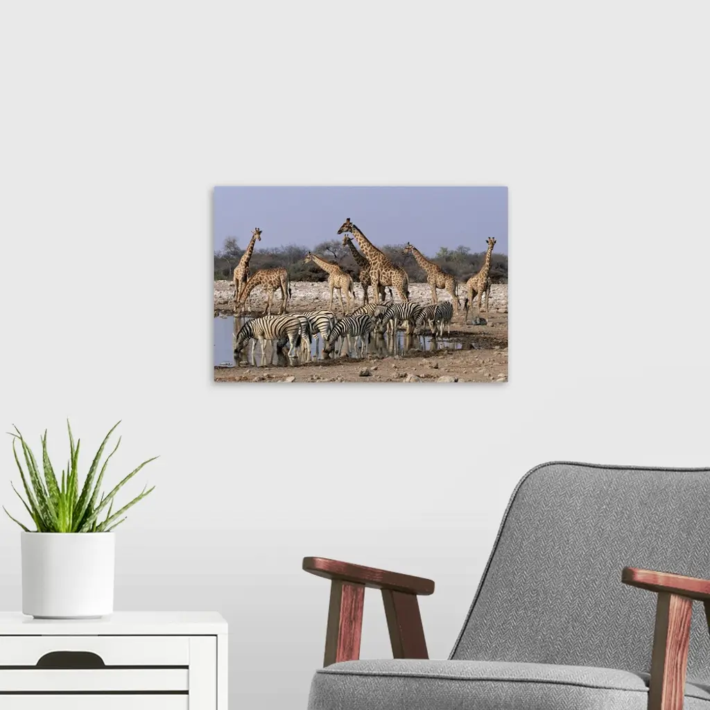 Burchell's Zebra And Giraffe At Waterhole, Etosha National Park, Namibia