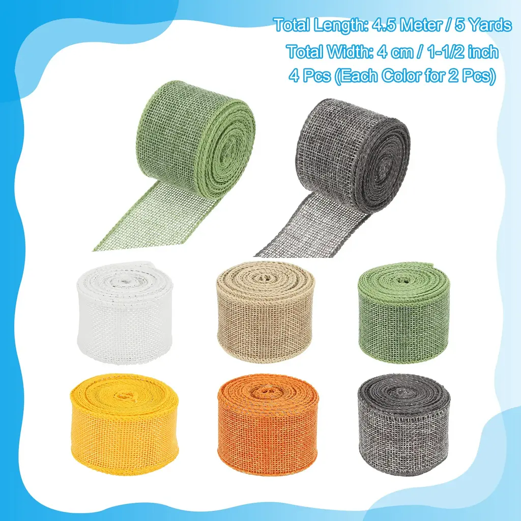 Burlap fabric ribbon is good for decorating your craft items, like tying a bow on it or wrapping items, widely used in art crafts, wine bottle decoration, package decoration, flower arrangement, DIY cloth sewing, and so on. They can be transformed into garlands, bows, and other decorations to decorate various items like chairs, DIY projects, trees, gift baskets, tables, doors, windows, and more.SpecificationMaterial: Burlap FabricTotal Length: 4.5 Meter / 5 YardsTotal Width: 4 cm / 1-1/2 inchPacking List: 4Pcs x Burlap Fabric Ribbon (Each Color for 2 Pcs)AdvantageThis burlap ribbon is crafted from good material that is sturdy, long-lasting, resistant to wear, sleek, and resistant to fading. These natural burlap ribbons can be easily rolled up without wrinkling, making them convenient to handle and transport. They prevent tangling and can be effortlessly stored in lockers, drawers, craft rooms, and other spaces.InstructionEach roll of the burlap ribbon is about 4 cm / 1.5 inches in width and 4.5 m / 5 yards in length. You can cut the length according to your needs.Note: Please check the size you need before purchasing.