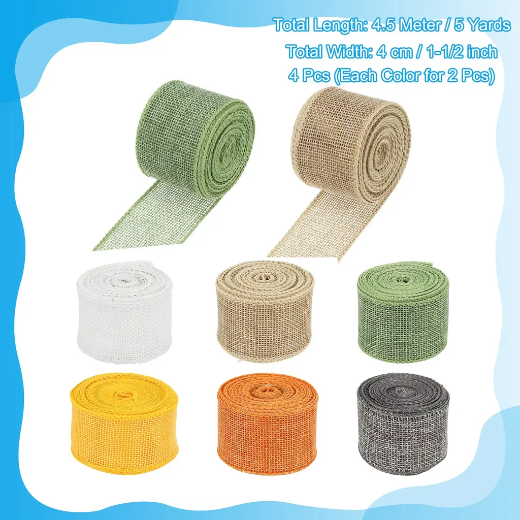 Burlap fabric ribbon is good for decorating your craft items, like tying a bow on it or wrapping items, widely used in art crafts, wine bottle decoration, package decoration, flower arrangement, DIY cloth sewing, and so on. They can be transformed into garlands, bows, and other decorations to decorate various items like chairs, DIY projects, trees, gift baskets, tables, doors, windows, and more.SpecificationMaterial: Burlap FabricTotal Length: 4.5 Meter / 5 YardsTotal Width: 4 cm / 1-1/2 inchPacking List: 4Pcs x Burlap Fabric Ribbon (Each Color for 2 Pcs)AdvantageThis burlap ribbon is crafted from good material that is sturdy, long-lasting, resistant to wear, sleek, and resistant to fading. These natural burlap ribbons can be easily rolled up without wrinkling, making them convenient to handle and transport. They prevent tangling and can be effortlessly stored in lockers, drawers, craft rooms, and other spaces.InstructionEach roll of the burlap ribbon is about 4 cm / 1.5 inches in width and 4.5 m / 5 yards in length. You can cut the length according to your needs.Note: Please check the size you need before purchasing.
