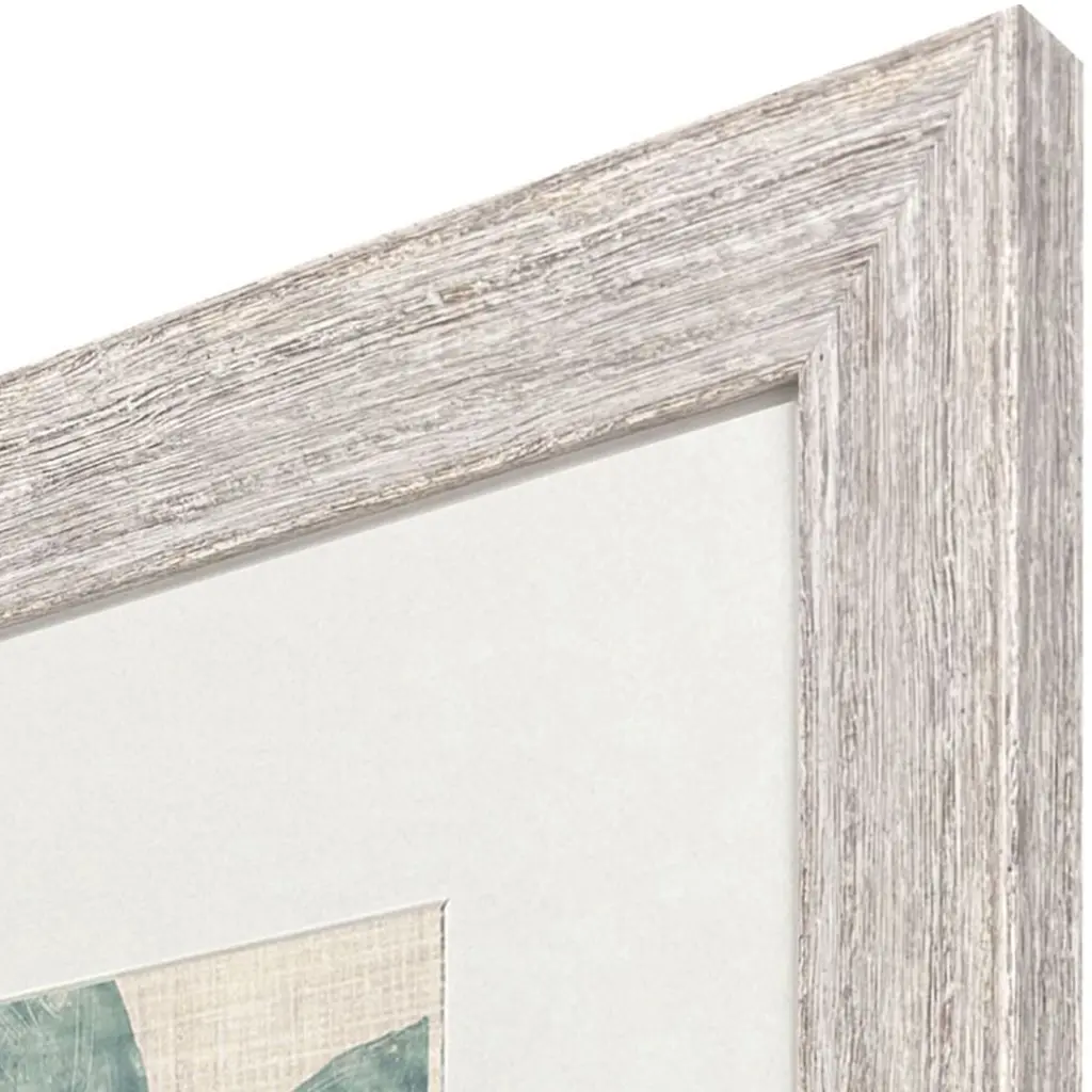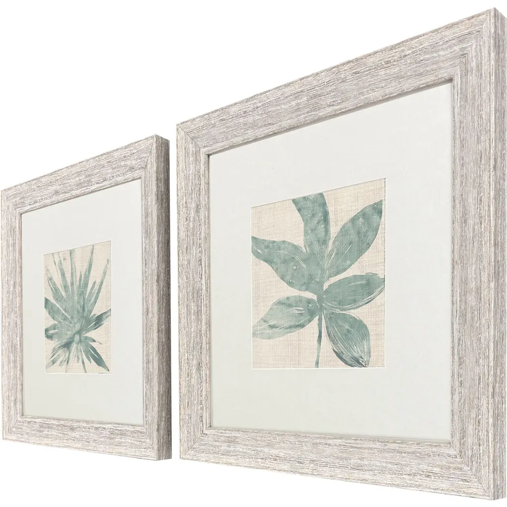 A set of two palm leaf botanical prints are matted in oyster. Framed in a sloped profile molding with a distressed whitewash finish.