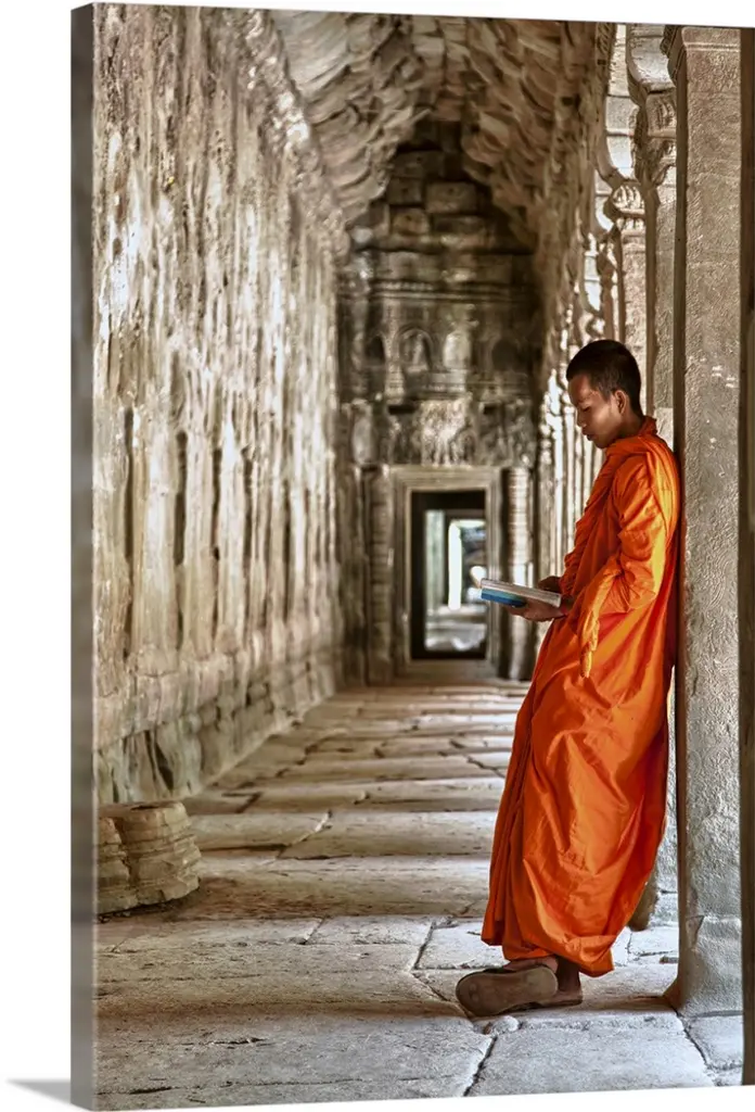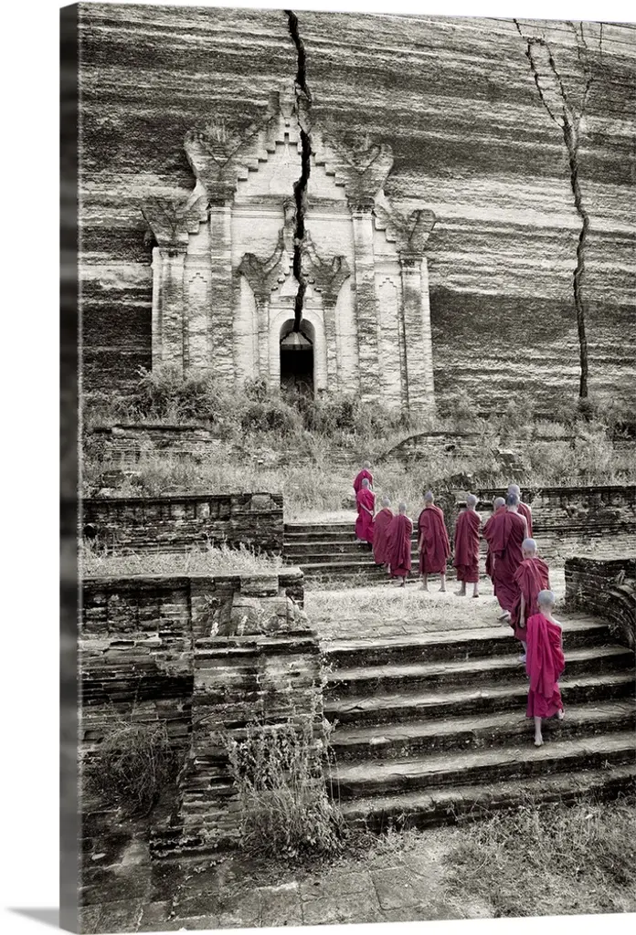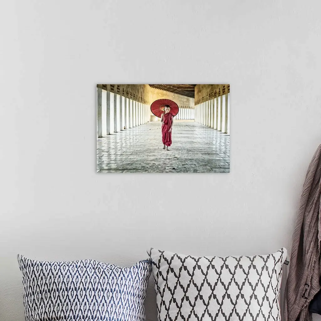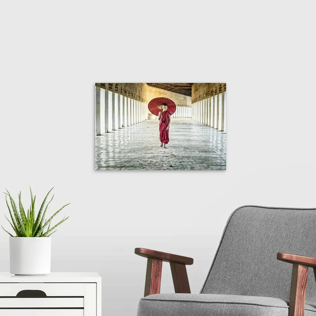 Burmese monk with parasol walking in his monastery