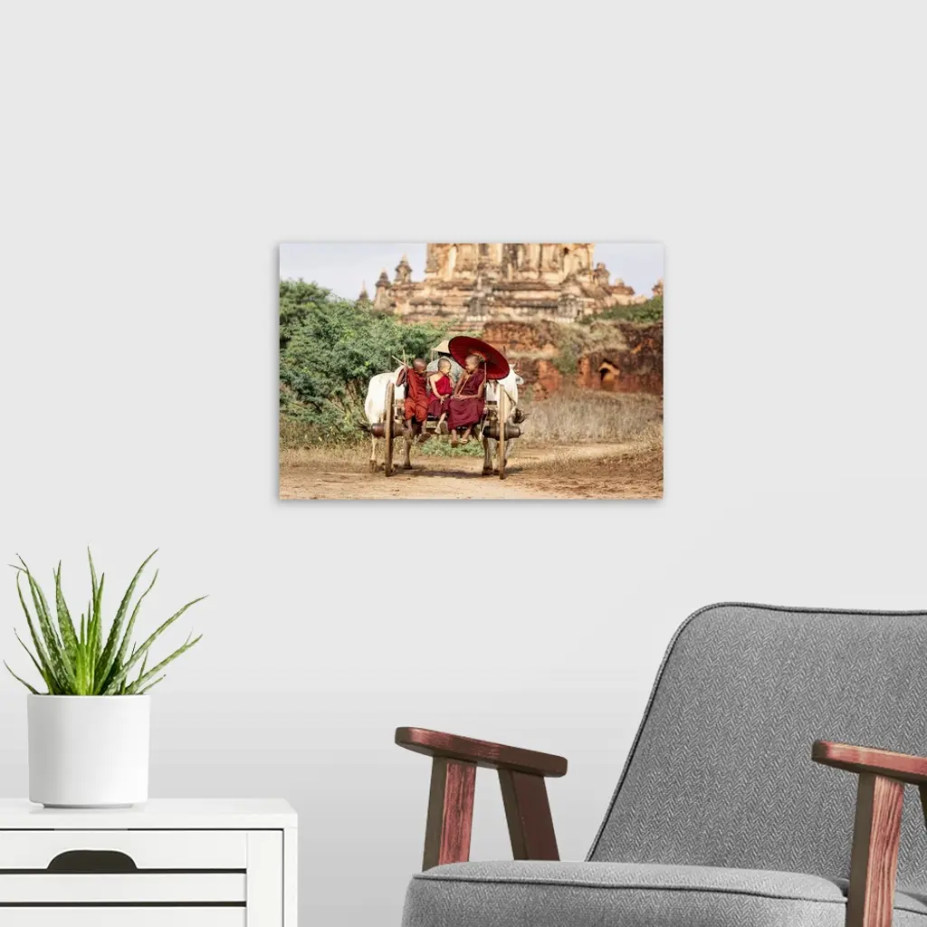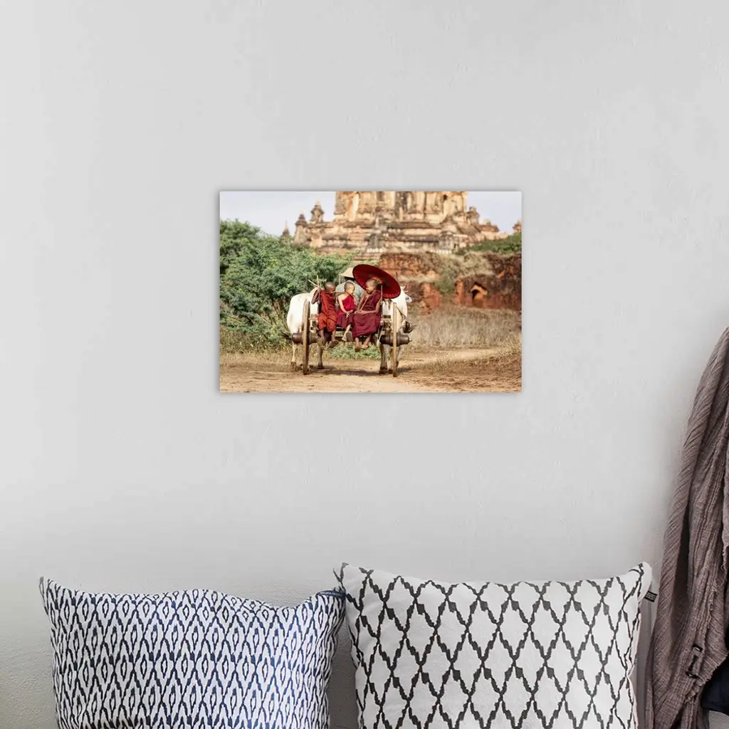 Burmese Monks On An Oxcart In Bagan, Myanmar