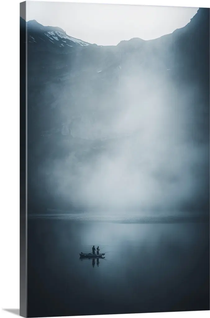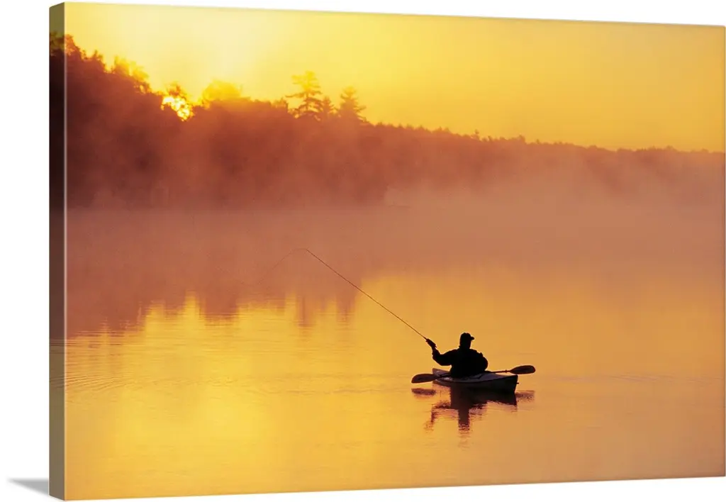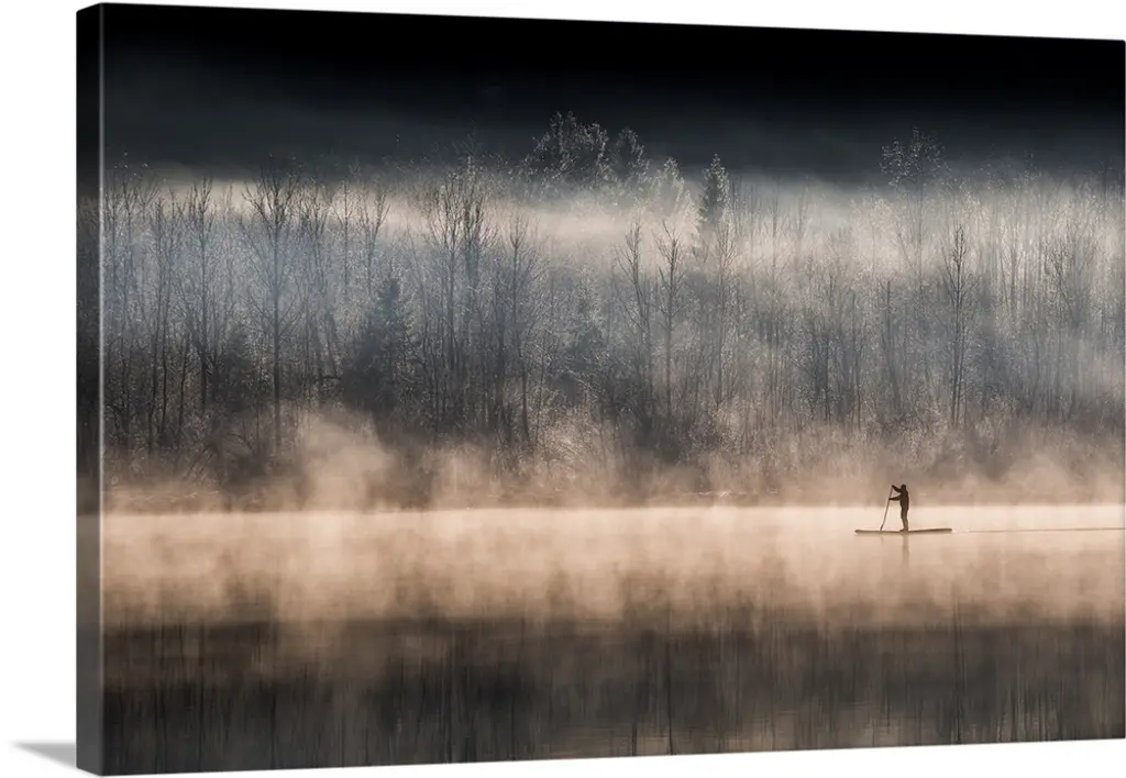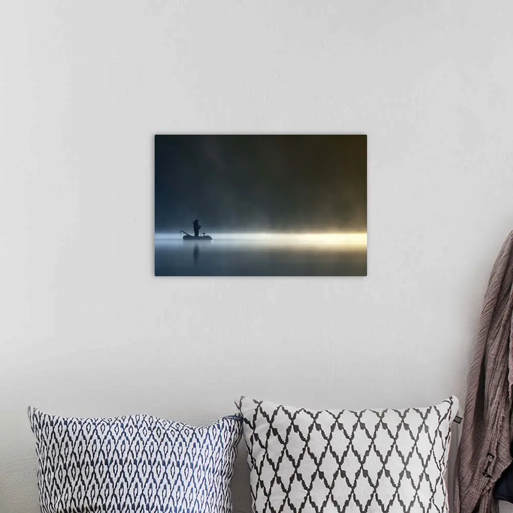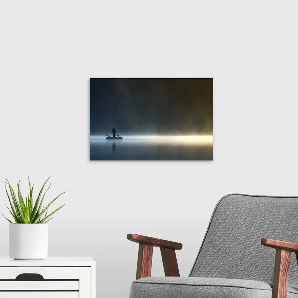 A fisherman stands in his boat on a calm, misty lake, Poland.