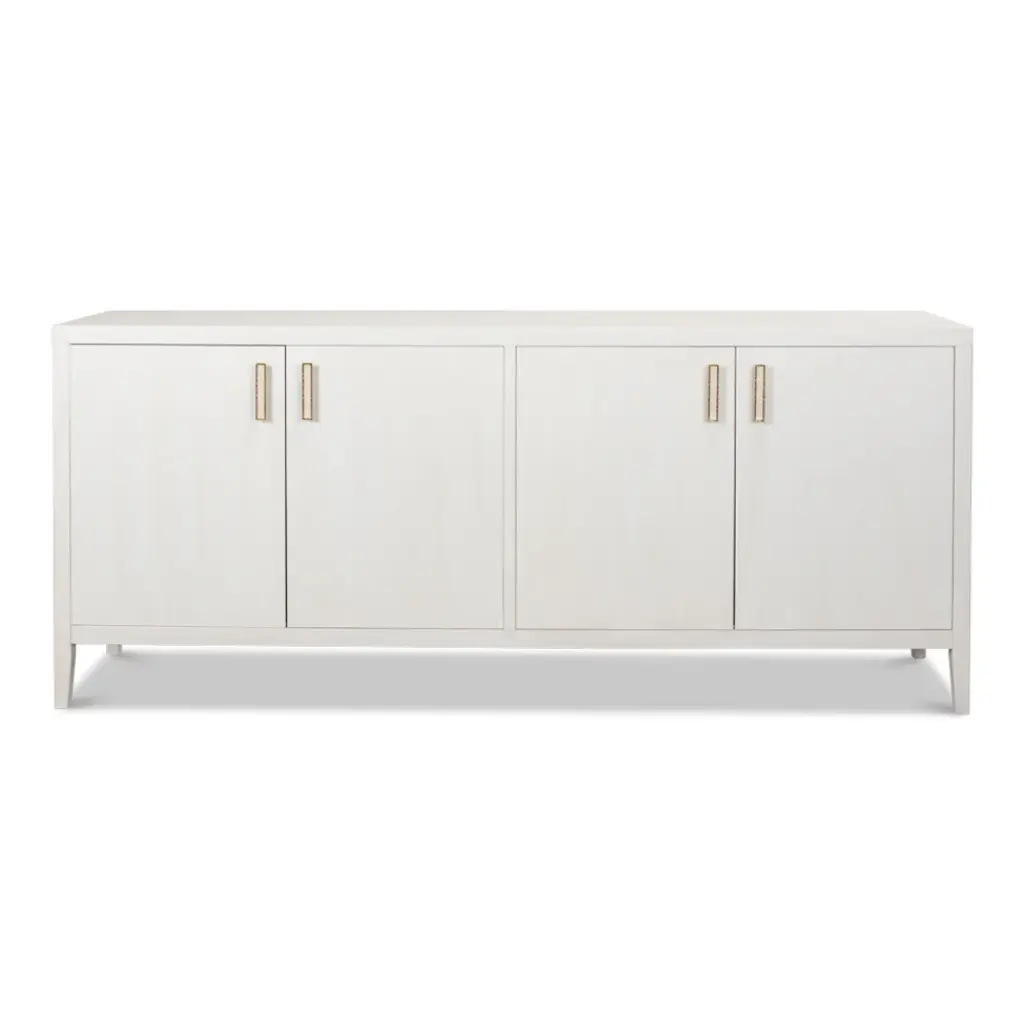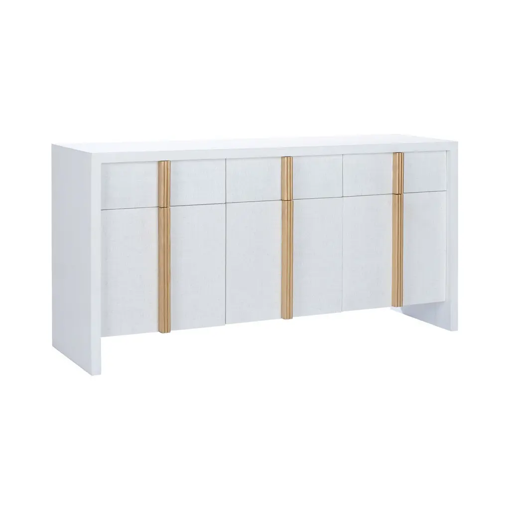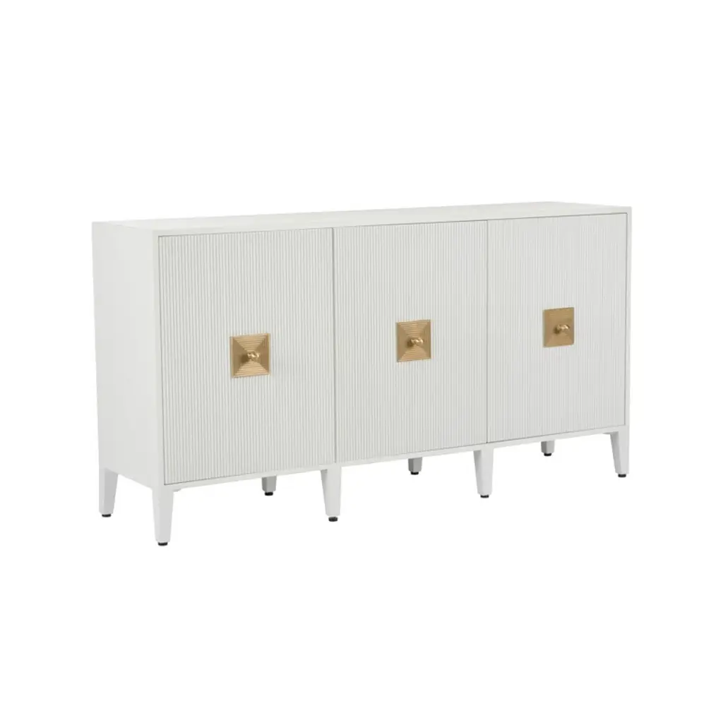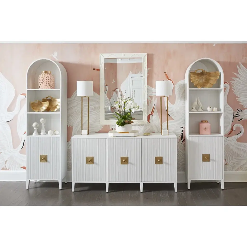 Designed for both style and functionality, the Burns Credenza offers ample storage space for your dining essentials. With multiple shelves it provides organization without compromising on aesthetic appeal, making it perfect for both formal dining rooms and casual entertaining spaces. The reeded wood detailing on the facade adds a captivating texture, and the aged brass hardware brings a touch of vintage-inspired glamour. Designed by Elizabeth Wicker.