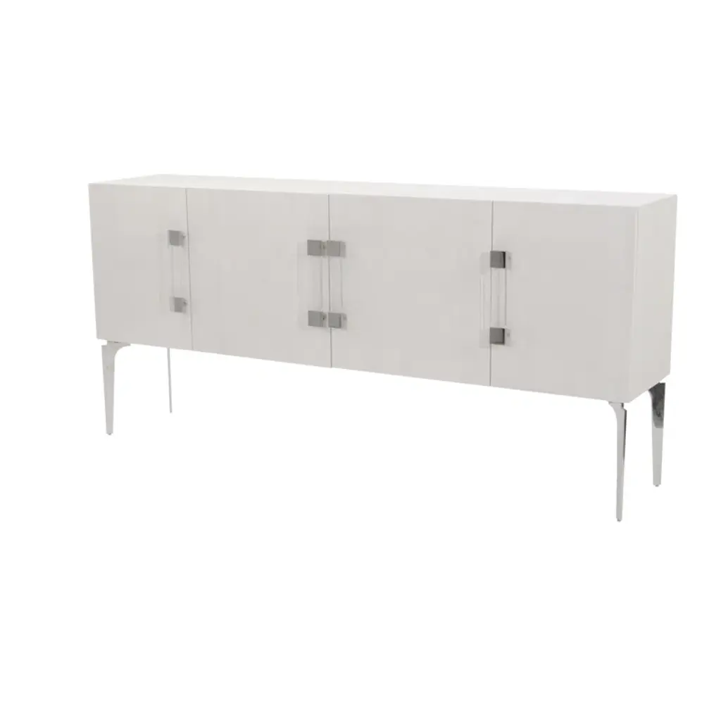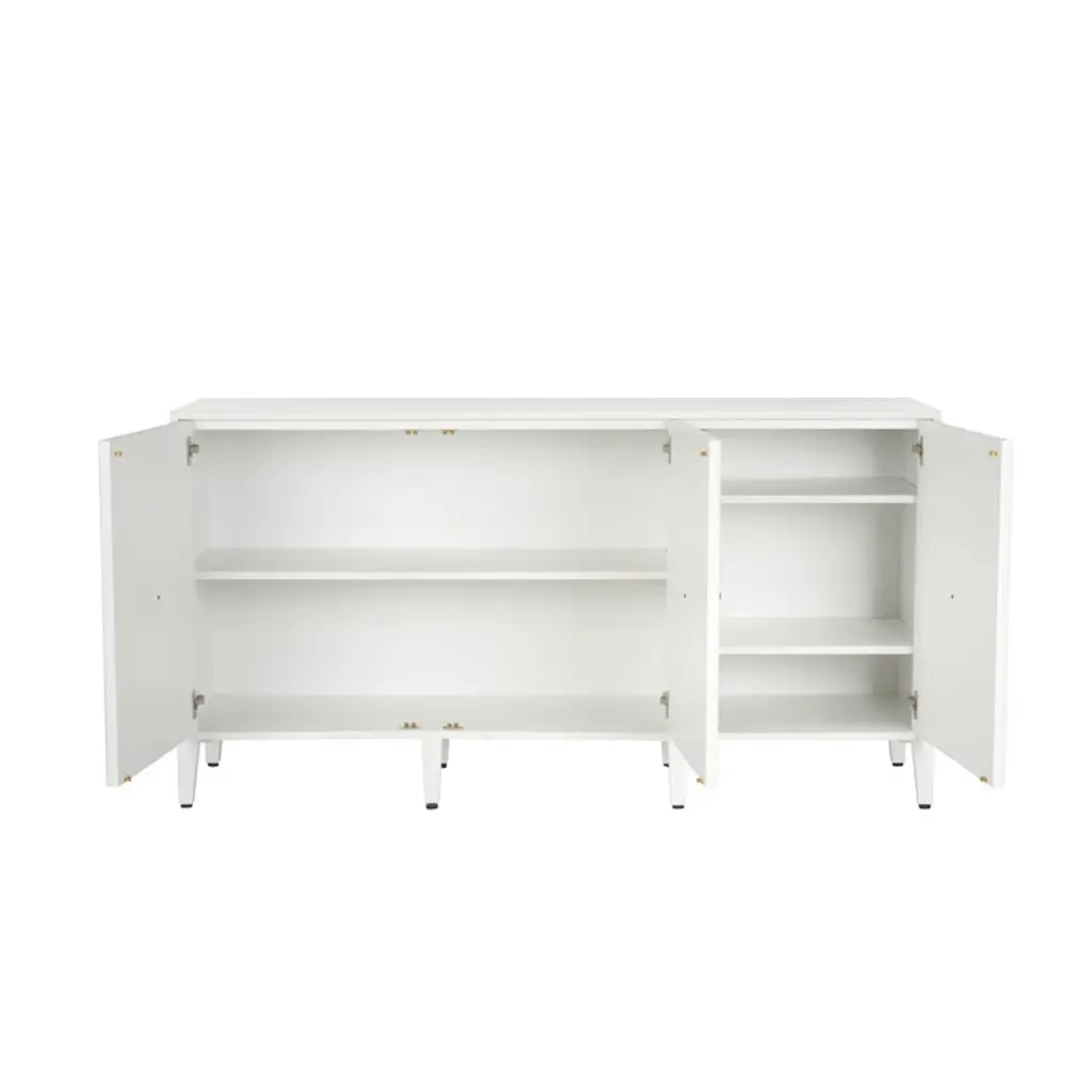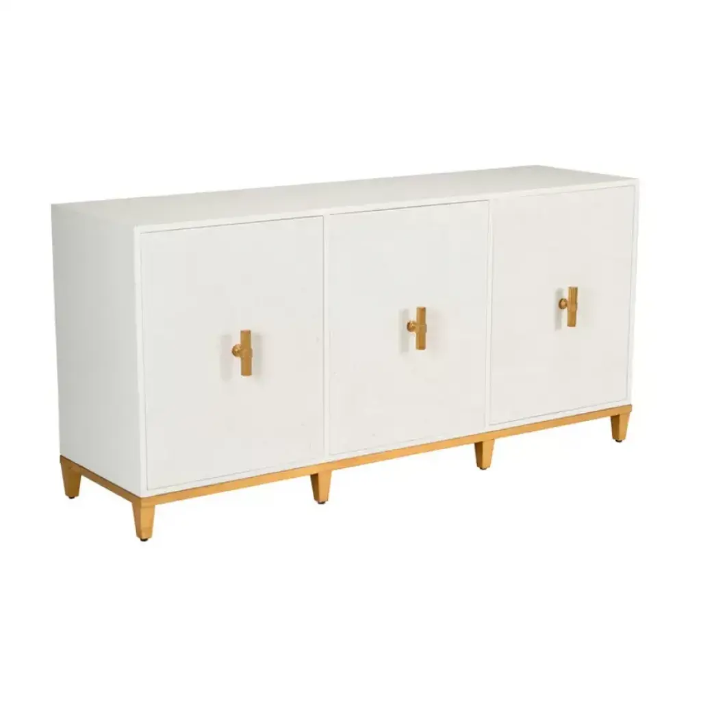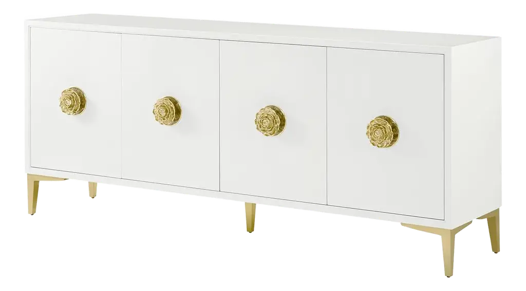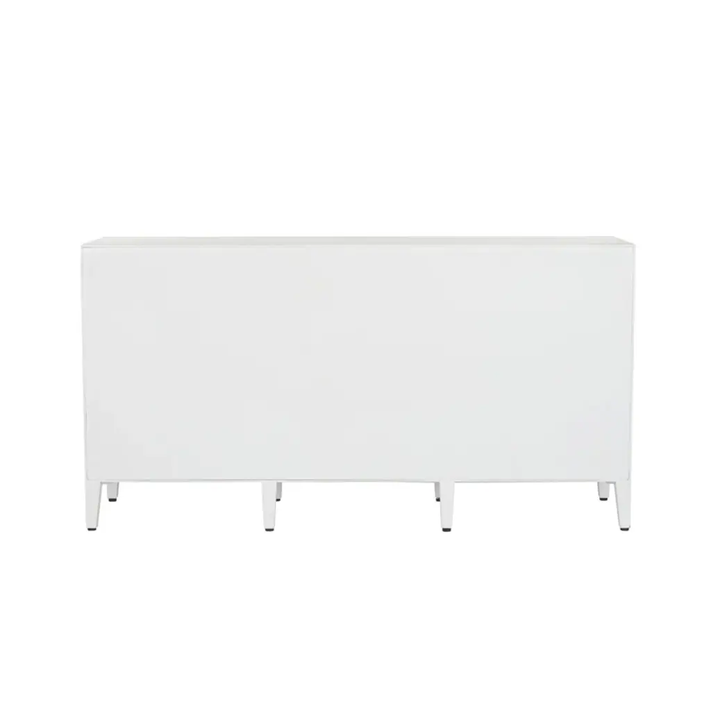 Designed for both style and functionality, the Burns Credenza offers ample storage space for your dining essentials. With multiple shelves it provides organization without compromising on aesthetic appeal, making it perfect for both formal dining rooms and casual entertaining spaces. The reeded wood detailing on the facade adds a captivating texture, and the aged brass hardware brings a touch of vintage-inspired glamour. Designed by Elizabeth Wicker.