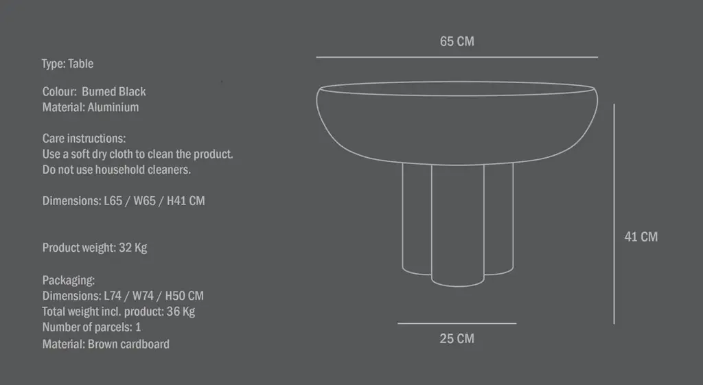 Burnt black coffee table, end of sofa model Crown, design coffee table in aluminium, contemporary work.The Crown coffee table is made from aluminium in the style of a contemporary sculpture. The table is available in two sizes and can be used as a single coffee table or stand together as a pair of coffee tables.A contemporary creation of fine quality.Colour: Burnt blackMaterial : AluminiumDimensions: L: 65 cm, W: 65 cm, H: 41 cmProduct weight : 32 kg