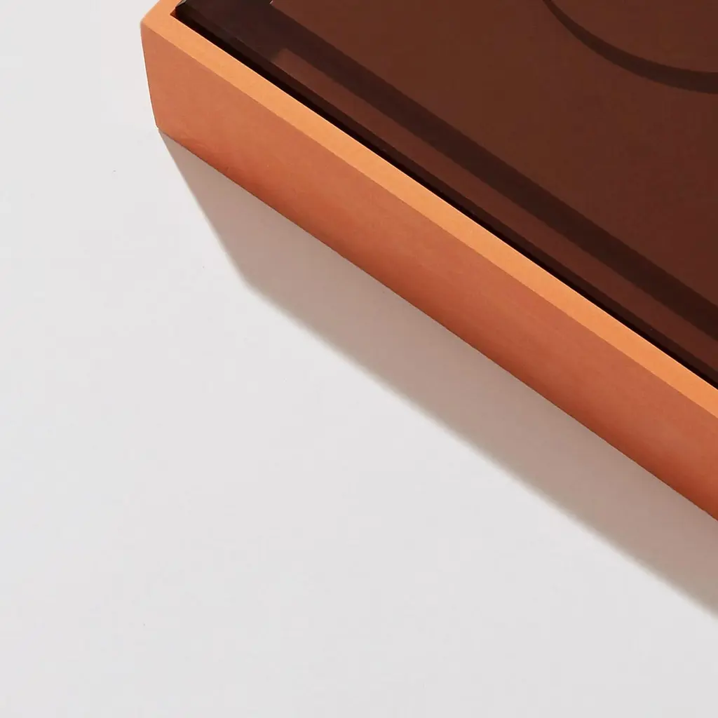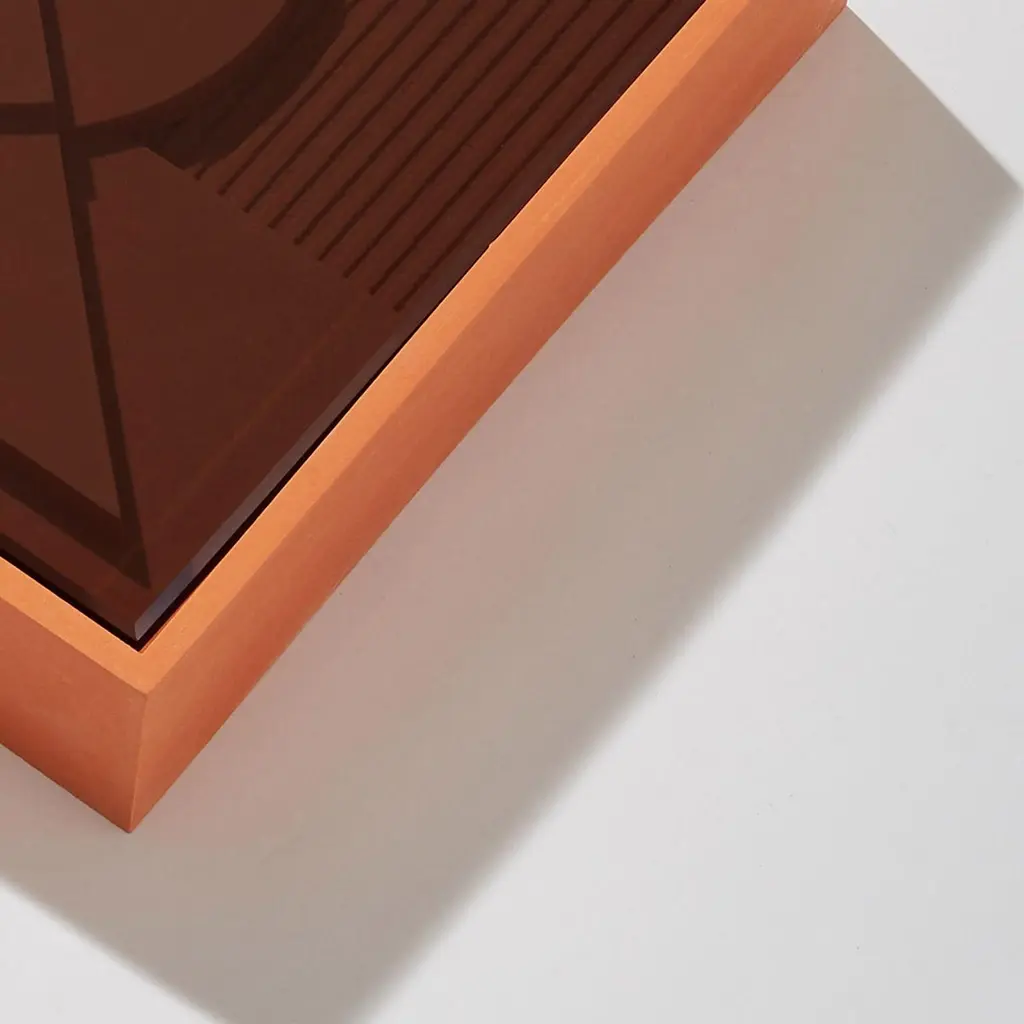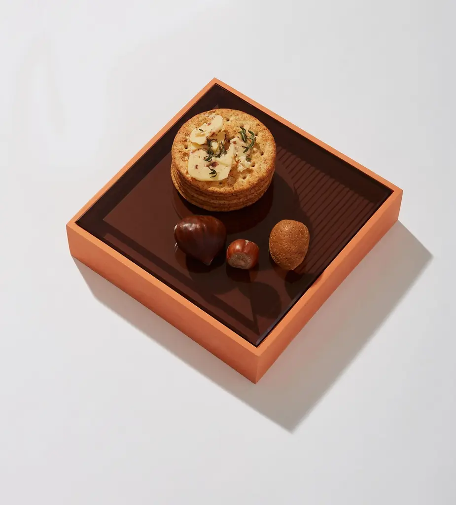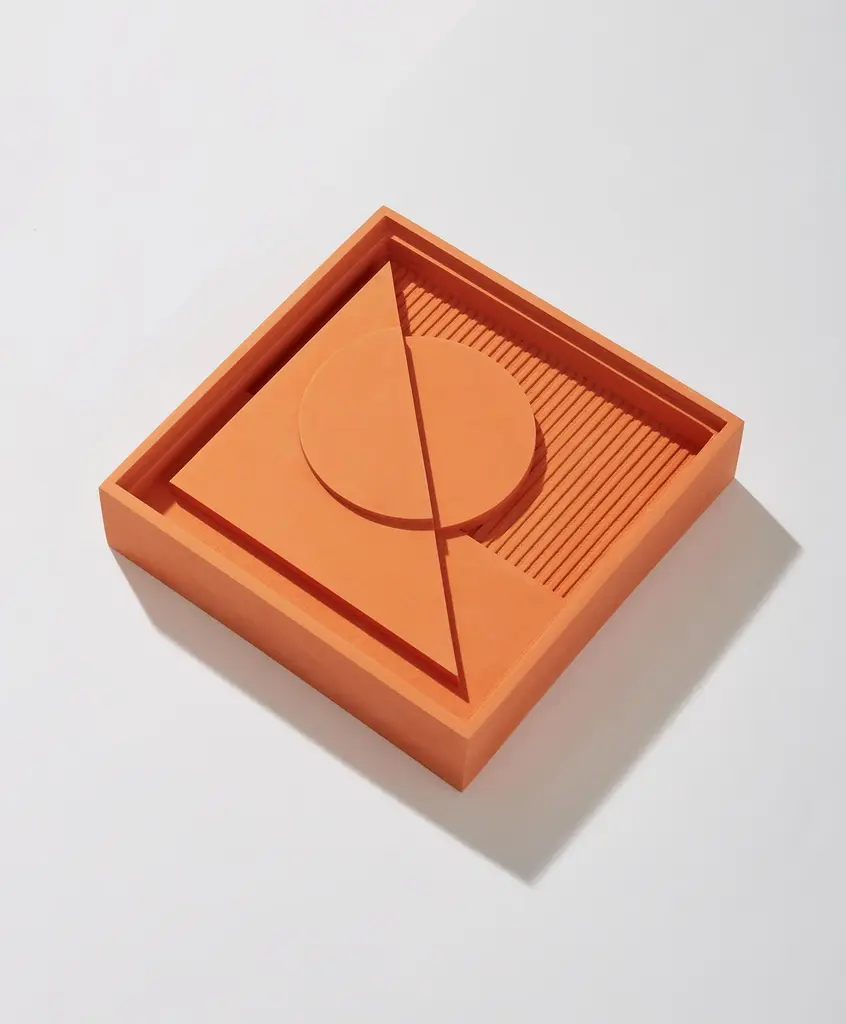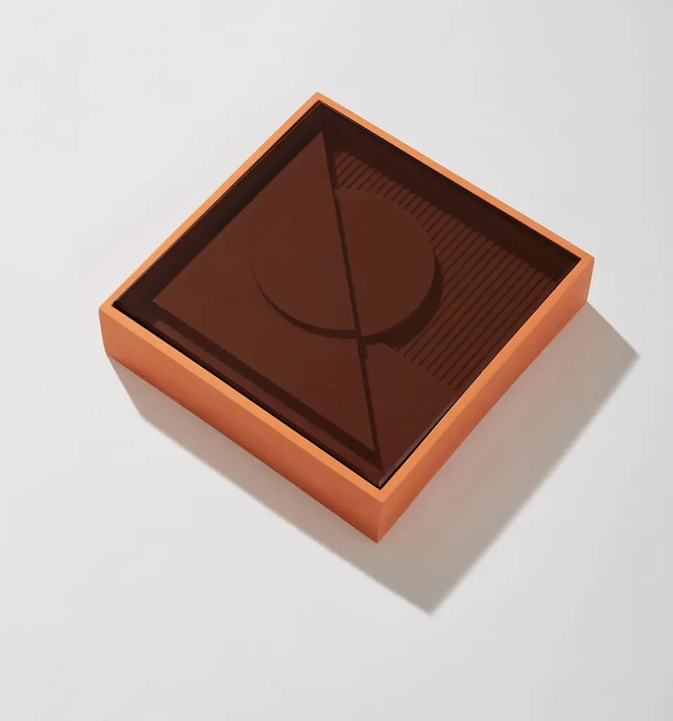 Burnt orange square under the surface by Theodora Alfredsdottir.Unique.Materials: jesmonite, glass top.Dimensions: 160 x 160 x 50 mm.Theodora Alfredsdottir is a product design studio based in London. Theodora is an Icelandic product designer. She holds a bachelor’s degree in product design from the Iceland Academy of the Arts (2012) and a master’s degree in Design Products from the Royal College of Art in London (2015).Storytelling through objects; Theodora’s work revolves around the narrative an object can inhabit and exploring ways of objectifying that narrative. She's interested in the way an object can act as documentation of its manufacturing process; a record of what went on between the machine, tools, craftsman and Material as well as it can communicate its origin and former life. In short, the object creates its own factual narrative. That often leads to the discovery of unexpected qualities as well as it gives the user a subtle opportunity to reconsider our Material world and explore value in a different way.