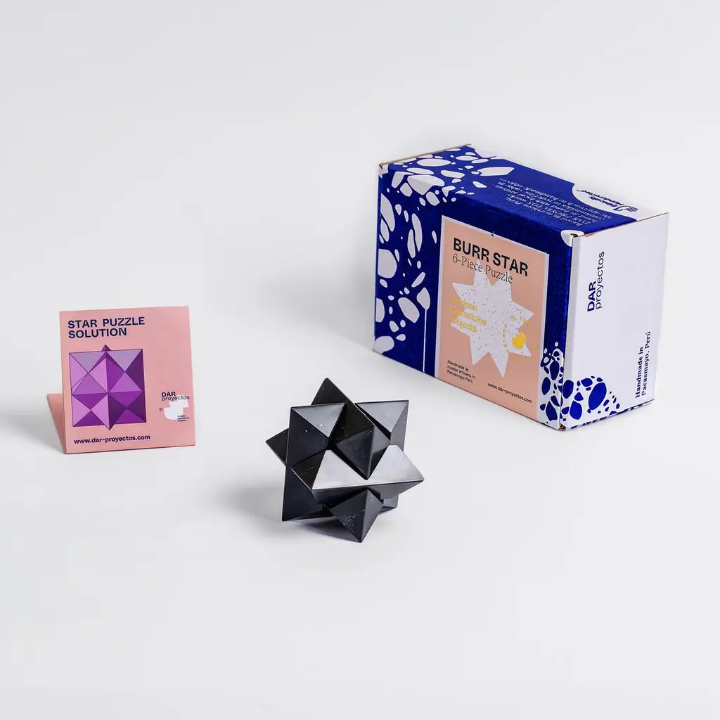 Feel texture, weight, and form with this onyx puzzle: design you can experience.The burr puzzle is of mysterious origin, first seen engraved on the cover of Chambers's Cyclopaedia. A captivating three-dimensional creation crafted from interlocking notched sticks. Named with reference to the finished shape resembling a burr seed, DAR Proyectos' version of the puzzle is handmade in semi-precious onyx. The 6 piece star shaped puzzle forms a complex and striking object when not in use, puzzling any guest sitting around the your coffee table.Dimension: 2.5 x 2.5 x 2.5 inWeight: 0.8 LbMaterial: OnyxEach piece is carved from banded onyx, a striking quartz-based mineral, which features striated patterns ranging from white to cafe in tone - no two stones are exactly alike. The stone is a metamorphic stone from the Arequipan Andes of Perú. This protective stone is associated with a grounding energy, dispelling negative energy and offering motivation and preserverance. Handmade in Peru by DAR Proyectos.