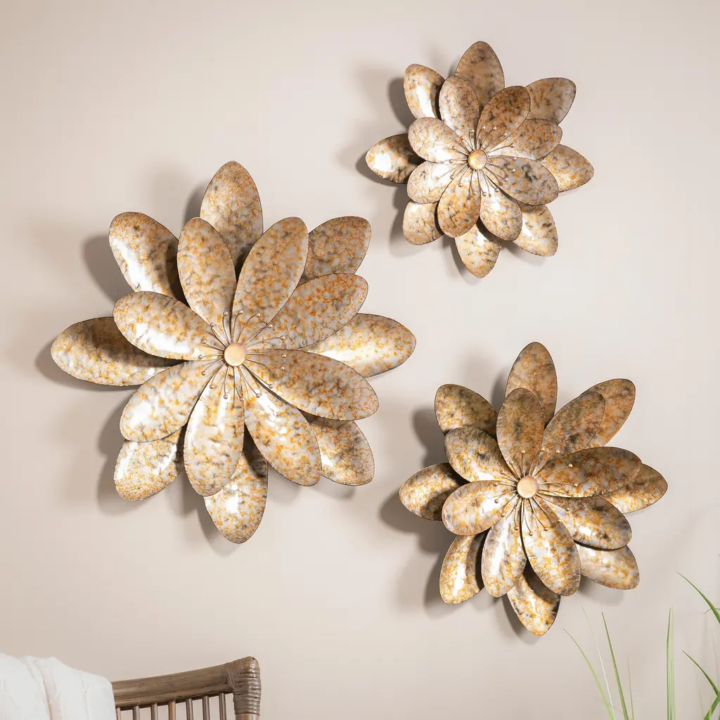 Highlight your love for modern art pieces with this three piece Burst wall decor set. The starburst-inspired design stands out on any wall thanks to the shiny satin gold finish, smooth medallions in the center, and leaf-like tips on the edges for accent.