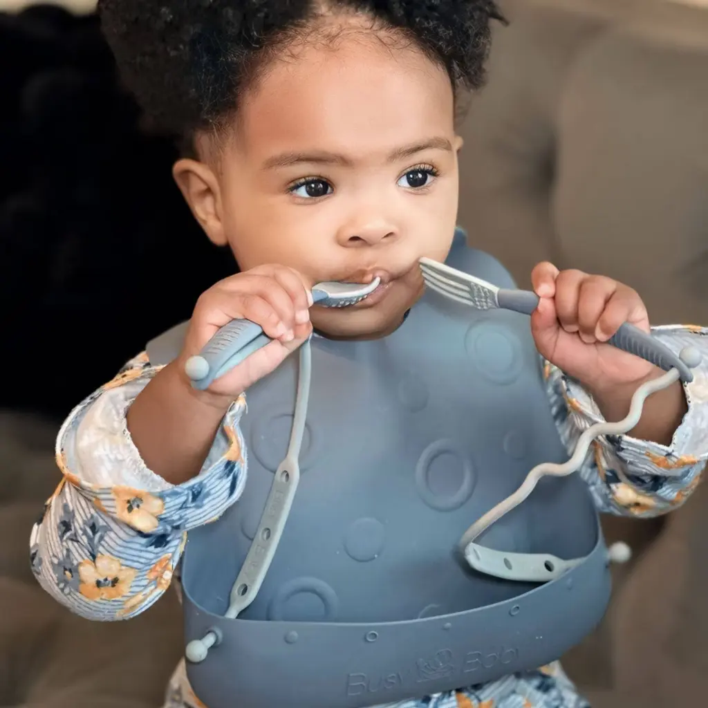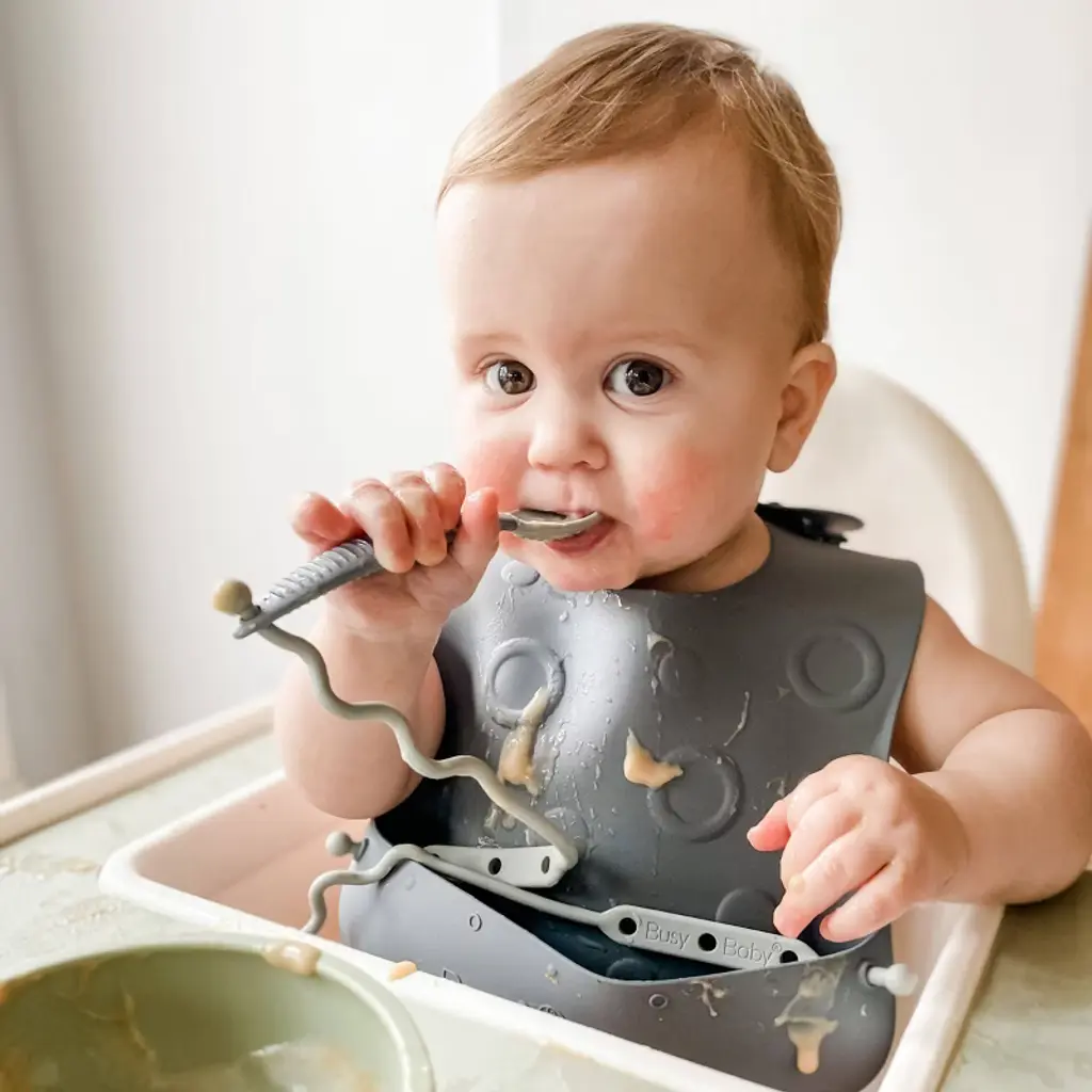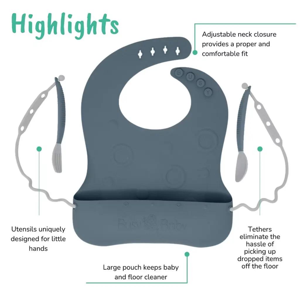 The Busy Baby Stop-Drop Bungee Bib Set is much more than an average bib. This set includes a bib with oversized pouch, two tethers and three baby-friendly utensils that all work together to keep messes contained and utensils attached. Made of 100% food-grade silicone, this set is safe, durable and easy to clean. The lightweight, flexible material and adjustable neck closure provide a gentle and comfortable fit for baby. A wide, deep pocket catches food and drips and the adjustable tethers secure toys, pacifiers and utensils to prevent them from falling to the floor and getting dirty. The whole set rolls up and secures shut for easy at-home storage or on-the-go transport - perfect for eating out, running errands, or simply snacking outside. Invented by a busy mom and praised for convenience and practicality, the Stop-Drop Travel Bib Set provides everything needed for a convenient and cleaner transition to solid foods and independent mealtime. Meets CPSC Safety Requirements for safe eating and playing.