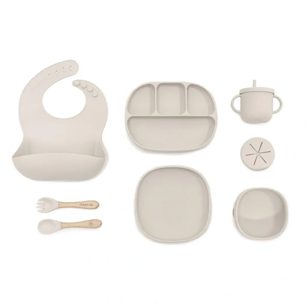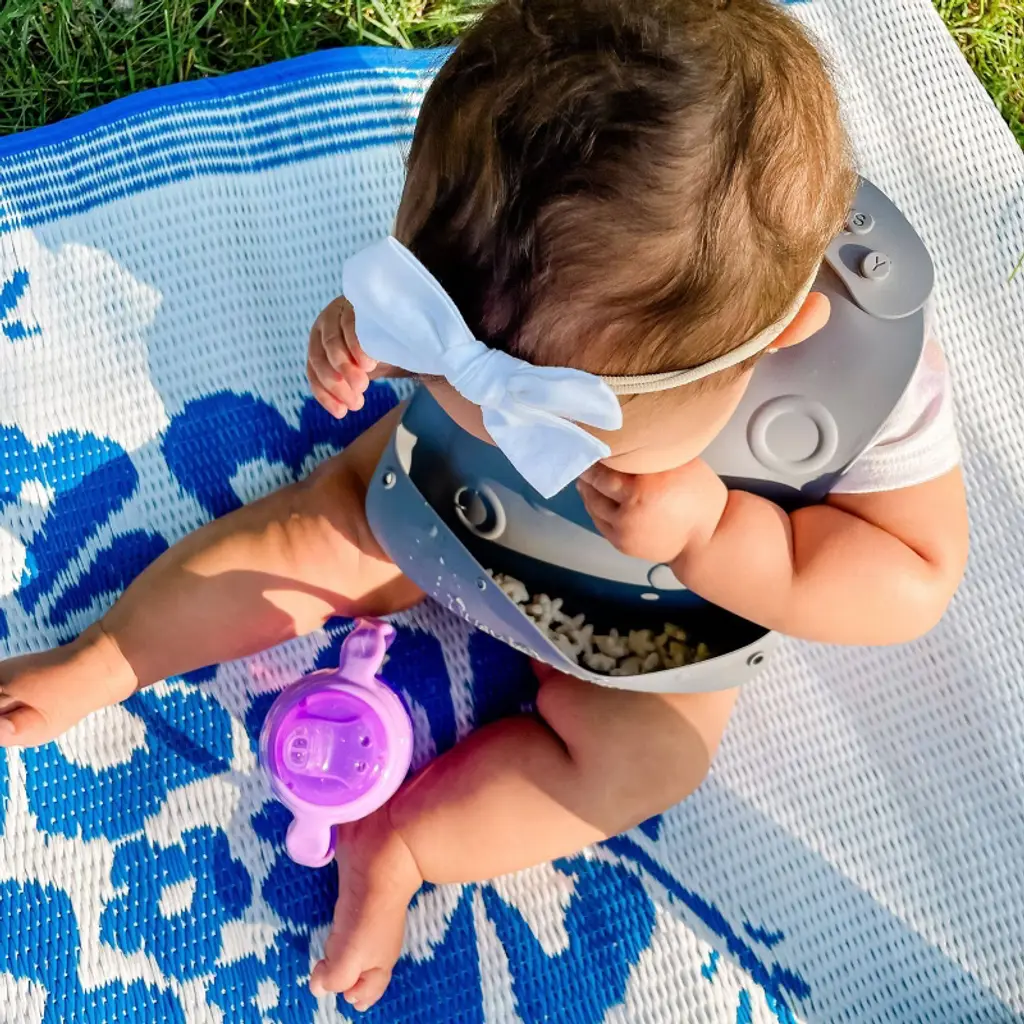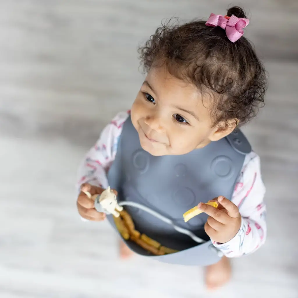 The Busy Baby Stop-Drop Bungee Bib Set is much more than an average bib. This set includes a bib with oversized pouch, two tethers and three baby-friendly utensils that all work together to keep messes contained and utensils attached. Made of 100% food-grade silicone, this set is safe, durable and easy to clean. The lightweight, flexible material and adjustable neck closure provide a gentle and comfortable fit for baby. A wide, deep pocket catches food and drips and the adjustable tethers secure toys, pacifiers and utensils to prevent them from falling to the floor and getting dirty. The whole set rolls up and secures shut for easy at-home storage or on-the-go transport - perfect for eating out, running errands, or simply snacking outside. Invented by a busy mom and praised for convenience and practicality, the Stop-Drop Travel Bib Set provides everything needed for a convenient and cleaner transition to solid foods and independent mealtime. Meets CPSC Safety Requirements for safe eating and playing.
