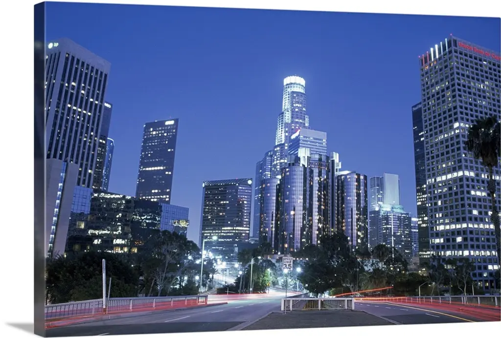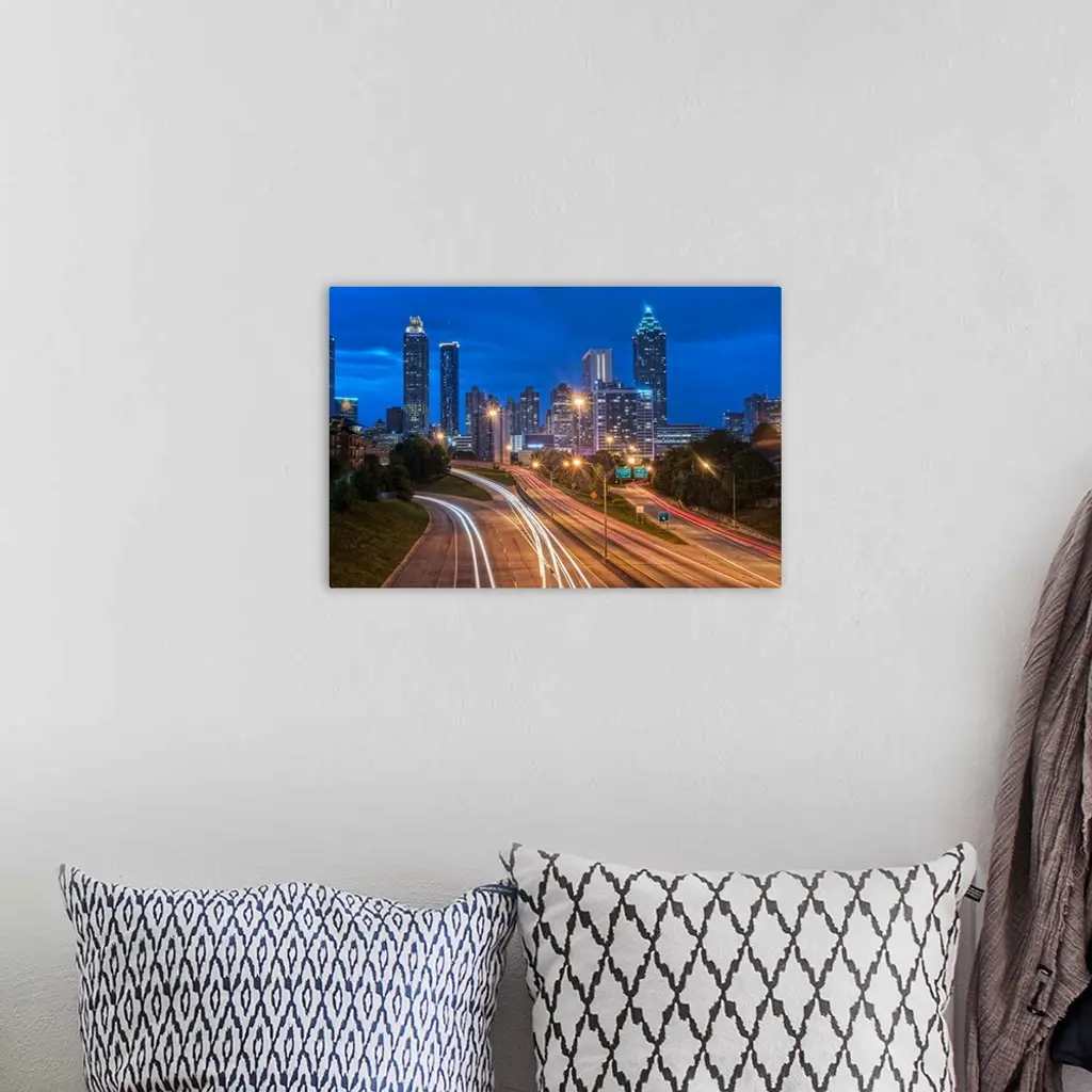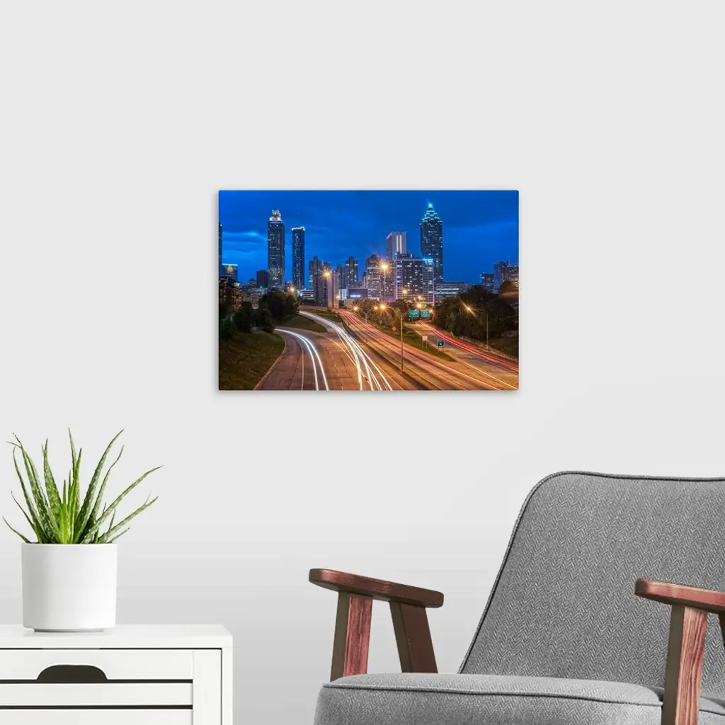 Bright light trails from traffic on the freeway, headed towards the Atlanta, Georgia skyline at twilight.