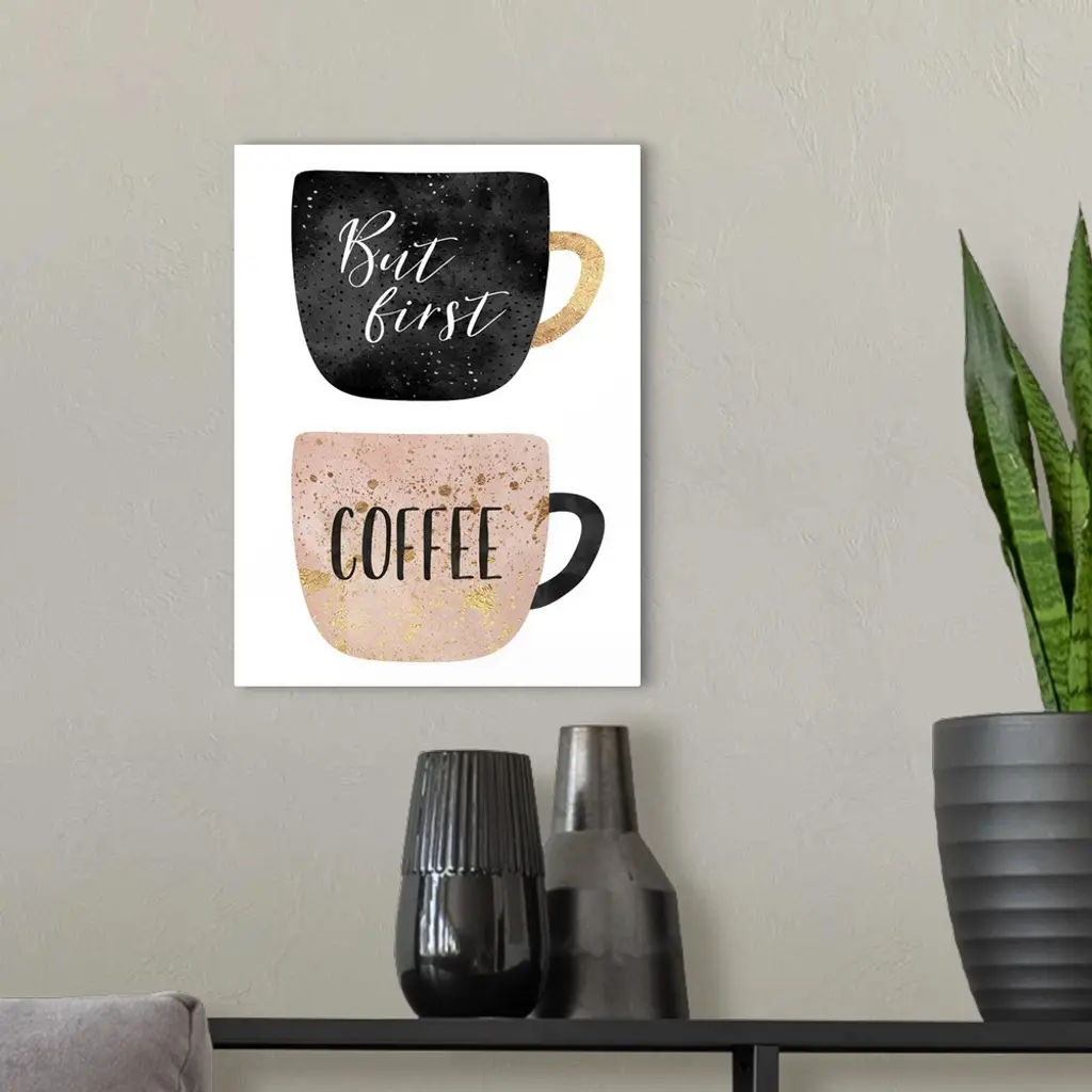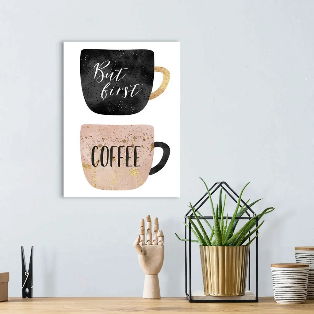 Two mugs, with the words 'But First, Coffee' in shades of rose gold, black and gold on a white background.