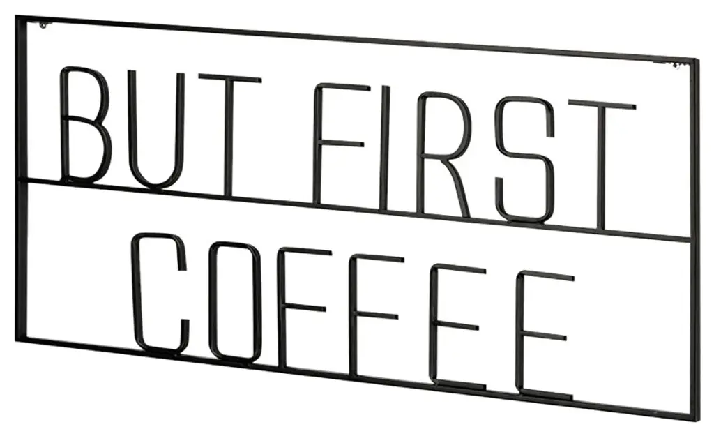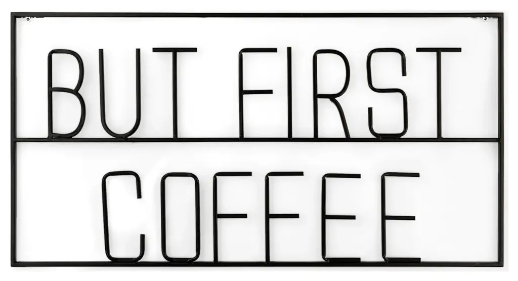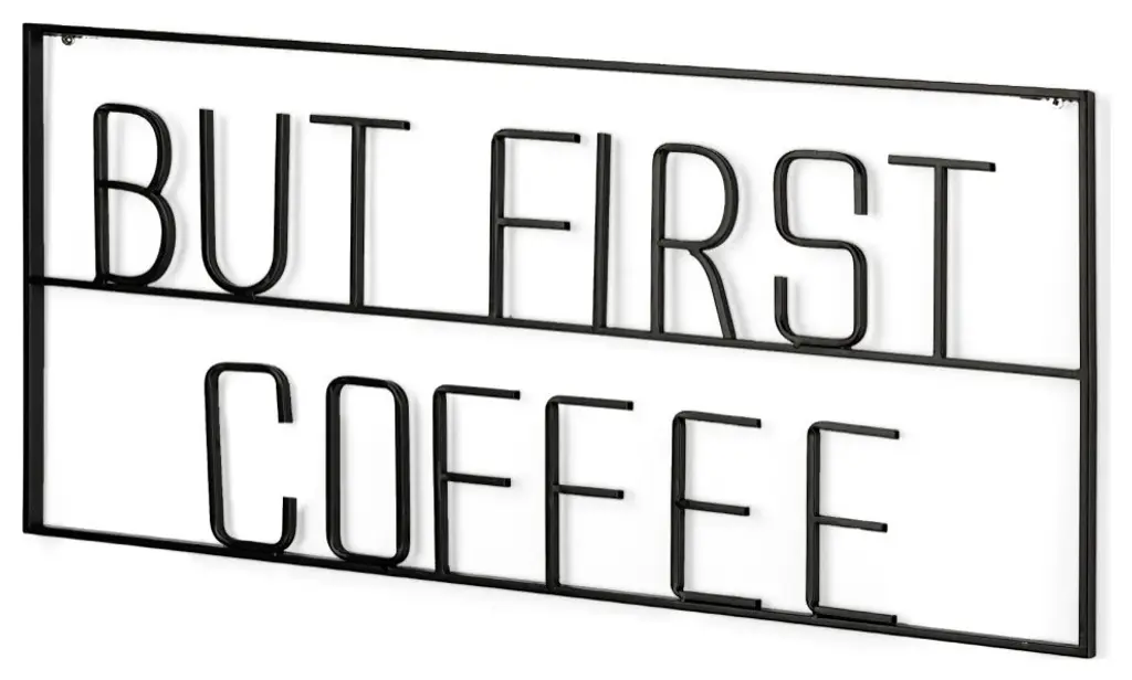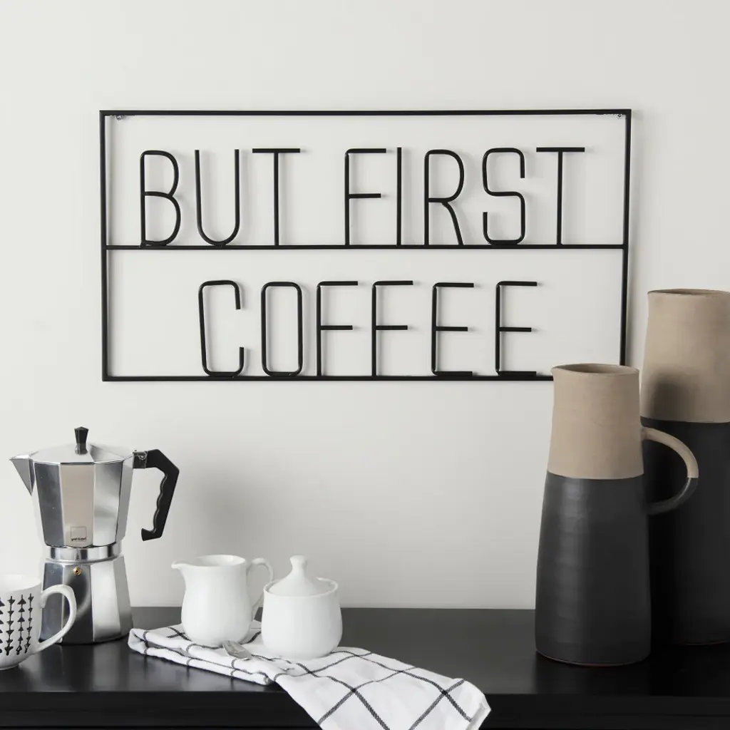 Create inspiring walls with this metal, cut-out quote.26.0" Long Wall SignA decorative piece of wall art measuring 26.0"L x 0.5"W x 13.4"H. Metal ConstructionThis typography wall sign features cut-out, metal lettering with the words "œBUT FIRST COFFEE"� "“ because a coffee a day keeps the grumpy away! Black FinishA simple, matte black finish let"™s the words do all the talking. InspirationalEverybody loves a good quote! Whether memorable, motivating, relevant, or welcoming, they serve as great pick-me-ups when incorporated into interiors. Versatile StyleIts simple style works across a number of design styles, but pairs especially well with farmhouse homes that are warm and approachable.
