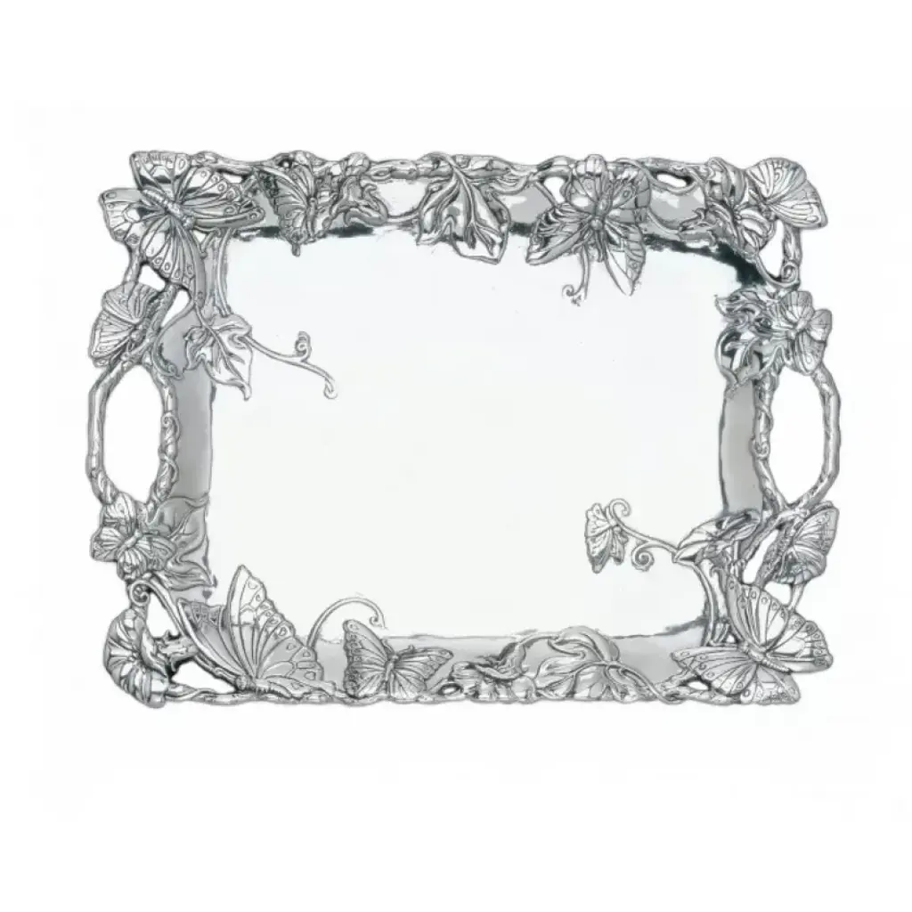 House keys, glasses or other valuables inside the vibrant garden of Arthur Court's Butterfly Catch All. Majestic butterflies and veiny leaves cover the sides of this piece as twisting vines create its textured rim. The unblemished interior of this handmade, aluminum dish gleams against the detailed designs surrounding it.