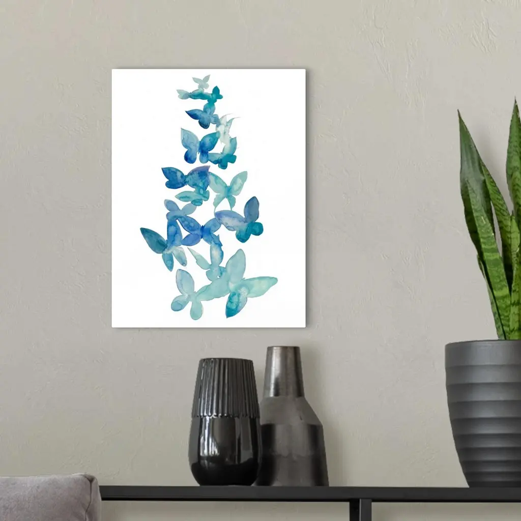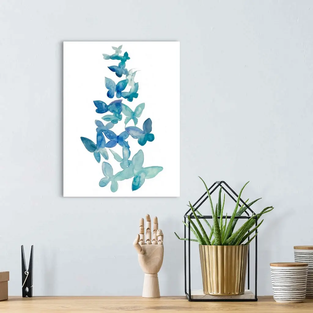 Blue watercolor butterflies ascending against a white background.