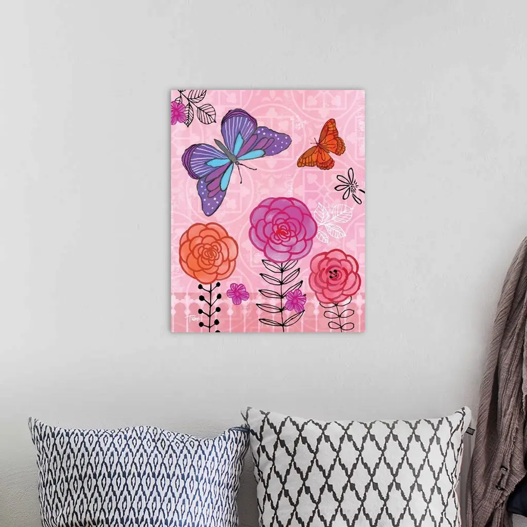 Whimsy illustration of butterflies and flowers on a light pink patterned background.