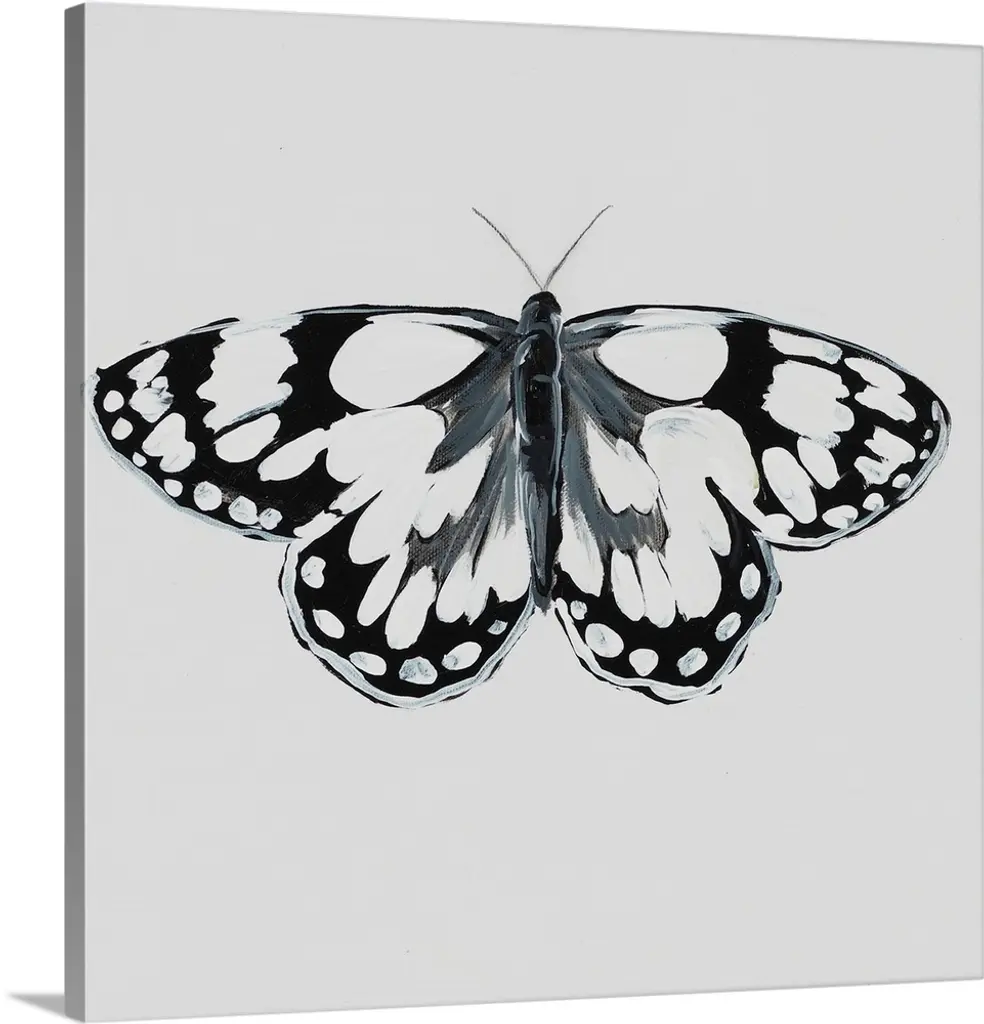 Illustration of a blue, gray, black, and white butterfly on a white background.