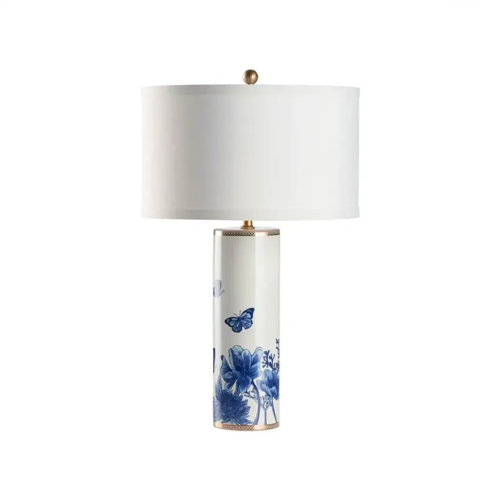 This blue and white ceramic lamp showcases a delicate floral and butterfly design, evoking timeless charm and elegance. Accented with graceful gold bands at the top and bottom, it blends classic artistry with a touch of luxury. Designed by Lisa Kahn.