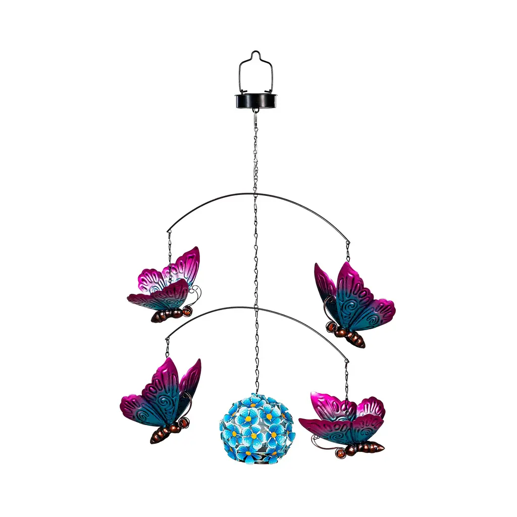 Beautify any space with this charming hanging mobile. The sweet design brings a joyful look to any space with its bright butterfly accents. Durable construction with high-quality materials ensures they will last season after season. The solar lights glow at night. Perfect for any spot in need of some cheer. Hang them in the garden, yard, or on the porch to show them off. They make a great gift for anyone looking to update their garden décor. They require one AAA Ni-MH battery, included and they're adapter compatible.