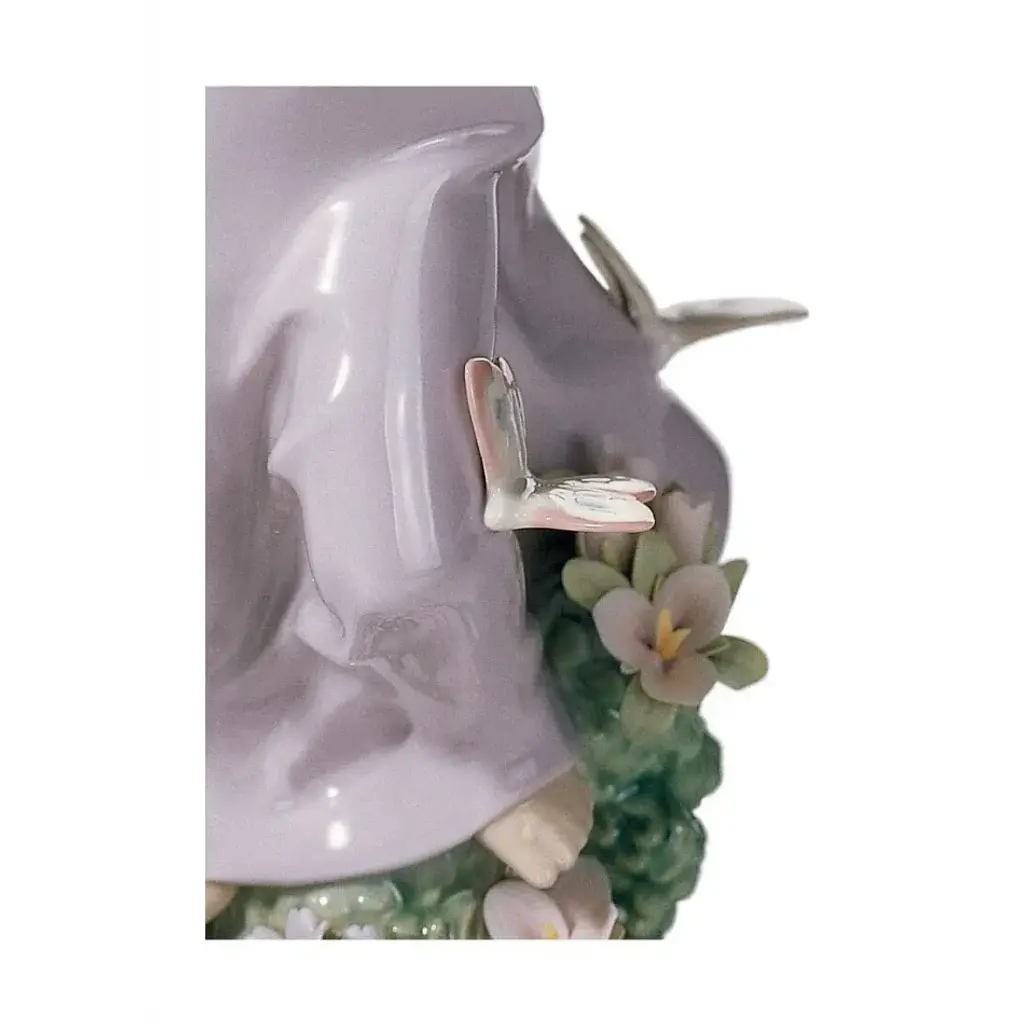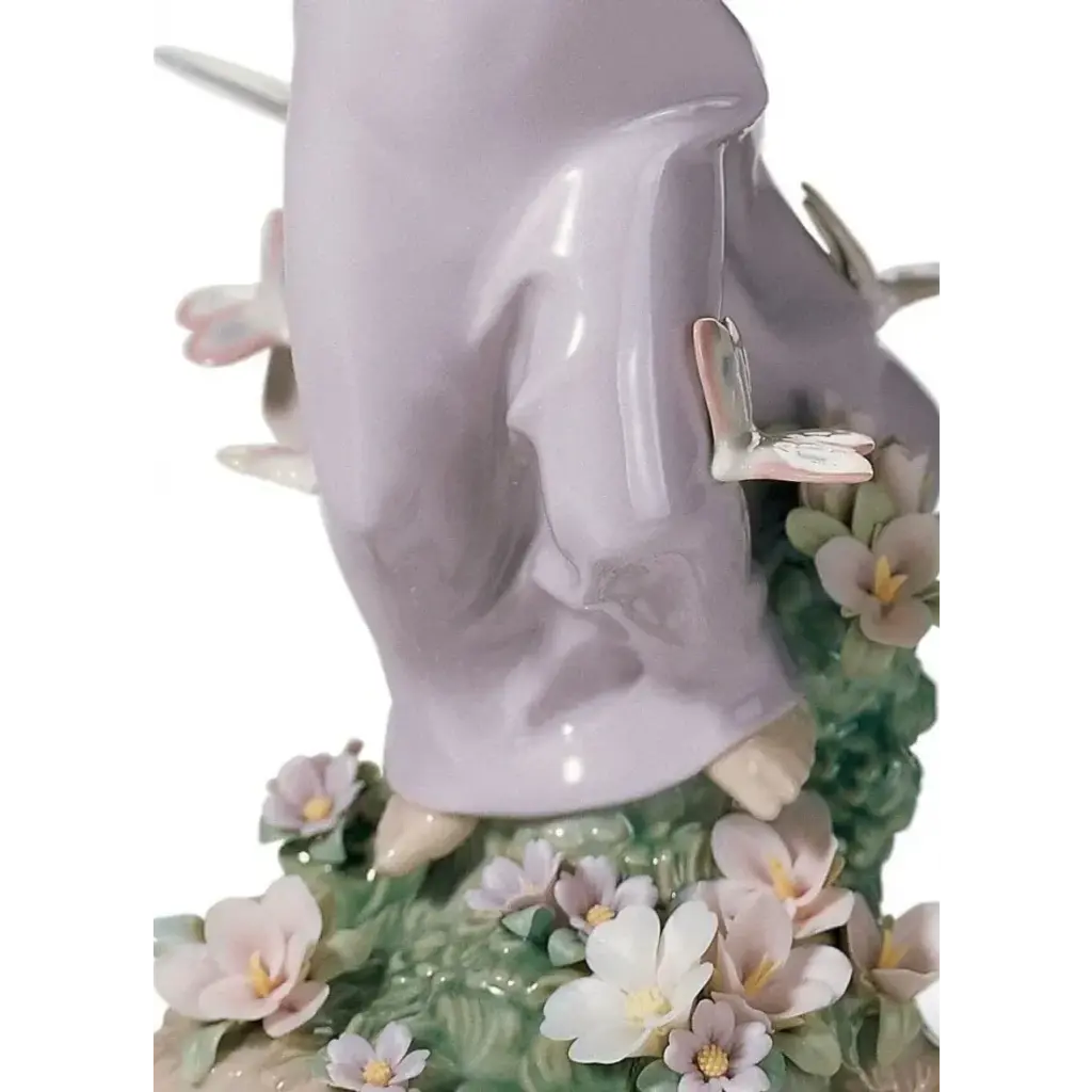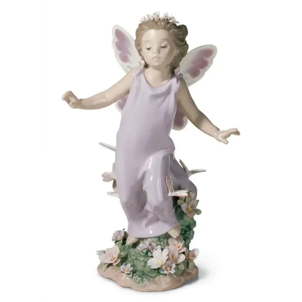 Glossy porcelain girl figurine with butterfly wings strolling through the forest full of flowers and butterflies. An iconic Spanish brand, Lladro is a world leader in the creation of porcelain art. Started by brothers Juan, Jose and Vicente Lladro in 1953, the ceramic figurines were initially inspired by the works of great European manufacturers like Meissen and Sevres. Over time, a unique style was forged, consisting of elongated lines, a revolutionary single-firing method, and soft pastel tones.