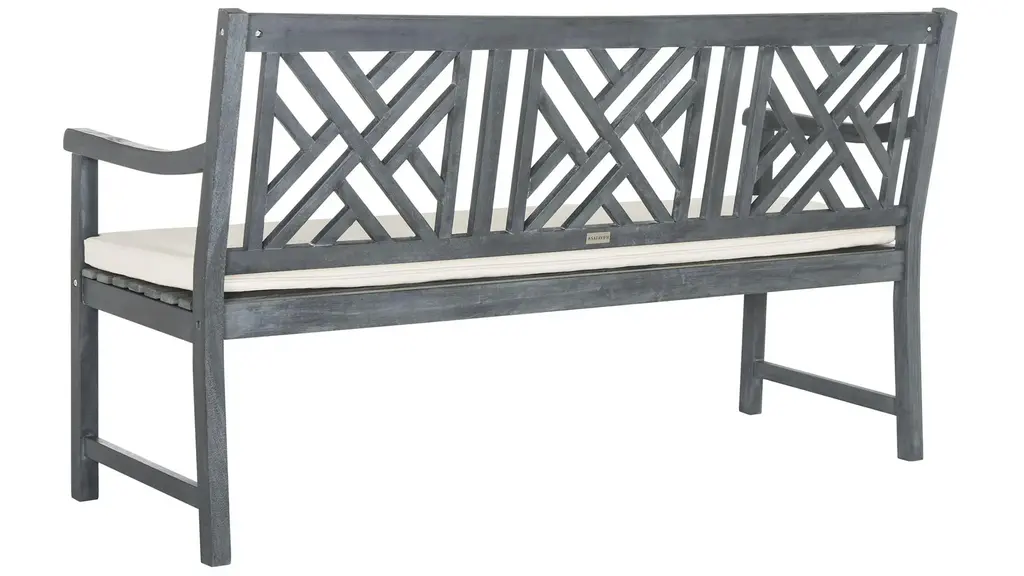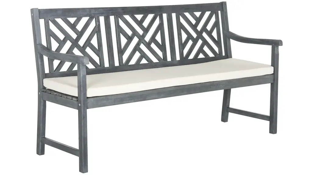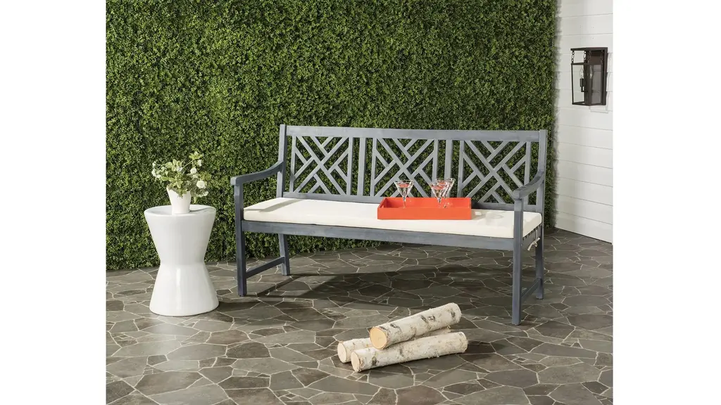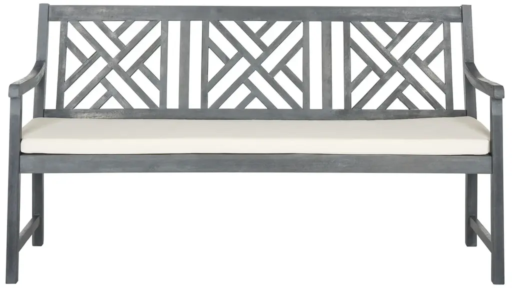 Inspired by furnishings in the regal gardens that surround Newport's Gilded Age mansions, the Button 3 seat outdoor bench is a classic. Its traditional geometric design is highlighted by an ash gray finish and welcoming beige cushion.