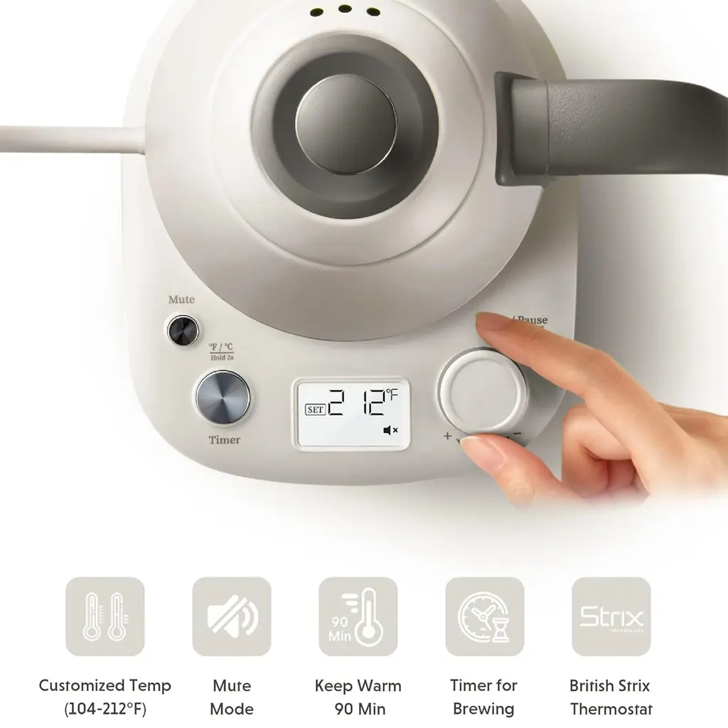 Introducing our advanced Electric Gooseneck Kettle, meticulously designed to enhance your using experience with convenience and versatility: 0.8L Capacity: This pour-over coffee kettle boasts a compact 0.8-liter capacity, perfect for brewing single servings or small batches of your favorite coffee...Precise Temperature Control: Enjoy full control over your brewing process with precise temperature control,, allowing you to set temperatures within the range of 40 to 100°C(104-212°F temp range). This ensures optimal extraction of flavors from your coffee grounds, resulting in a rich and aromatic cup every time.Automatic Warm-Keeping Function: Say goodbye to lukewarm coffee. The automatic warm-keeping function maintains the desired temperature of your brewed coffee, ensuring it stays hot and ready to enjoy whenever you're ready for your next cup.LED Display Screen: The built-in LED display screen provides clear and intuitive feedback, allowing you to easily monitor and adjust the temperature settings according to your preferences.Gooseneck Design for Precise Pouring: The gooseneck spout design offers precise control over the flow rate of water, enabling you to achieve the perfect pour-over technique. Whether you're brewing delicate pour-over coffee or tea, this design ensures a steady and controlled stream of water for consistent results.304 Pro-Grade Stainless Steel Body: Crafted from high-quality 304 pro-grade stainless steel, this kettle combines durability with a sleek and modern aesthetic. The stainless steel body not only ensures longevity but also provides excellent heat retention properties, keeping your water at the desired temperature throughout the brewing process.