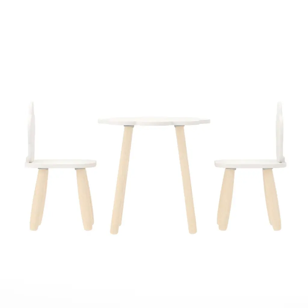 Playtime and snack time for your little one will be made both captivating and comfortable with this three-piece table and chairs set. This eye-catching set is adaptable to most design schemes and features curved, cloud-shaped seat backs and tabletop as well as rounded seats that lend serenity to any space for a light but cozy environment your child will love. Perfect for the bedroom, playroom or other small spaces around the home, this set boasts exceptional versatility that your young one can utilize while playing, drawing, reading, or enjoying a snack. In addition to putting the “fun” in “functional”, this set also has the sturdy structure parents will appreciate from the tabletops beautifully crafted from engineered wood to the chairs' seats and backs and gently flared legs on each piece built from solid wood for stability and dependability. Assembly is quick and easy, typically taking under five minutes. Upkeep is just as simple by using a dry cloth to wipe clean. Available in appealing color schemes, finding the perfect style for your child’s room is simple. Bring a cheerful, immersive experience to your child’s space with this table and two chairs set
