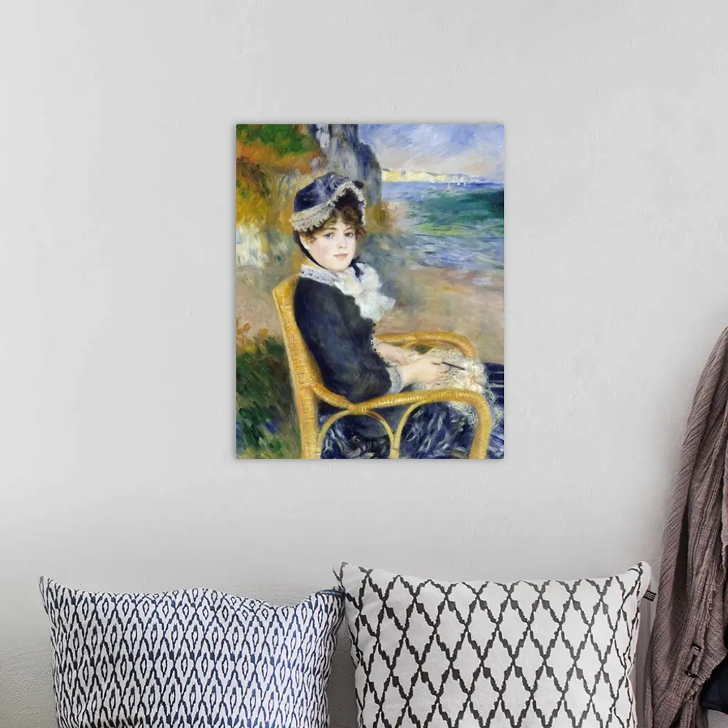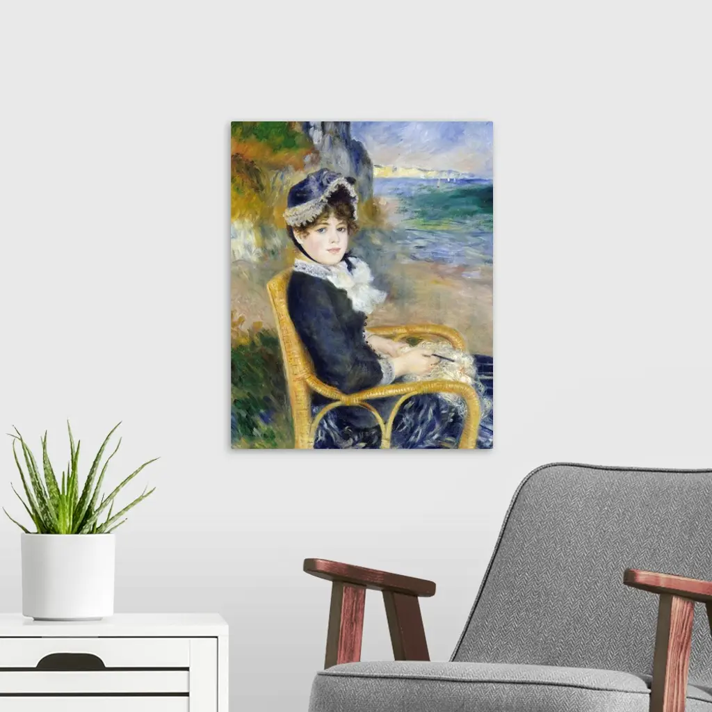 Renoir likely painted this work in his studio, posing his model and future wife, Aline Charigot, in a wicker chair. The beach behind her probably represents the Normandy coast near Dieppe. This canvas reflects the impact of Renoir's trip to Italy in 1881-82, which inspired him to unite the grandeur and simplicity he admired in Renaissance art with the luminosity of Impressionism. His new approach, which he called his dry manner, is evident in Aline's face, with its carefully drawn features and smooth handling of paint. The medley of quick strokes in the background, however, displays the freer technique of Renoir's earlier years.
