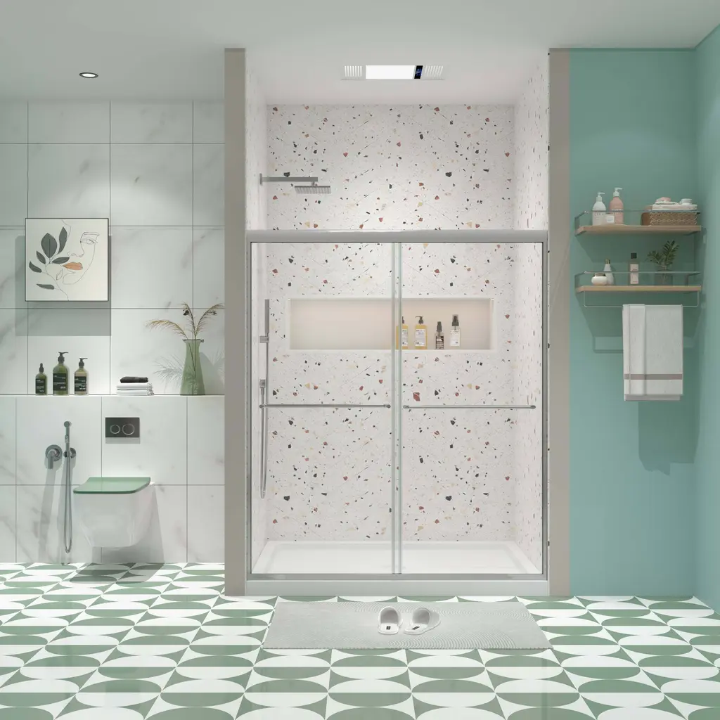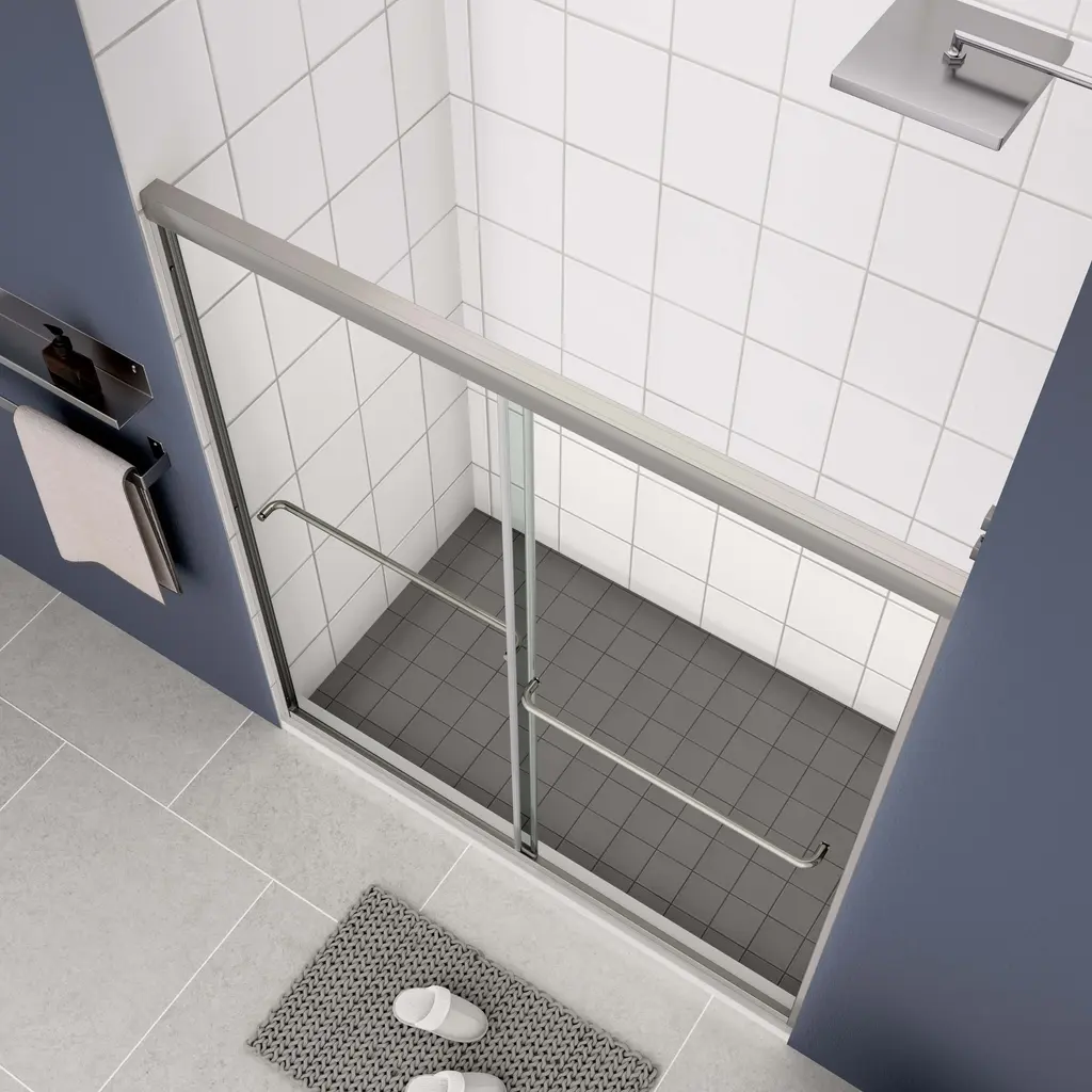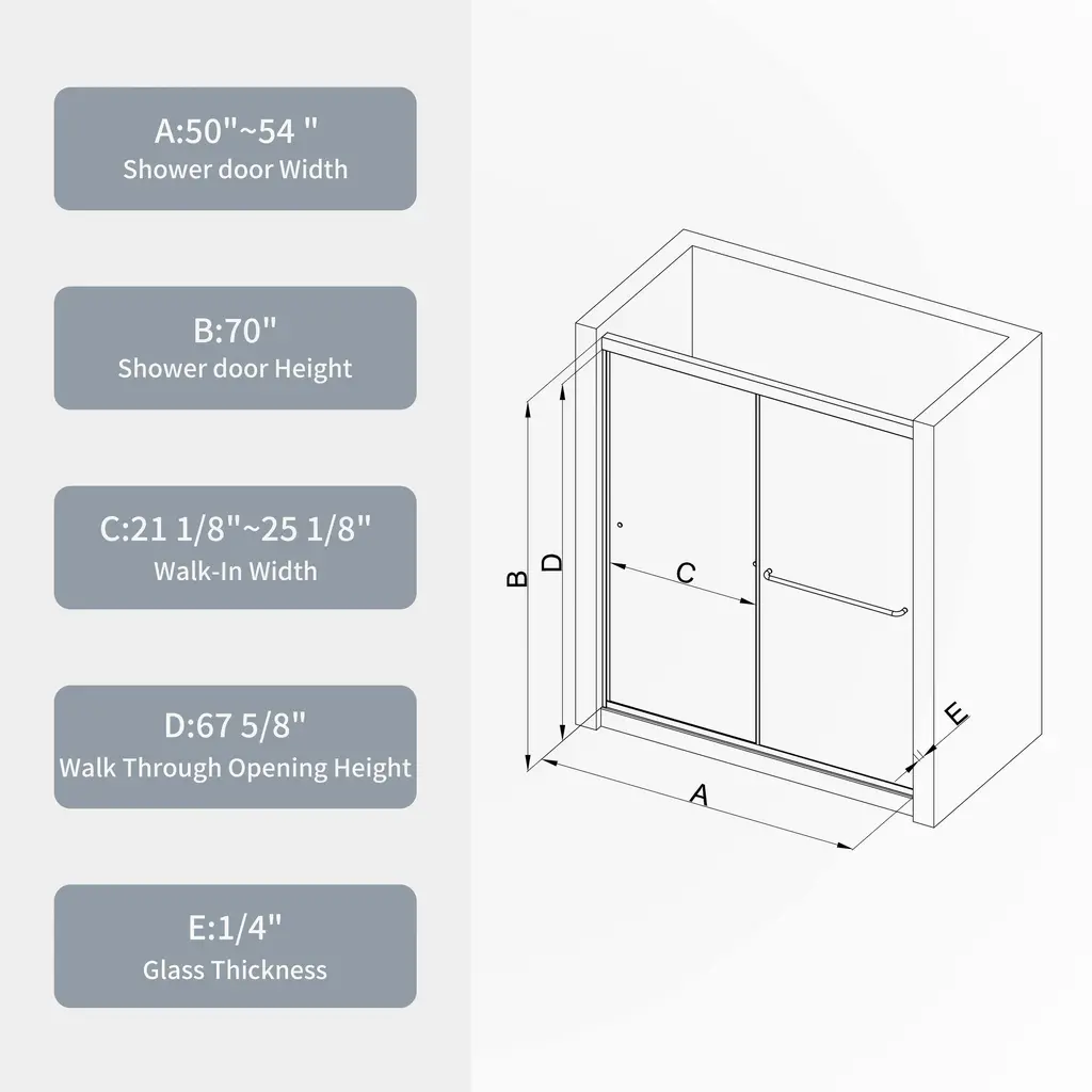 【Product Features】 ★Alu top track with high quality #304 stainless steel handle, with 36000 times open and close test. ★SGCC 1/4" tempered clear glass with Nano eacy clean treatment and anti-explode film, cleaning become easy. and safe. ★Smooth and comfortable sliding system ★Good anti-leakage function. ★Frame with good anti-collision, easy install. Double sliding door 【Description】 [Bypass shower door Left and Right opening] W: 50"-54" H: 70" 1/4" tempered glass Stainless steel handle 22.7" Easy install system Each clean up glass treatment Roller with 36000 times open and close test. 【This product is fragile, if there is any damage when you receive the goods, please take a photo and contact us, so that we can quickly verify and deal with you】 【Notes】 1.Size Notice:Manual measurement has been used, there may be some reasonable errort, thanks for your understanding. 2.Color Notice:Due to factors such as display equipment and shooting environment, the color of the item may be slightly different from the picture, which is a normal phenomenon, please refer to the actual item 3.Assembly Notice:Please read assemble manual in advance. Please do not over-tighten nuts, as this may cause distortion or breakage. 4.It is recommended to put a layer of foam or soft cushion on the floor when installing to avoid scratching the floor. 5.If the item has any defects, damage or missing parts, please contact us with pictures or videos so that we can understand your needs and help you quickly, and always remember to retain its original packaging to ensure any return requests. We will try our best to solve any problems you may have. 6.If you receive the wrong product, please attach the product picture, the infographic of the outer package and the picture containing SKUs, so that we can verify and quickly deal with it for you