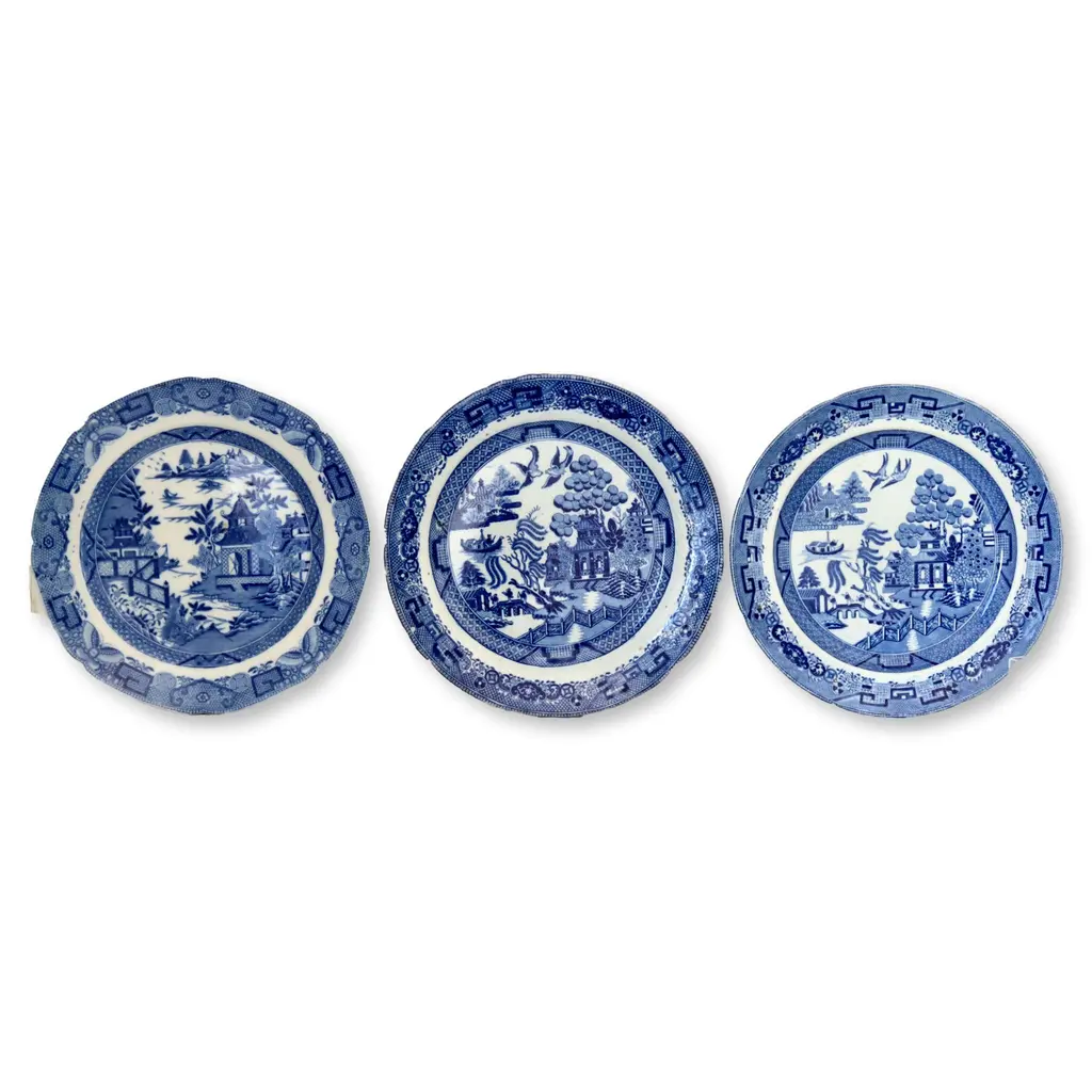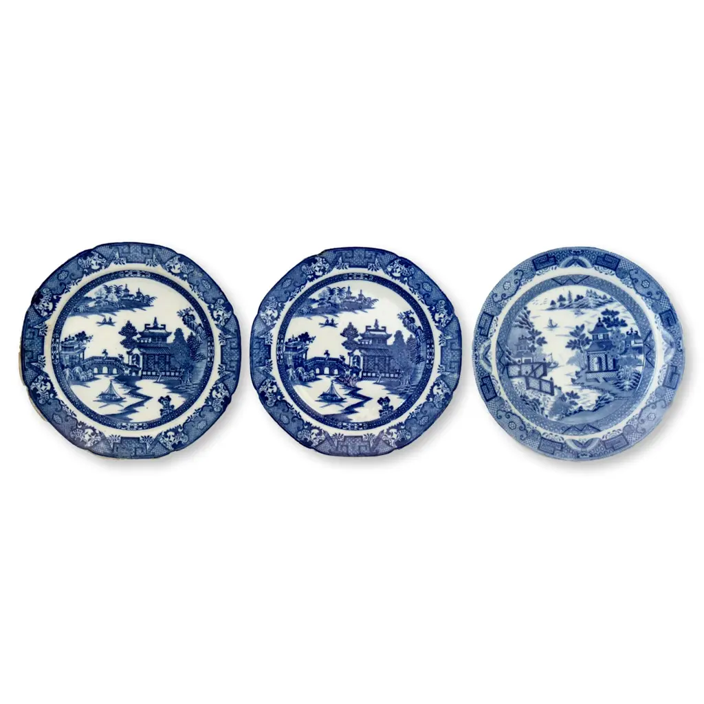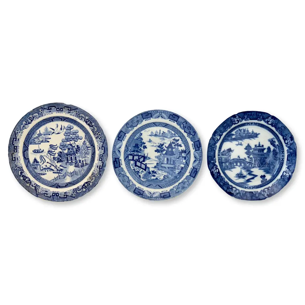 Curated collection of nine antique English Willow variant plates dating to 1805-1815. They are highly collectible patterns and makers and are from the estate of an early Staffordshire pottery collector. Some still retain the collector's info on dates, origin, maker, etc. They will arrive with plate hangers, however they would also display beautifully on a large hutch. They are all normal dinner size, 9-10" Diameter