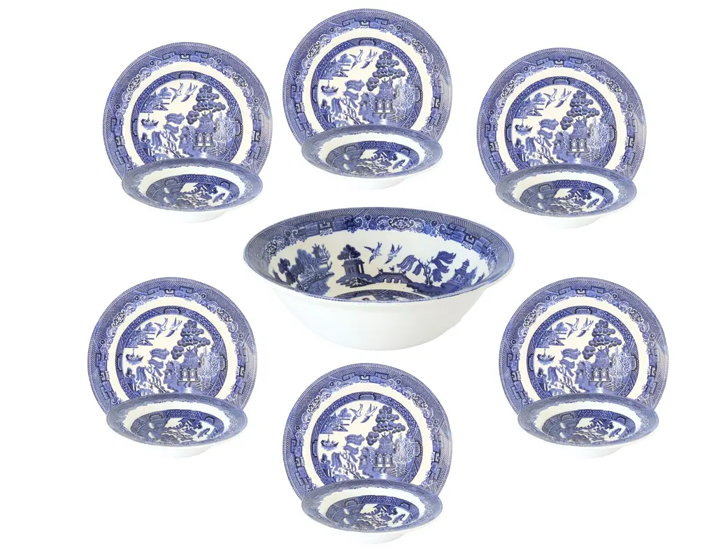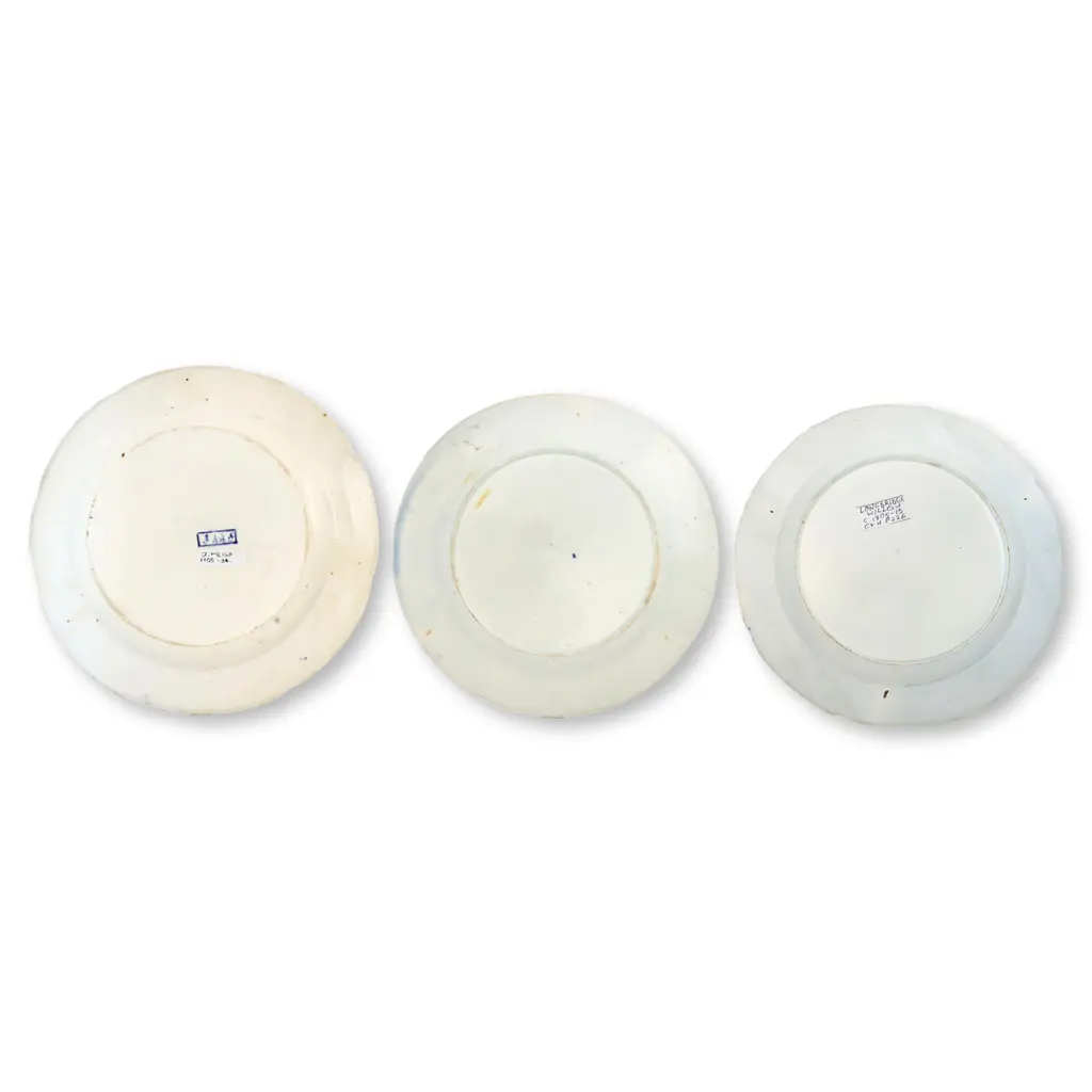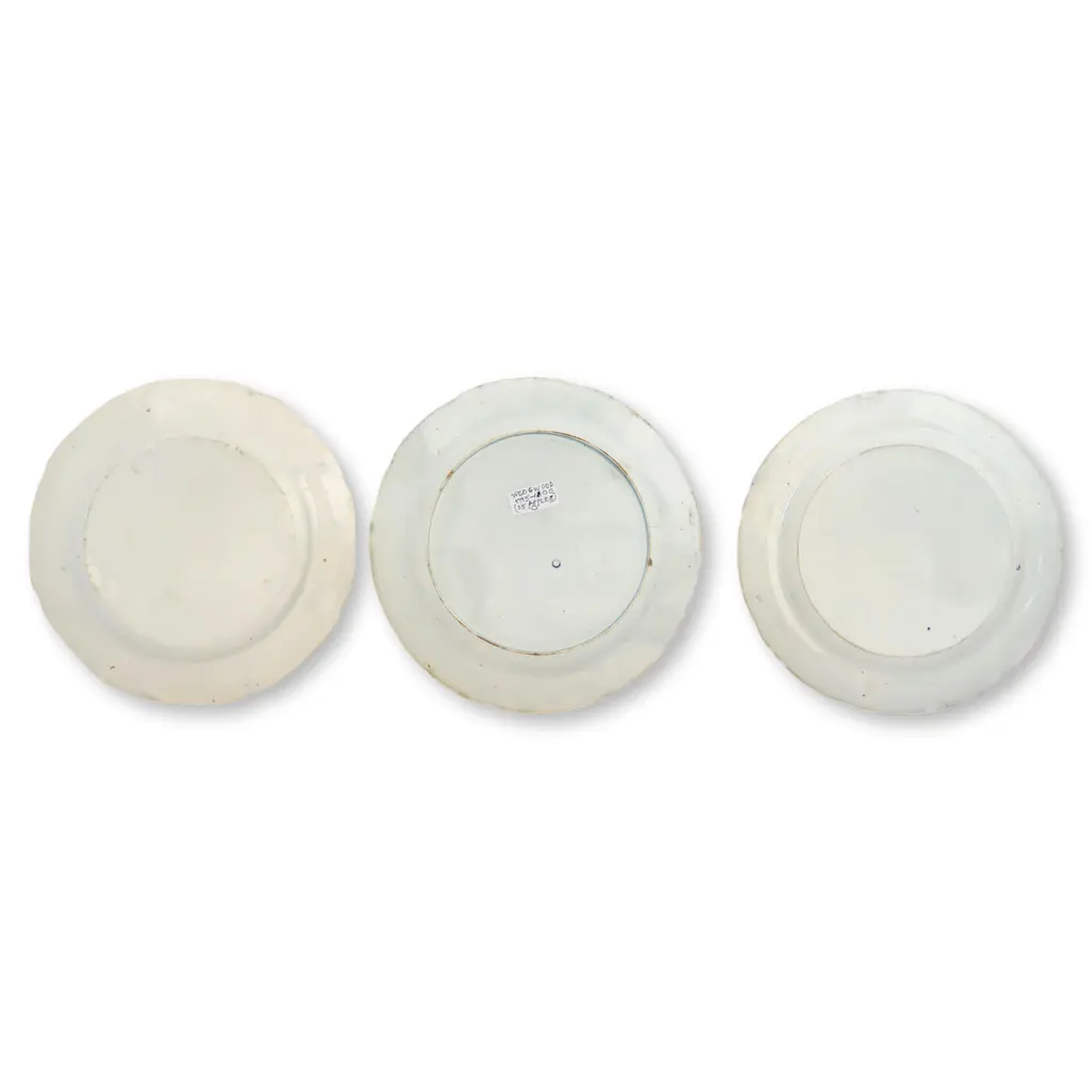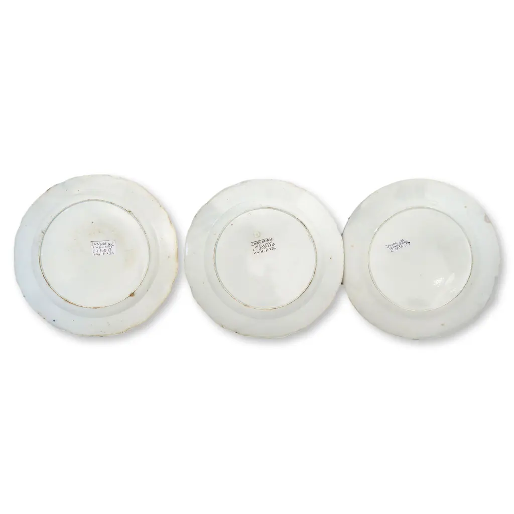 Curated collection of nine antique English Willow variant plates dating to 1805-1815. They are highly collectible patterns and makers and are from the estate of an early Staffordshire pottery collector. Some still retain the collector's info on dates, origin, maker, etc. They will arrive with plate hangers, however they would also display beautifully on a large hutch. They are all normal dinner size, 9-10" Diameter