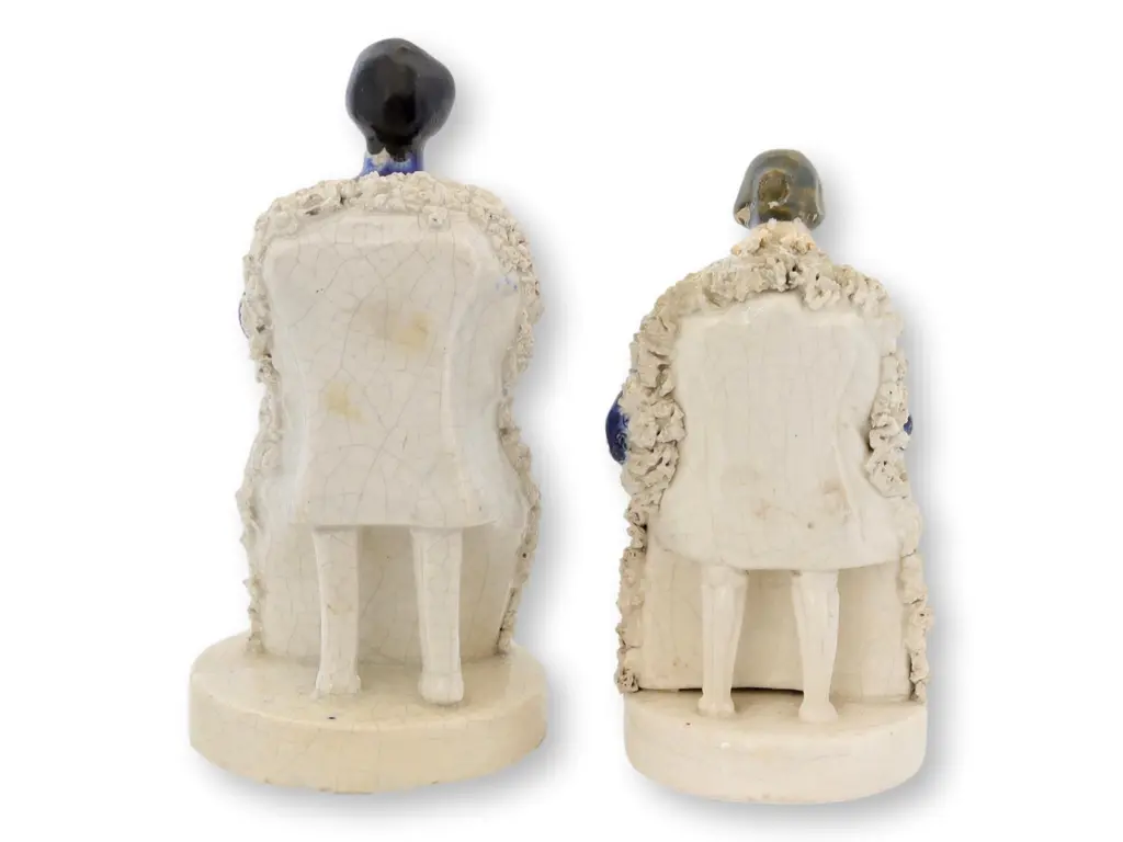 Embrace the regal charm of Staffordshire craftsmanship with this exquisite pair of porcelain figures, representing Prince Albert and Queen Victoria seated with their firstborn, Princess Victoria Adelaide Mary Louise. Made circa 1840s, these statuettes exude the essence of Victorian elegance and celebrate the enduring legacy of Britain's beloved royals. A splendid addition to any collection of fine English ceramics or a statement of historical admiration. Unsigned.