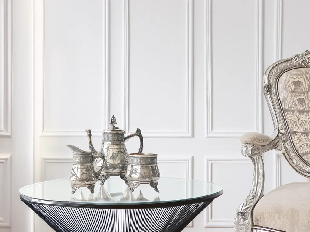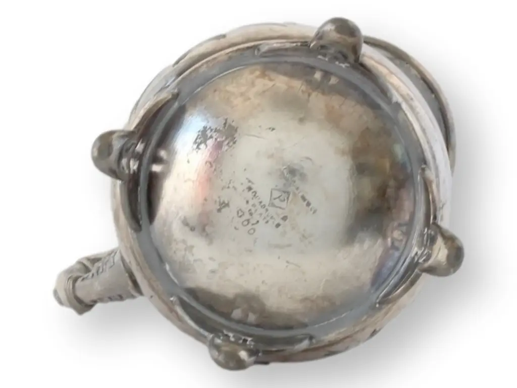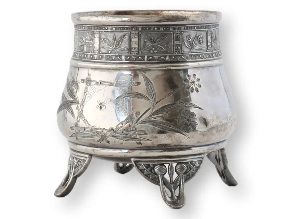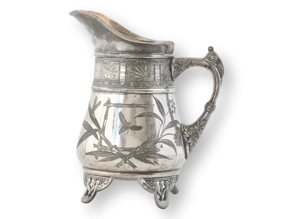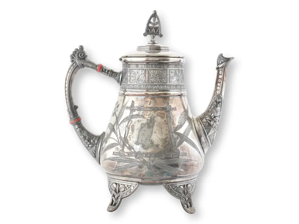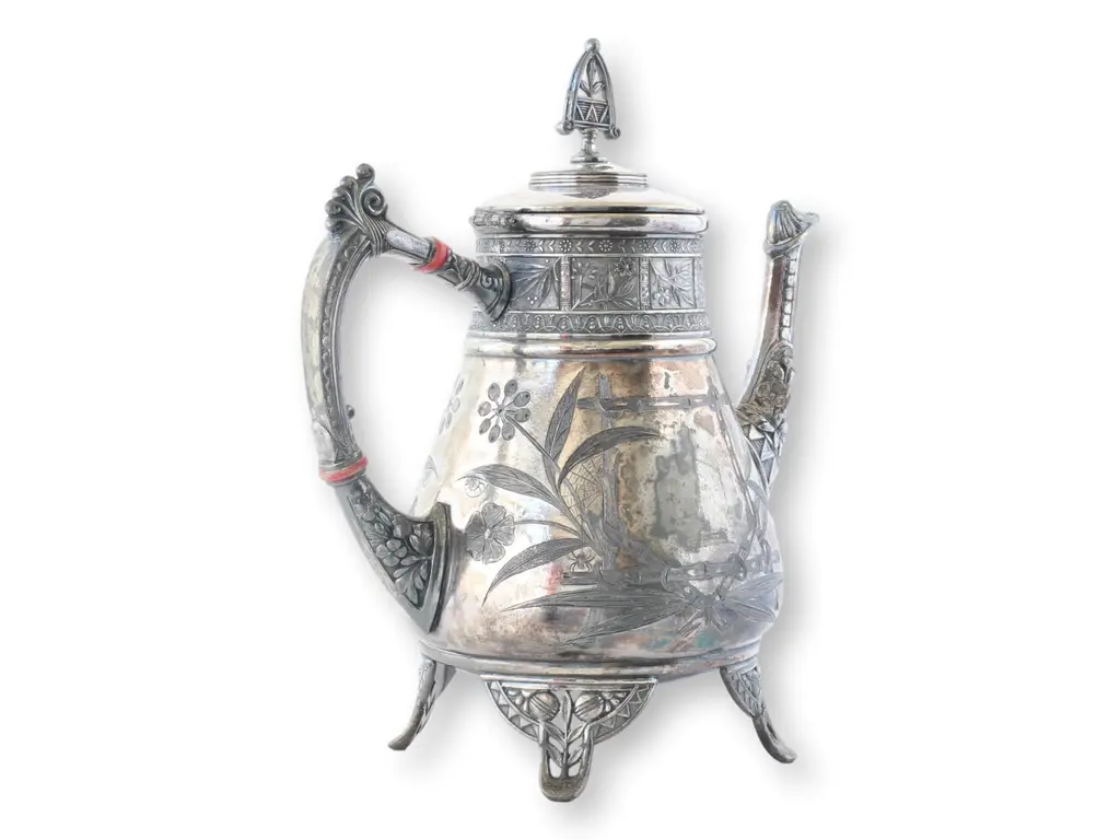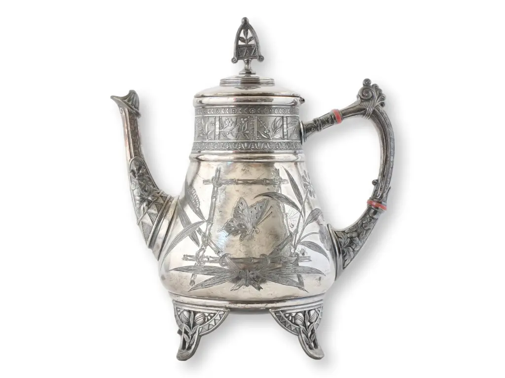 A stunning Pairpoint silver-plated coffee set from the Aesthetic Movement, circa 1880, crafted in New Bedford, Massachusetts. The set includes a coffee pot (10"L x 6"W x 11.5"H), creamer (5.5"L x 3.5"W x 6.25"H), and sugar bowl (4.75"D x 5"H), each featuring intricate engraved floral and nature-inspired motifs, all resting on elegant decorative feet. This beautifully crafted set exemplifies the artistic influence of the late 19th century. Signed on bottom.