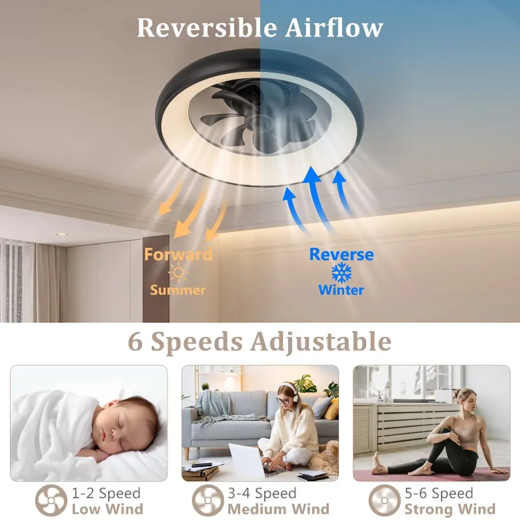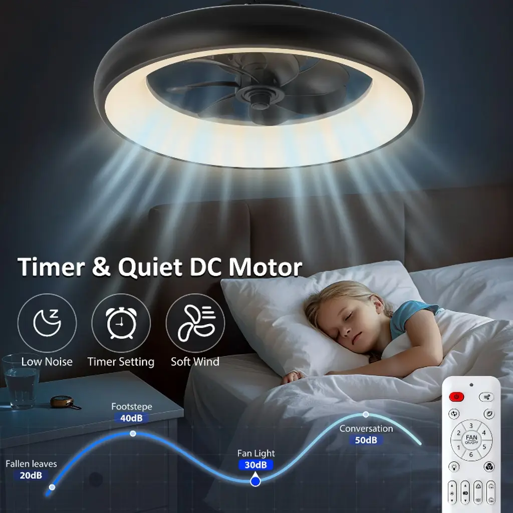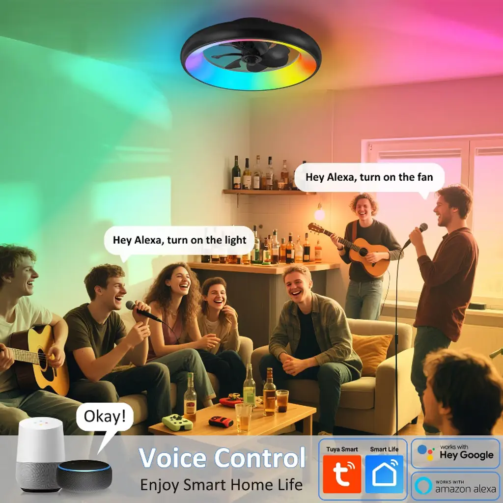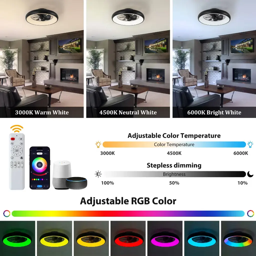 With its modern appearance and aerodynamic 7-blade design, this smart ceiling fan light introduces a bold, contemporary flair to any space. It seamlessly integrates into modern smart homes, offering intuitive control via app, voice commands, or remote. Whether you're adjusting RGB lighting to match your mood or setting the perfect airflow with six fan speeds, every function is designed for effortless customization. The reversible DC motor supports year-round comfort¡ªcooling in summer, circulating warmth in winter. Quiet performance and timer settings make it ideal for bedrooms and living spaces where peace and control matter most. This is more than a fan light---it's a statement of style and functionality.