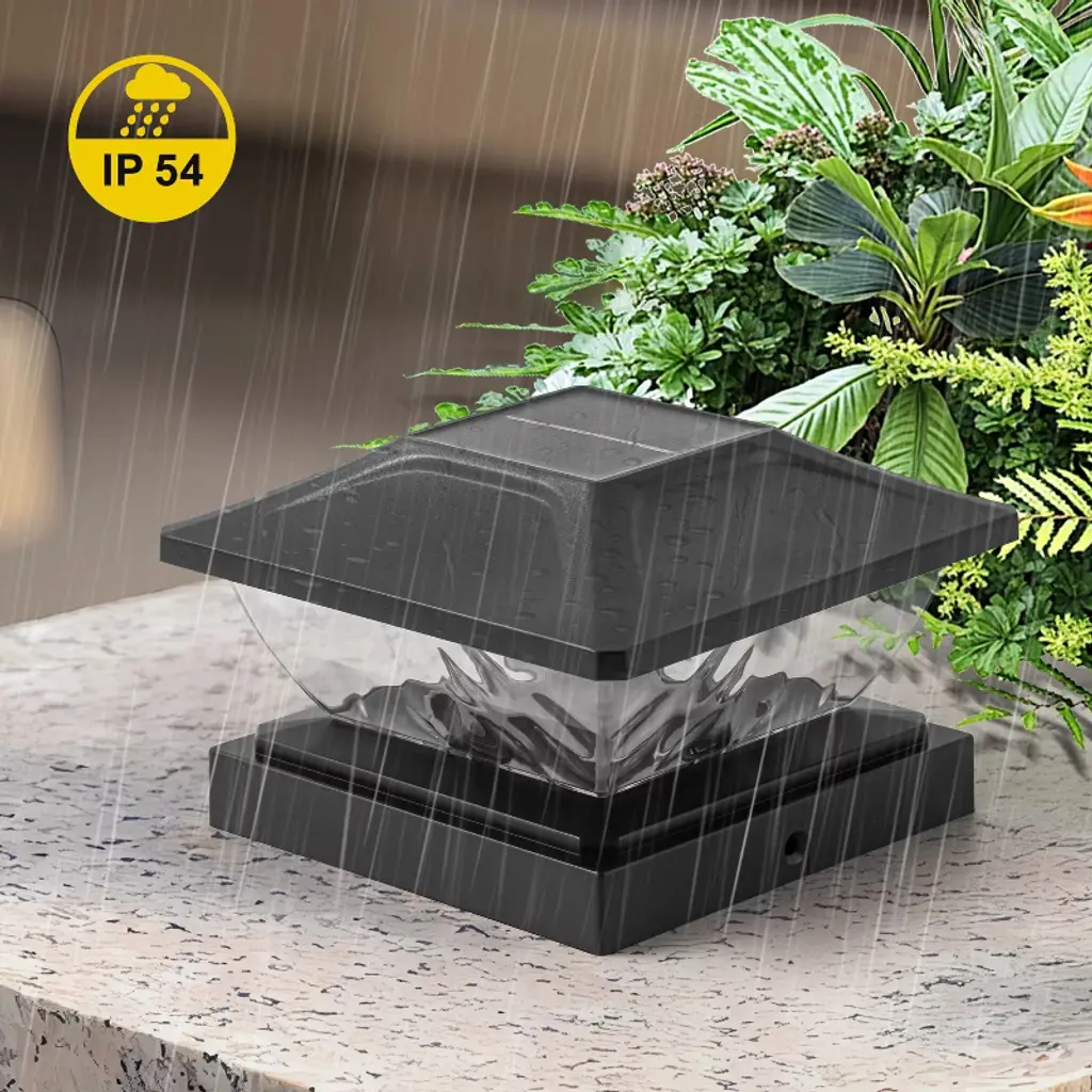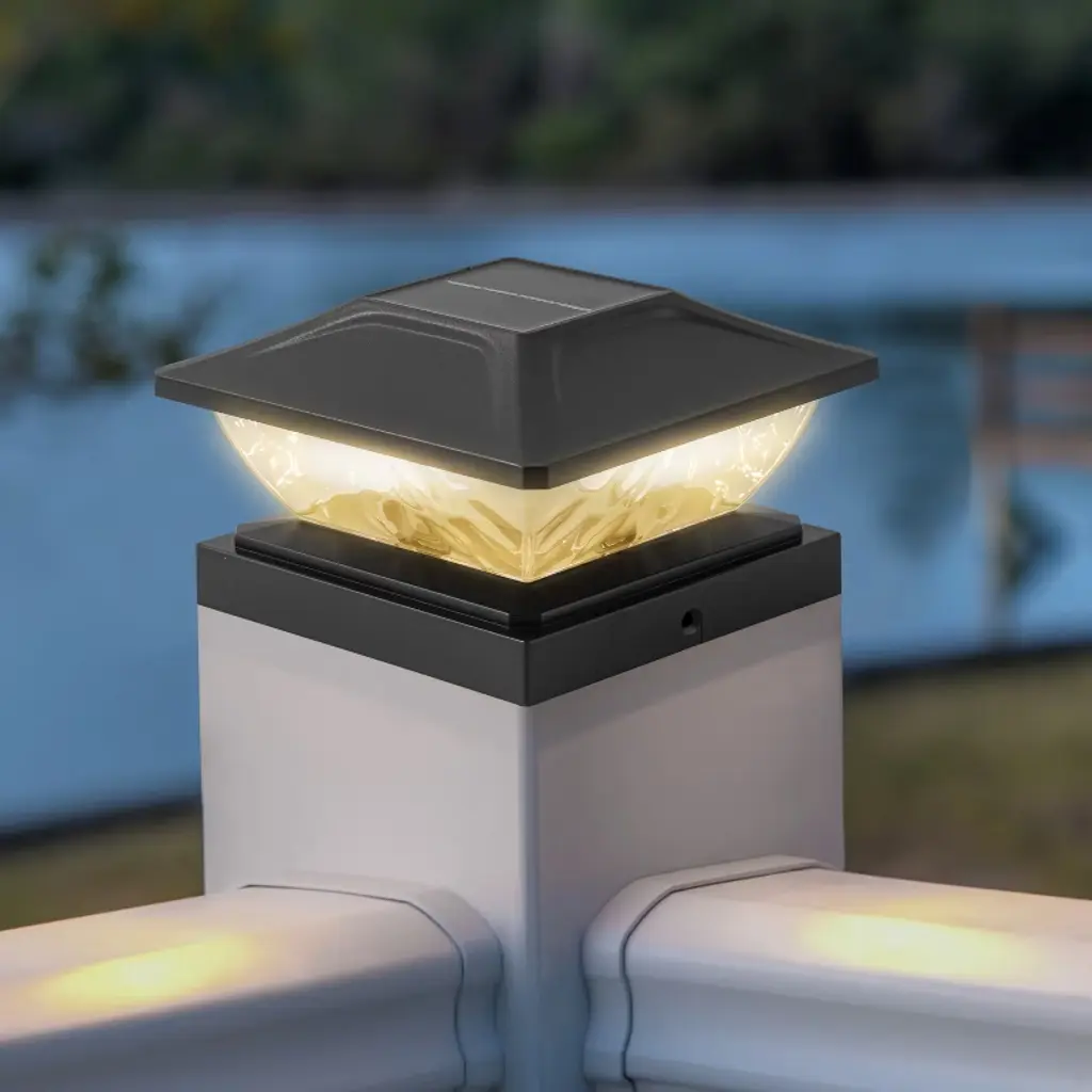 Enhance your outdoor space with this stylish and efficient solar post cap Light. Powered by a built-in solar panel, this fixture automatically turns on at dusk for up to 8 hours of illumination, casting a warm 3000K glow that adds both safety and ambiance to your pathways, decks, fences, and garden posts. Made with durable ABS and a clear hammered lens, the fixture provides a classic look with modern solar efficiency. Four adapters included for mounting on top of 3.5-in, 4-in, 4.5-in, or 5-in wooden, vinyl and composite posts.