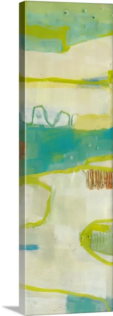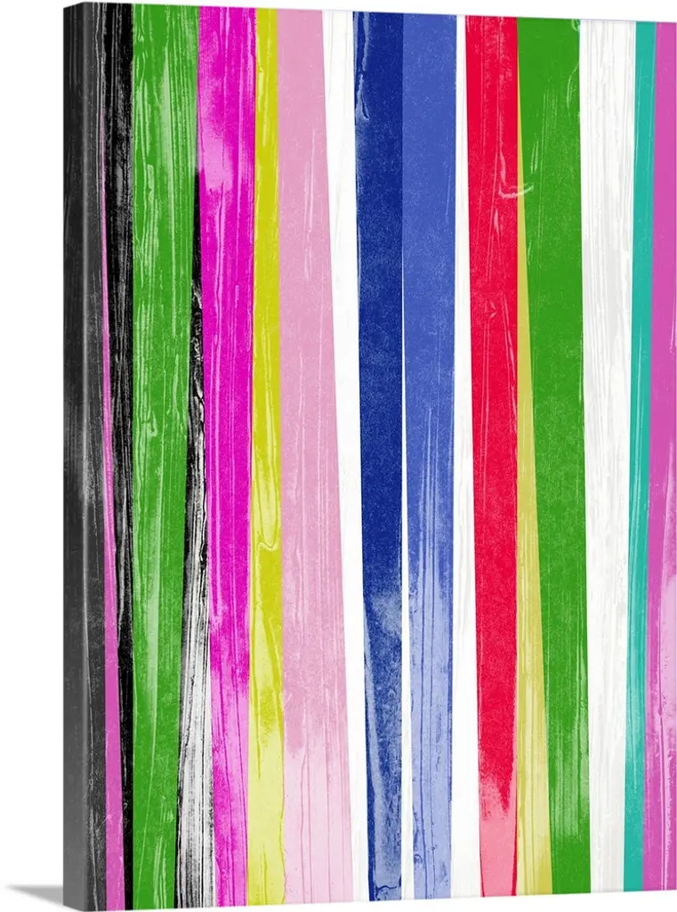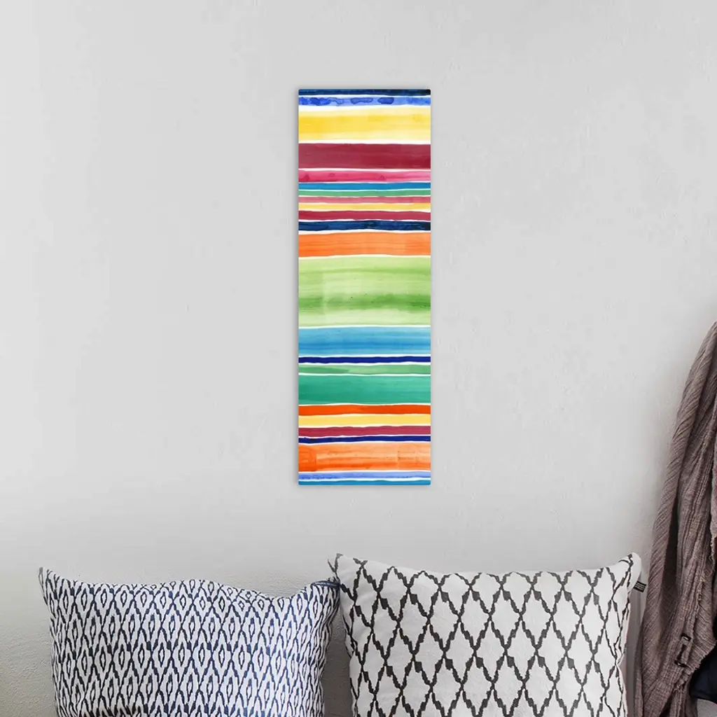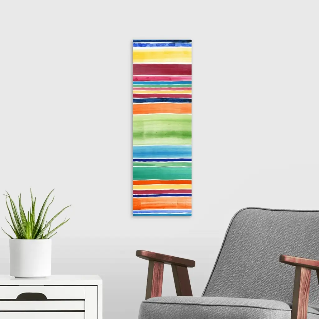 Abstract art print of horizontal stripes in tropical rainbow colors.