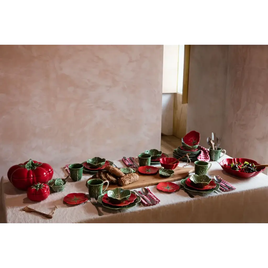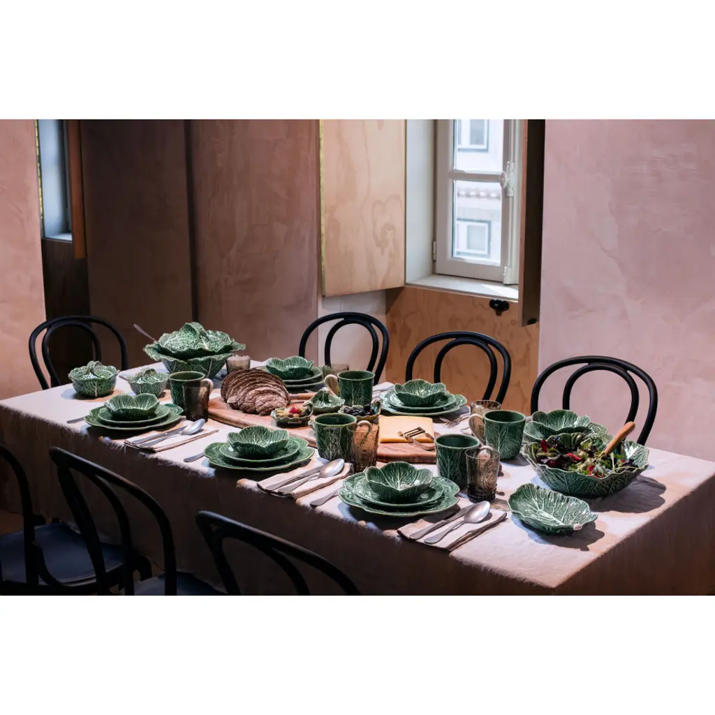 Cabbage, in its rough and flat form, could be used as a metaphor for Portugal’s rustic ways. Think of the Calda Verde soup that's so basic in Portguese cuisine. Because of this importance, Bordallo many times depicted the cabbage in his work. This dinnerware was a clever way to honour it, by making it nice enough for the tables of the bourgeois families, who at one time would have considered the common cabbage too lowly to serve. Portugal's most beloved cartoonist of the 19th century, Bordallo Pinheiro was famous for creating the character "Ze Povinho," a rustic laborer who was kind to his friends and contemptuous of those with money and power. His artistic style blends the honesty realism of late 19th-century Arts and Crafts movement with the dramatic, even grotesque, features of Goya's earlier paintings. In 1884, he and his son founded an eponymous factory in Caldas da Rainha along the Portuguese coast to create whimsical and naturalistic faience pieces based on his art. Because of the special minerals in the local soil and the skills of the craftsmen in the area, Caldas da Rainha is well-known as the capital of Portuguese pottery. Today the factory takes Pinheiro's original style into the 21st century with satirical portraits of modern day celebrities, while continuing its old fashioned, made by hand tradition of Portuguese pottery making.