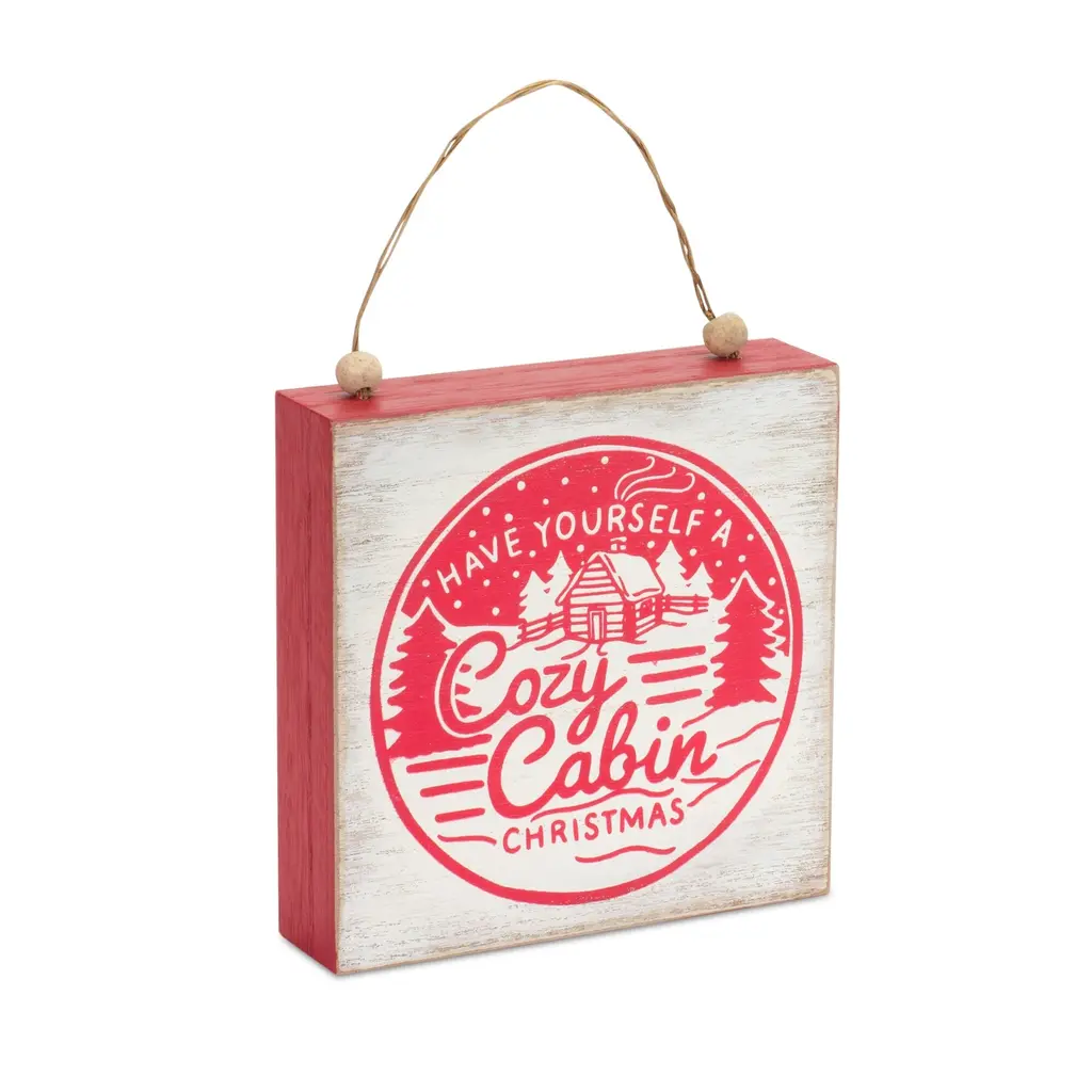 Adorn your Christmas Tree with this beautiful set of Woodland Sentiment Ornaments. Featuring two assorted designs, the sentiments include "Have Yourself a Cozy Cabin Christmas" and "The Trails are Calling and I Must Go". The weathered faux wooden design paired with the traditional red and green color scheme with wire hanger accent makes this set the perfect additiont to your holiday tree decor. The pieces can be used as gifts for friends to cherish, or you can display the set on your own Christmas tree and enjoy them for years to come. Featured in Melrose International's home and holiday collection.