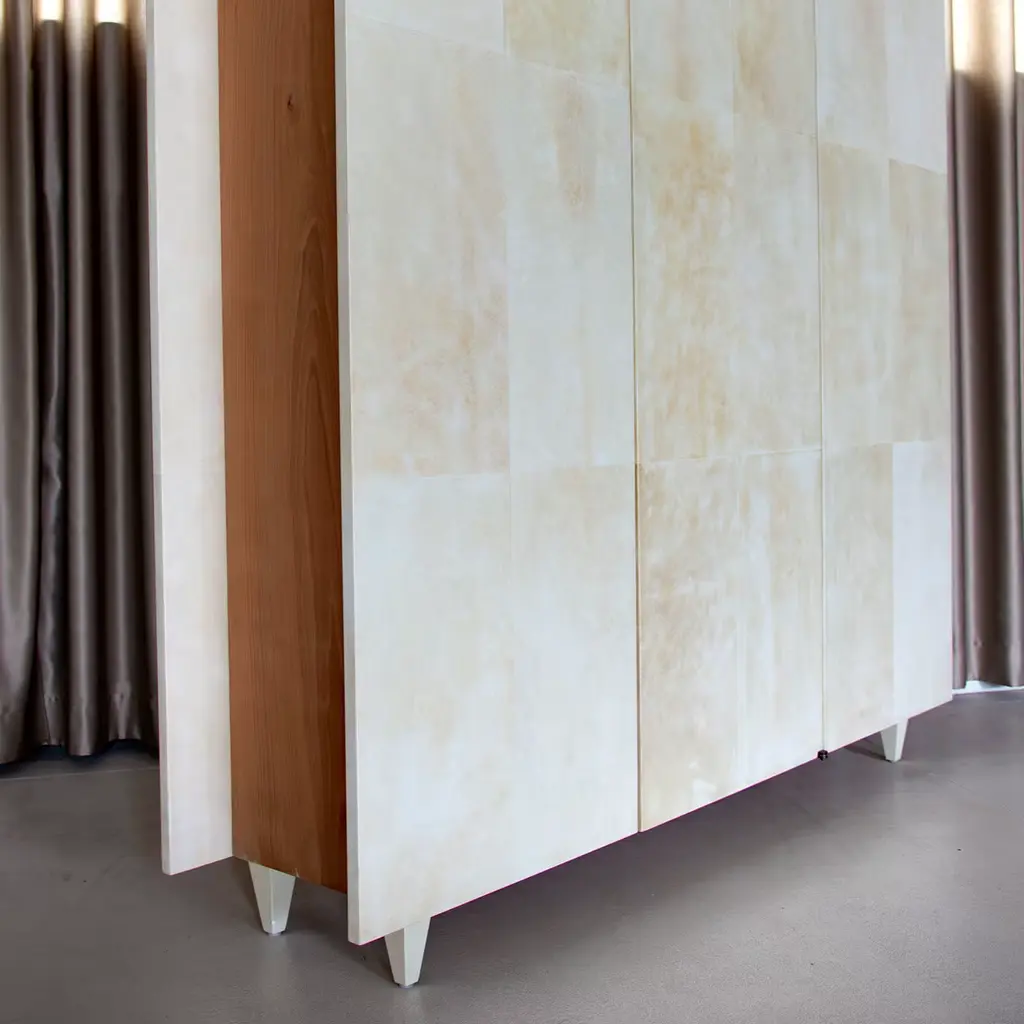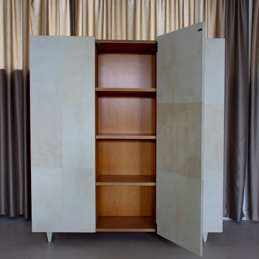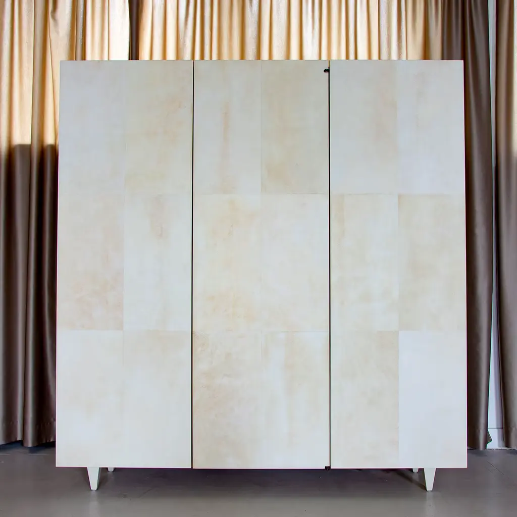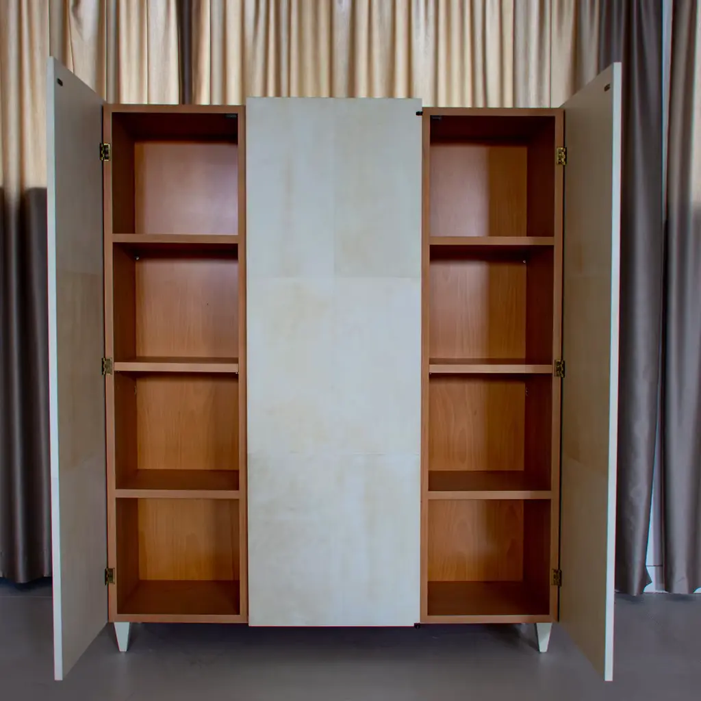 An exclusive design by Renzi e Reale, this wall unit cabinet is entirely wrapped in matte natural parchment and features three doors that open to reveal an interior in natural wood with three shelves in each section. The tall, rectangular structure stands on four short, conical feet with the same parchment finish. Designed to expand storage in any room, this wall unit/cabinet can be used also in a loft as a room divider, thanks to the precious finish that covers all sides.