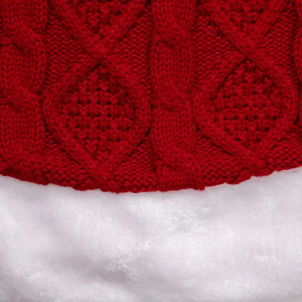 Add a cozy touch of tradition to your holiday decor with our cable knit Christmas tree skirt. Crafted in a classic red hue, its intricate cable knit design brings warmth and charm to your holiday setting. Finished with a soft tan faux fur trim, this skirt exudes rustic elegance, perfect for complementing both traditional and modern themes. Enhance the heartwarming atmosphere of your seasonal gatherings with this timeless piece, sure to become a cherished part of your Christmas celebrations for years to come. Product Features: Red Christmas tree skirt Cable knit design Tan faux fur border One-sided design Velcro closure in the back For indoor use only Care instructions: spot clean only Dimensions: 48" diameter Material(s): polyester/faux fur