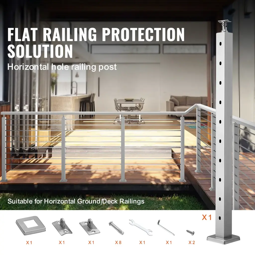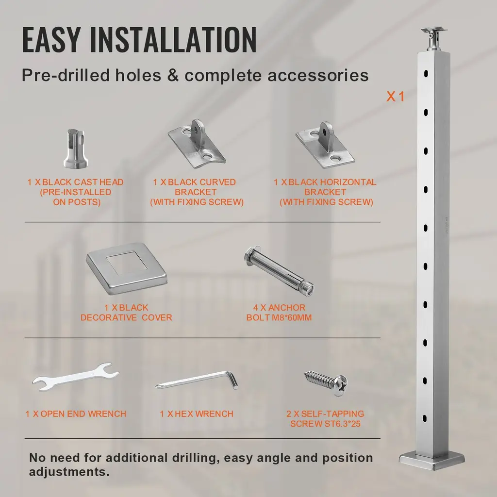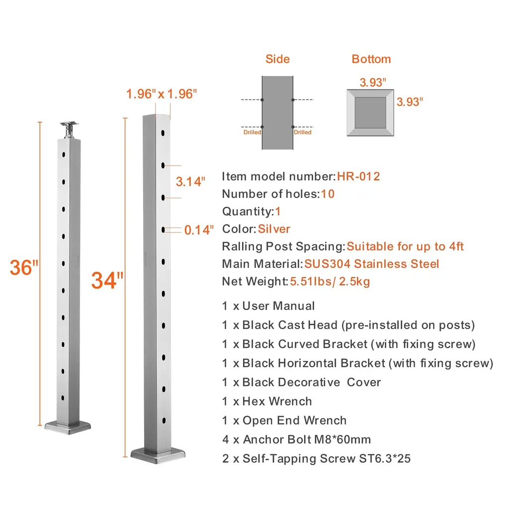 30° Angled Hole Railing Post: This 30° angled hole cable railing post has a height of 42 inches and features 0.41"-0.59" oval holes/36 inches and features 0.41-inch holes, with a total of 12 holes/ 10 holes. It is ideal for 25° to 35° stairs railing protection, ensuring the safety of you and your family. Sturdy and Durable: The cable handrail post is made of high-quality SUS304 stainless steel, providing excellent rust resistance and corrosion resistance, ensuring a long lifespan. However, we do not recommend it for coastal projects. Compliant with Standards: The 30° angled hole stair railing post has a 3.14" cable spacing, and typically, the span between two structural posts should not exceed 4 feet to pass the 4-inch sphere test. Easy to Install and DIY: Our cable rail post is equipped with horizontal brackets and curved brackets, fitting various hole types in railing posts, compatible with square and round rail styles, allowing for DIY customization of any handrail angle. Versatile Protection: Our cable railing posts are suitable for both indoor and outdoor protection applications, such as stairs, steps, porches, fences, patios, balconies, gardens, residential buildings, commercial offices, hotels, garages, and more. Package Content 1 x Railing Post 1 x User Manual 1 x Silver Cast Head (pre-installed on post) 1 x Silver Curved Bracket (with fixing screw) 1 x Silver Horizontal Bracket (with fixing screw) 1 x Silver Decorative Cover 1 x Hex Wrench 1x Open End Wrench 4 x Anchor Bolt M8*60mm 2 x Self-Tapping Screw ST6.3*25