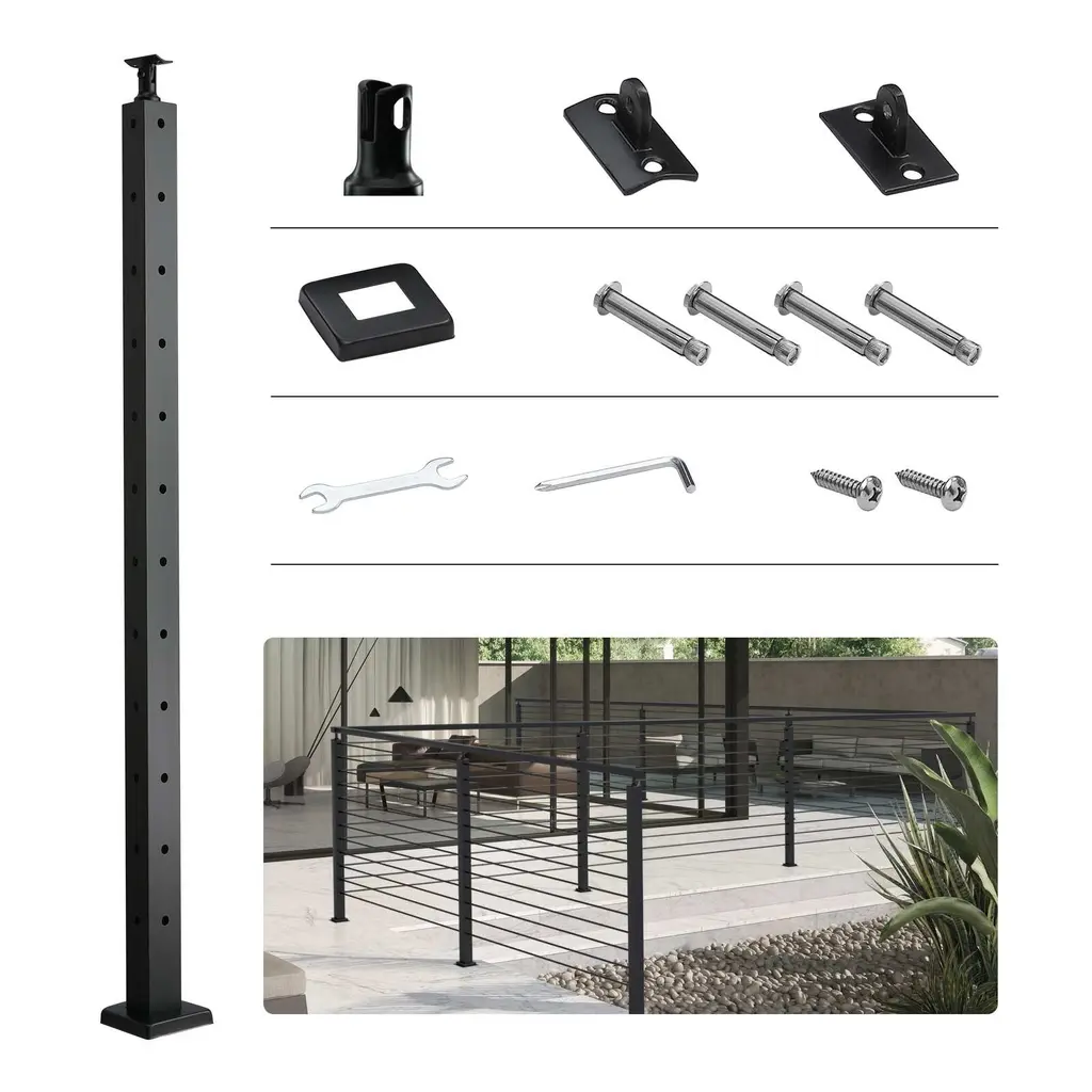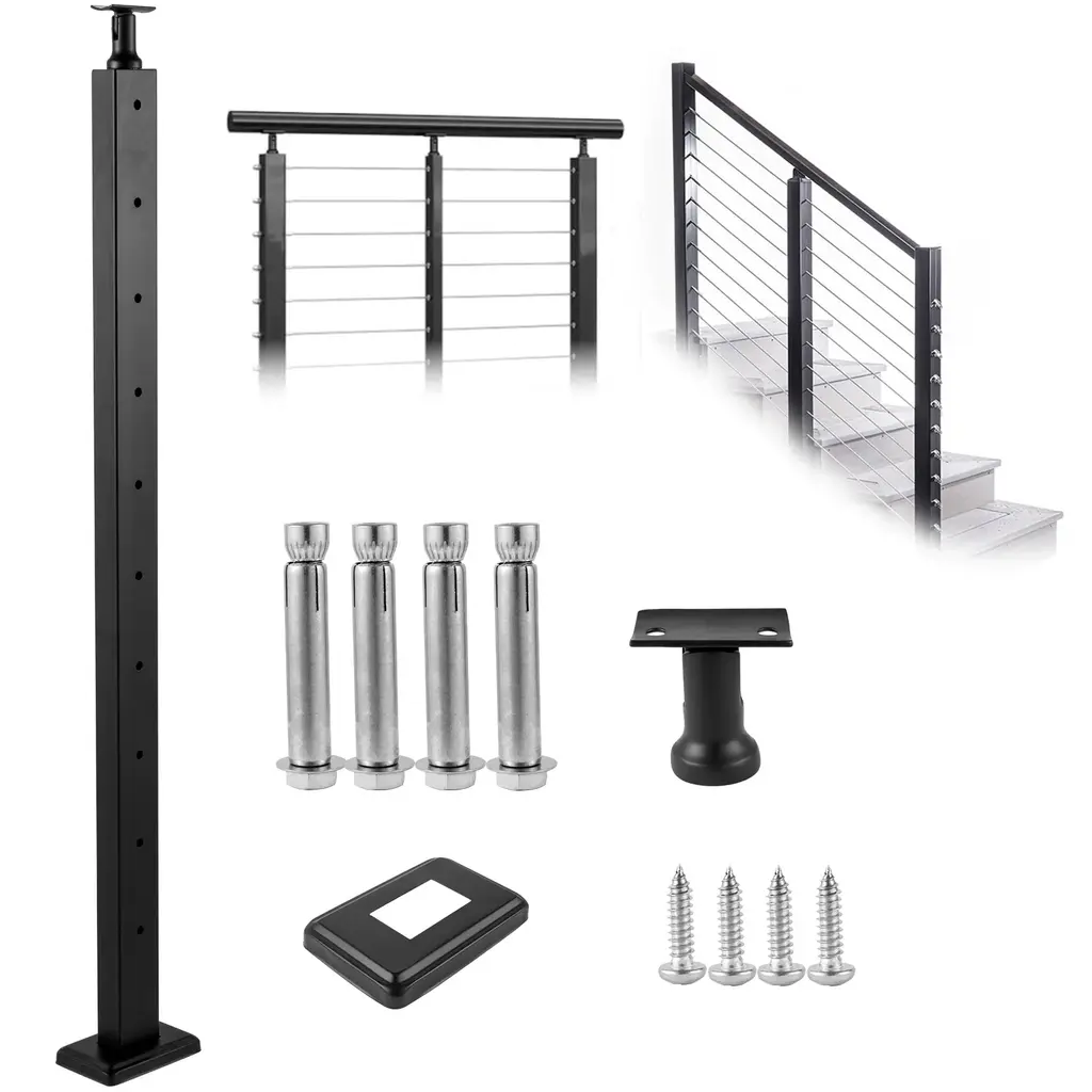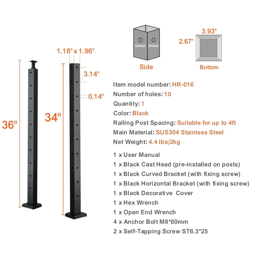 L-shaped Hole Railing Post: This 36-inch/42-inch L-shaped hole cable railing post is specifically designed for corners. It comes pre-drilled with 11/10/12 pairs of L-shaped holes, which can be used for horizontal sectioning as well as structural end posts for horizontal corner sections. Sturdy and Durable: The cable handrail post is made of high-quality SUS304 stainless steel, providing excellent rust resistance and corrosion resistance, ensuring a long lifespan. However, we do not recommend it for coastal projects. Compliant with Standards: The L-shaped hole corner railing post has a 3.14" cable spacing, and typically, the span between two structural posts should not exceed 4 feet to pass the 4-inch sphere test. Reserve space at the bottom of the railing for custom drilling. Maintain a consistent hole distance of 3.14" for safety. Number of holes: 11 Easy to Install and DIY: Our cable rail post is equipped with horizontal brackets and curved brackets, fitting various hole types in railing posts, compatible with square and round rail styles. L-shaped holes can only be used for single-direction DIY railing angles. Versatile Protection: Our cable railing posts are suitable for both indoor and outdoor protection applications, such as corners, stairs, porches, fences, patios, balconies, gardens, residential buildings, commercial offices, hotels, garages, and more. Package Content 1 x Railing Post 1 x User Manual 1 x Black Cast Head (pre-installed on post) 1 x Black Curved Bracket (with fixing screw) 1 x Black Horizontal Bracket (with fixing screw) 1 x Black Decorative Cover 1 x Hex Wrench 1x Open End Wrench 4 x Anchor Bolt M8*60mm 2 x Self-Tapping Screw ST6.3*25