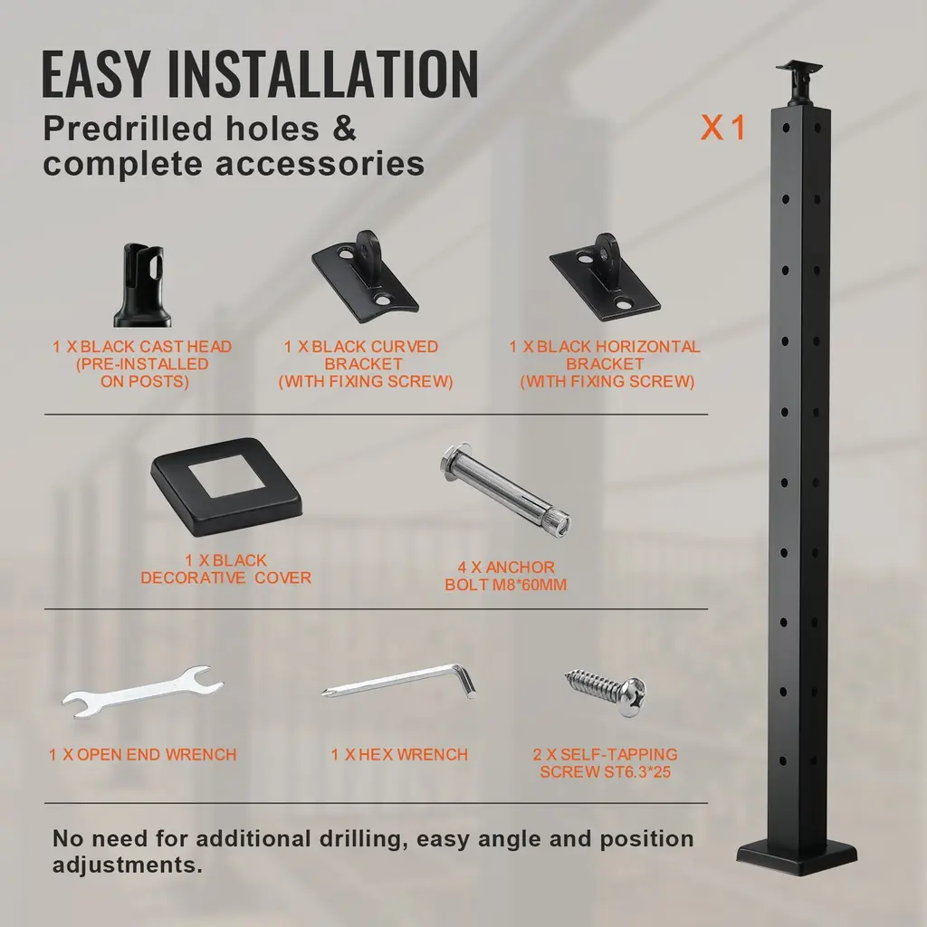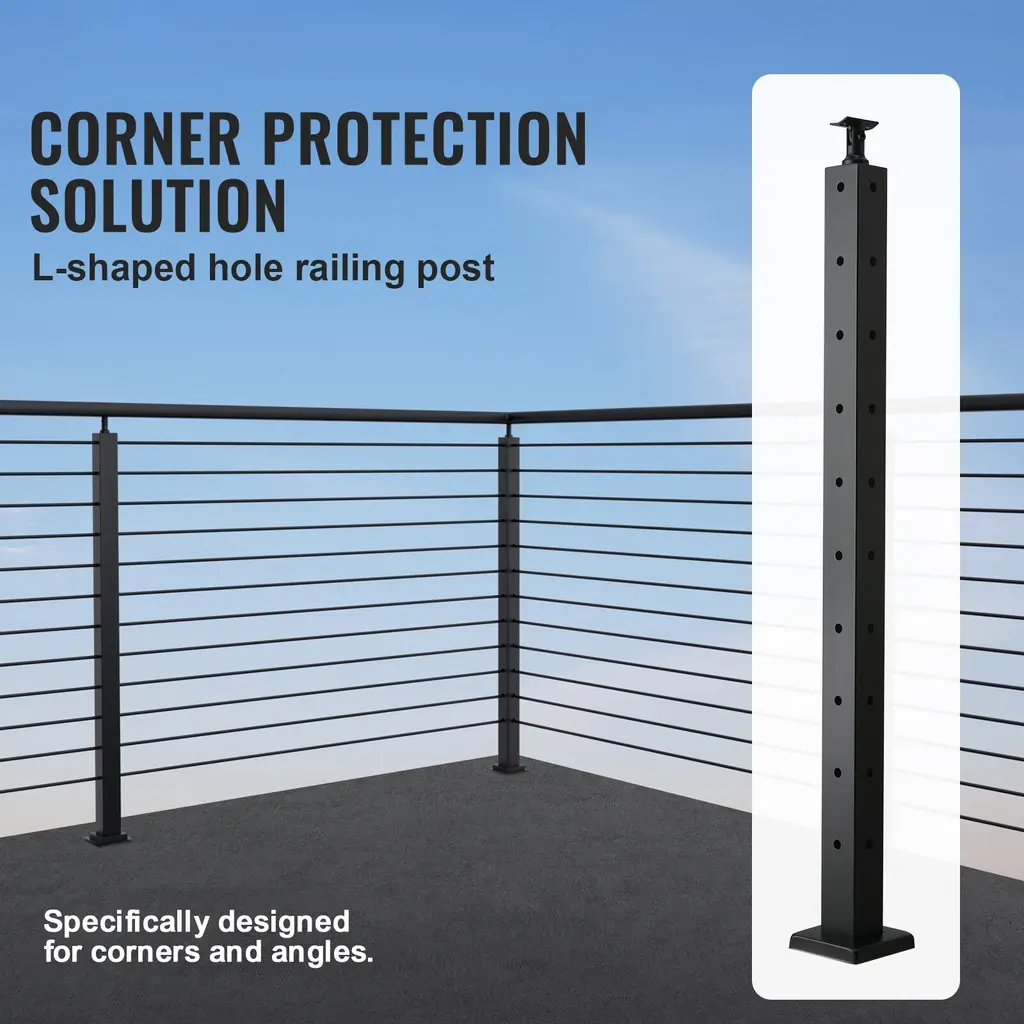 L-shaped Hole Railing Post: This 36-inch/42-inch L-shaped hole cable railing post is specifically designed for corners. It comes pre-drilled with 11/10/12 pairs of L-shaped holes, which can be used for horizontal sectioning as well as structural end posts for horizontal corner sections. Sturdy and Durable: The cable handrail post is made of high-quality SUS304 stainless steel, providing excellent rust resistance and corrosion resistance, ensuring a long lifespan. However, we do not recommend it for coastal projects. Compliant with Standards: The L-shaped hole corner railing post has a 3.14" cable spacing, and typically, the span between two structural posts should not exceed 4 feet to pass the 4-inch sphere test. Reserve space at the bottom of the railing for custom drilling. Maintain a consistent hole distance of 3.14" for safety. Number of holes: 11 Easy to Install and DIY: Our cable rail post is equipped with horizontal brackets and curved brackets, fitting various hole types in railing posts, compatible with square and round rail styles. L-shaped holes can only be used for single-direction DIY railing angles. Versatile Protection: Our cable railing posts are suitable for both indoor and outdoor protection applications, such as corners, stairs, porches, fences, patios, balconies, gardens, residential buildings, commercial offices, hotels, garages, and more. Package Content 1 x Railing Post 1 x User Manual 1 x Black Cast Head (pre-installed on post) 1 x Black Curved Bracket (with fixing screw) 1 x Black Horizontal Bracket (with fixing screw) 1 x Black Decorative Cover 1 x Hex Wrench 1x Open End Wrench 4 x Anchor Bolt M8*60mm 2 x Self-Tapping Screw ST6.3*25
