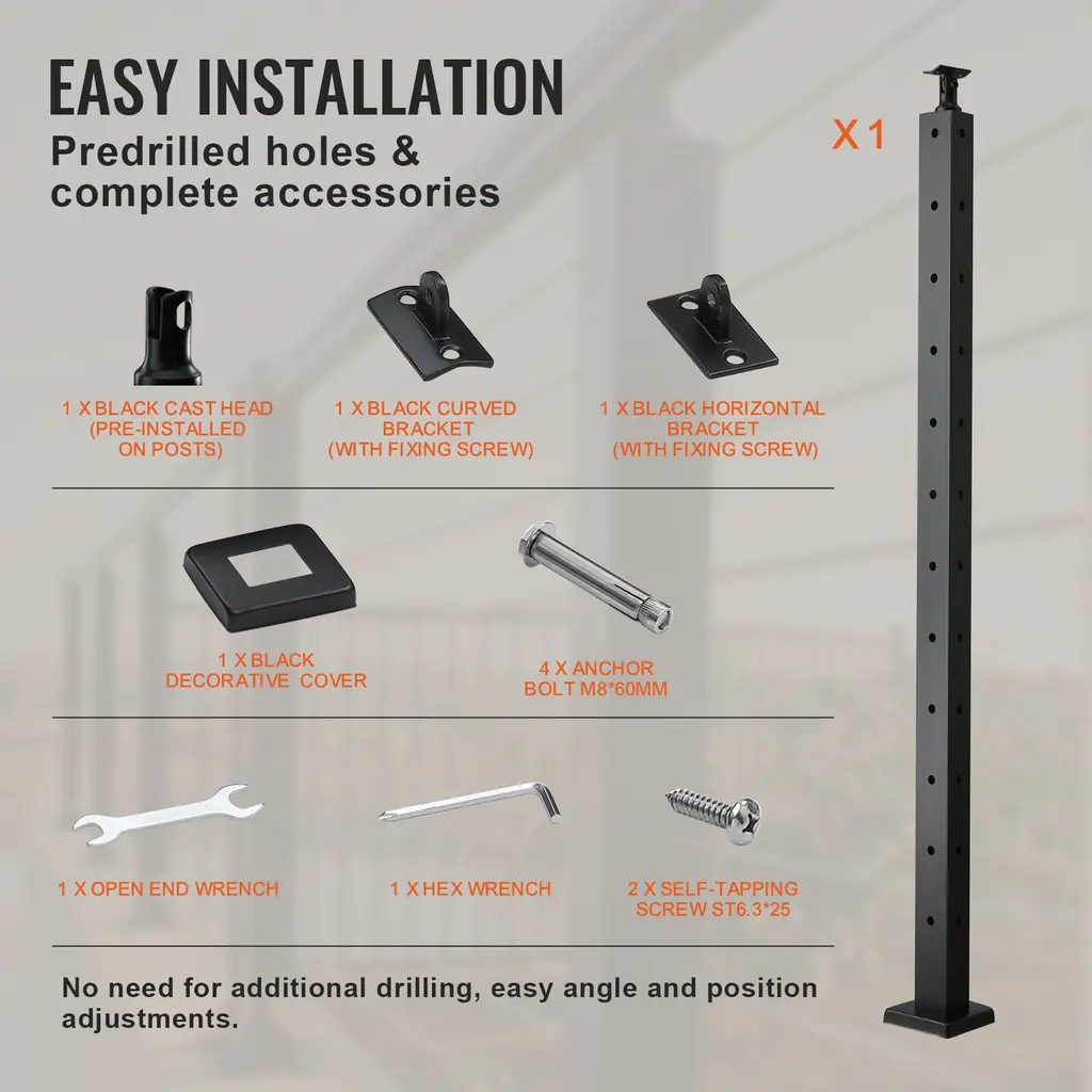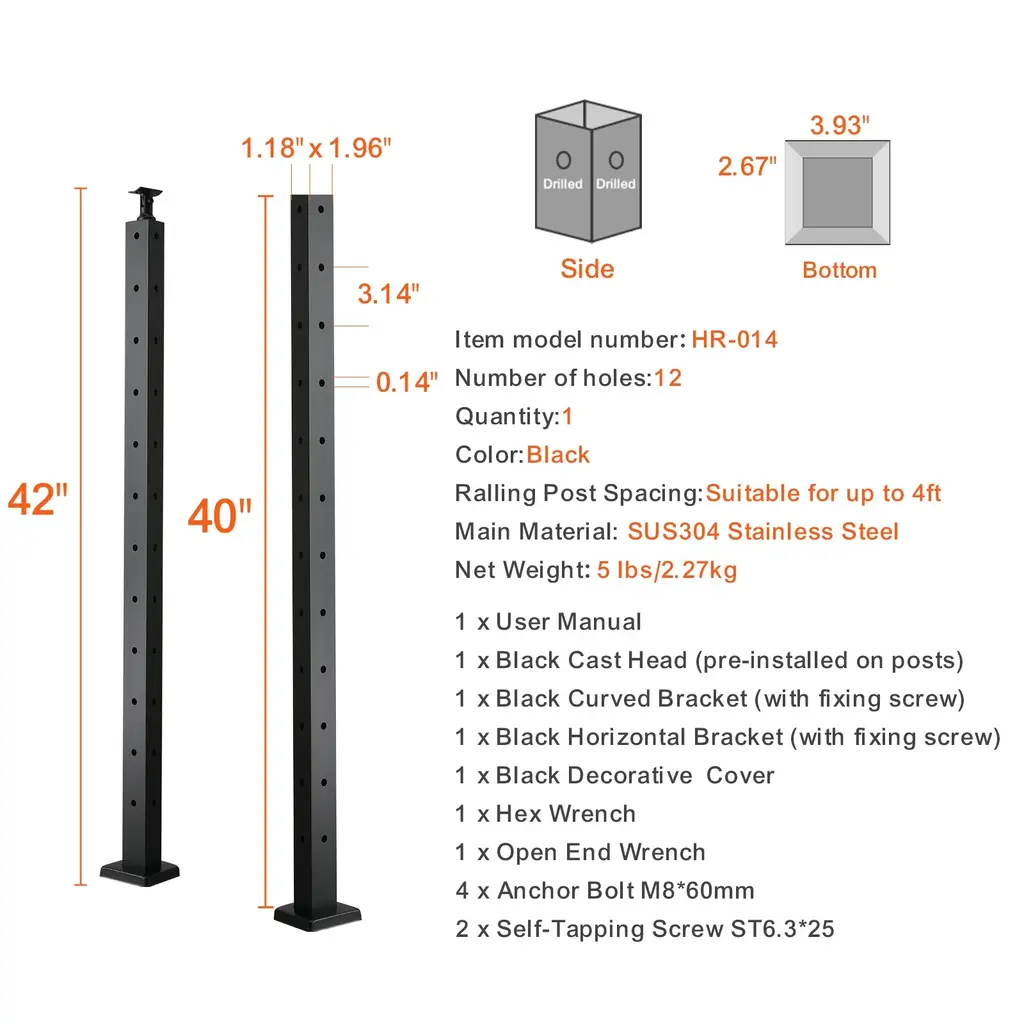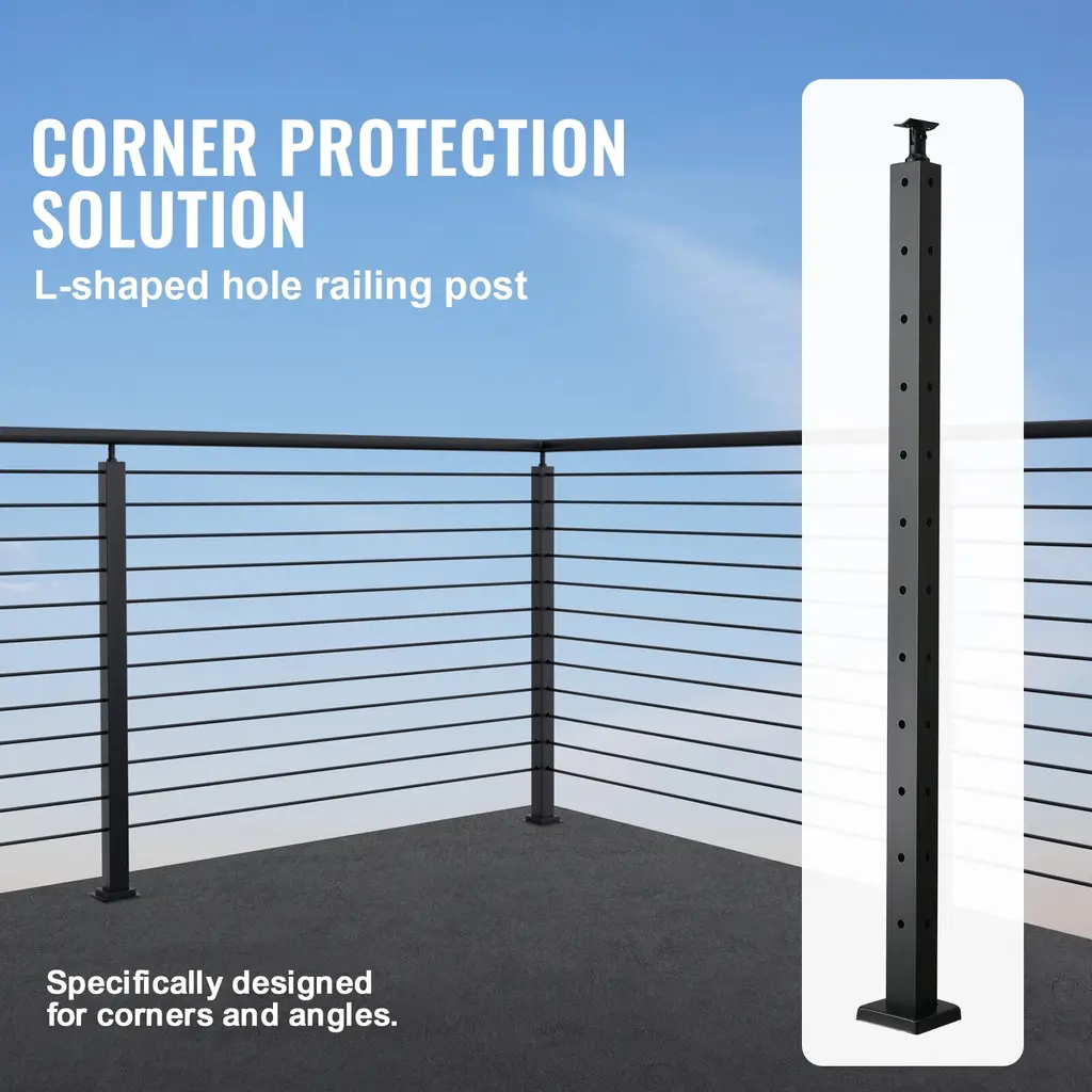L-shaped Hole Railing Post: This 36-inch/42-inch L-shaped hole cable railing post is specifically designed for corners. It comes pre-drilled with 11/10/12 pairs of L-shaped holes, which can be used for horizontal sectioning as well as structural end posts for horizontal corner sections. Sturdy and Durable: The cable handrail post is made of high-quality SUS304 stainless steel, providing excellent rust resistance and corrosion resistance, ensuring a long lifespan. However, we do not recommend it for coastal projects. Compliant with Standards: The L-shaped hole corner railing post has a 3.14" cable spacing, and typically, the span between two structural posts should not exceed 4 feet to pass the 4-inch sphere test. Reserve space at the bottom of the railing for custom drilling. Maintain a consistent hole distance of 3.14" for safety. Number of holes: 11 Easy to Install and DIY: Our cable rail post is equipped with horizontal brackets and curved brackets, fitting various hole types in railing posts, compatible with square and round rail styles. L-shaped holes can only be used for single-direction DIY railing angles. Versatile Protection: Our cable railing posts are suitable for both indoor and outdoor protection applications, such as corners, stairs, porches, fences, patios, balconies, gardens, residential buildings, commercial offices, hotels, garages, and more. Package Content 1 x Railing Post 1 x User Manual 1 x Black Cast Head (pre-installed on post) 1 x Black Curved Bracket (with fixing screw) 1 x Black Horizontal Bracket (with fixing screw) 1 x Black Decorative Cover 1 x Hex Wrench 1x Open End Wrench 4 x Anchor Bolt M8*60mm 2 x Self-Tapping Screw ST6.3*25