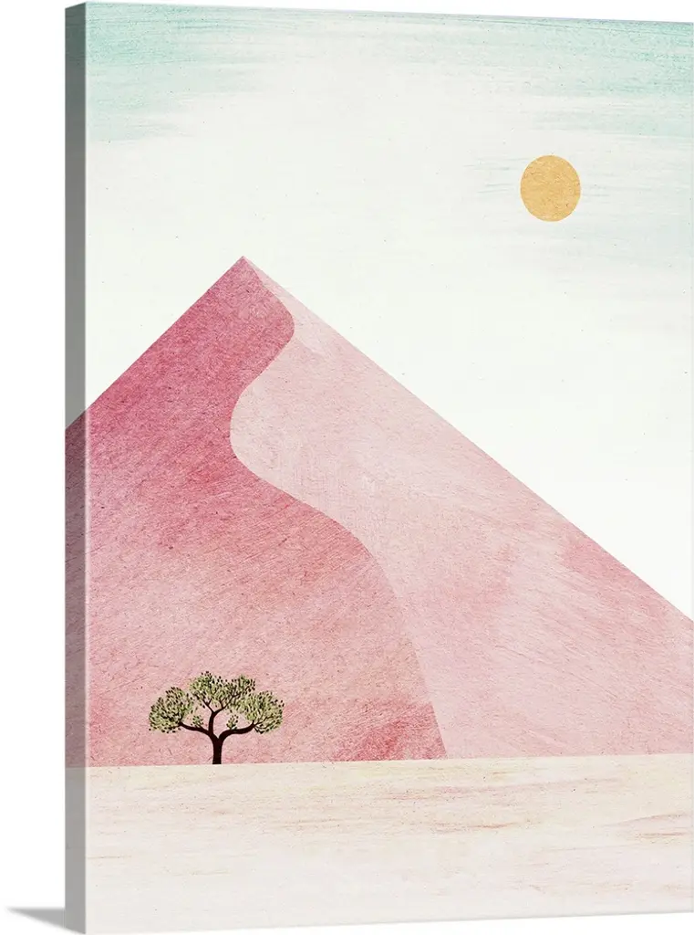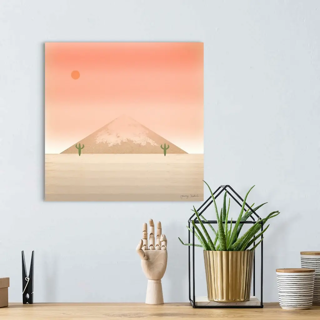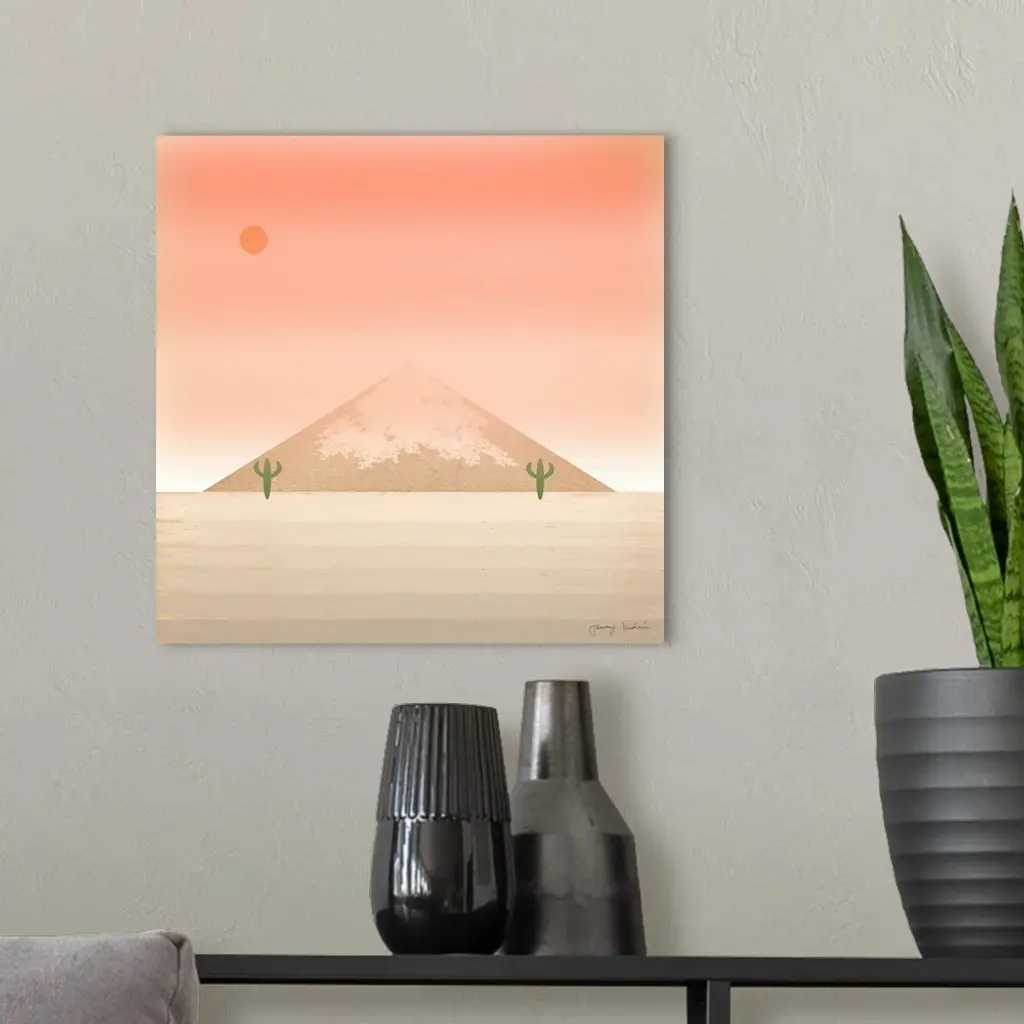 Square decorative design of two green cactus next to a mountain with a sky in shades of pink.