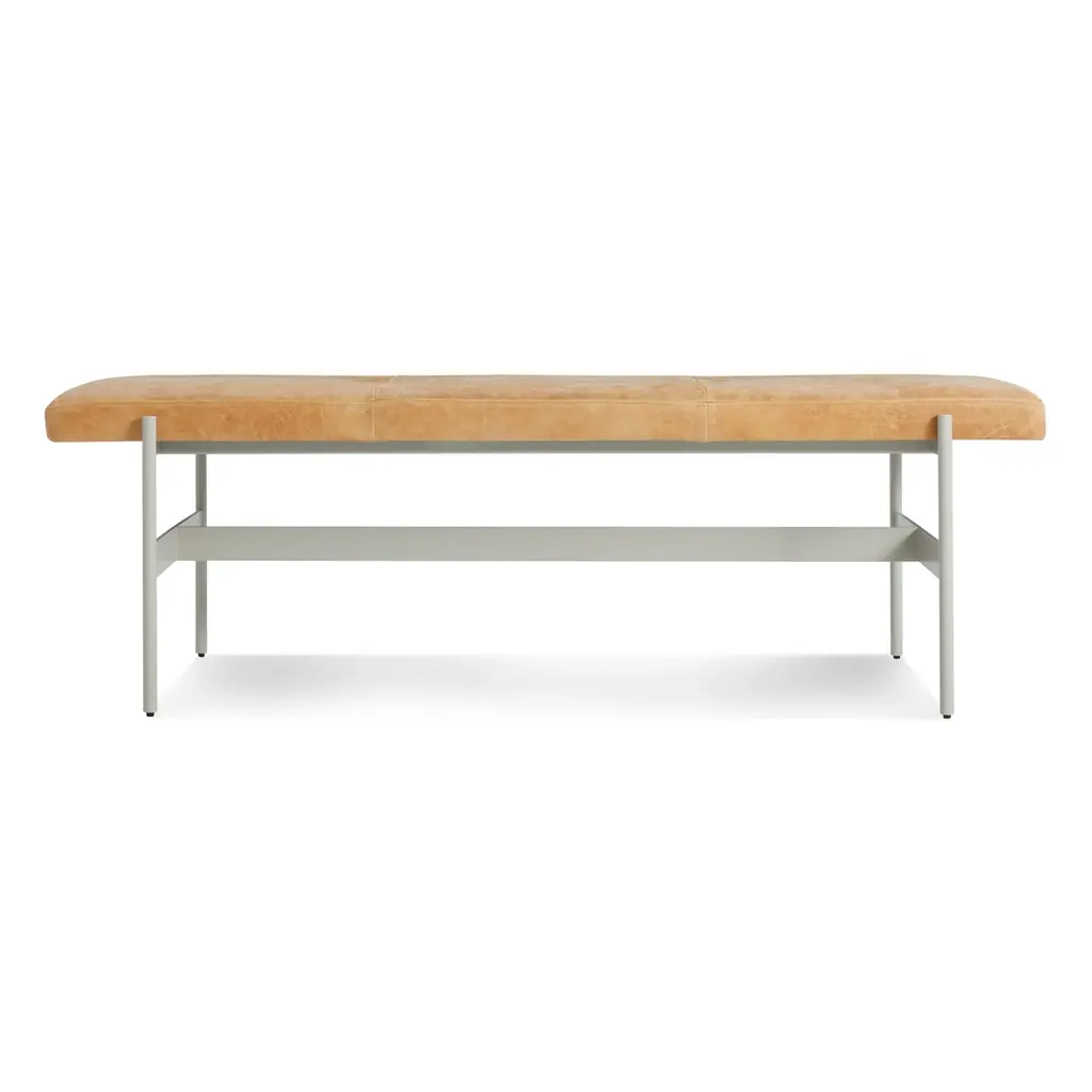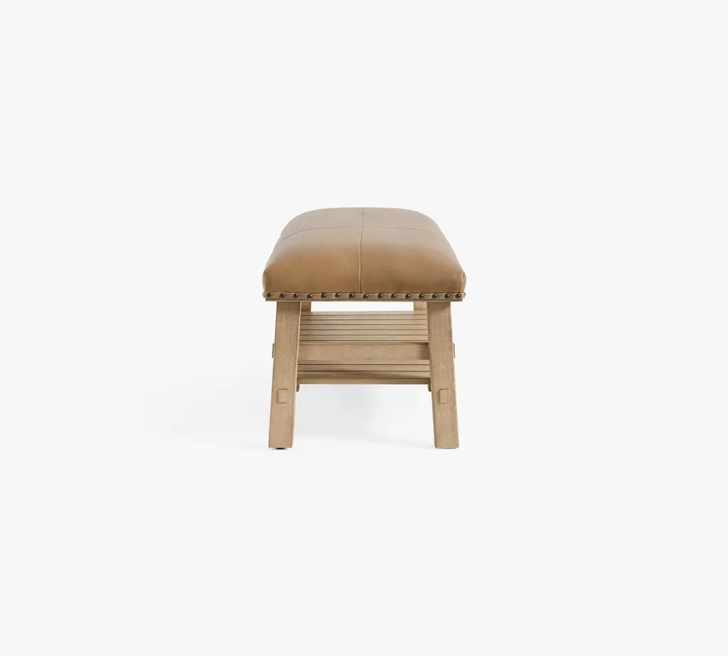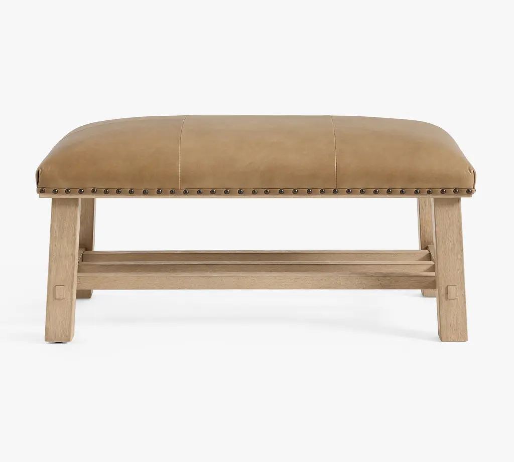 Handcrafted with pieced top-grain leather, accented with saddle stitching, and finished with antique-bronze nailheads, this bench offers a touch of luxury wherever you place it. Use it as a plush extra seat, a comfy footrest, or a stylish coffee table.