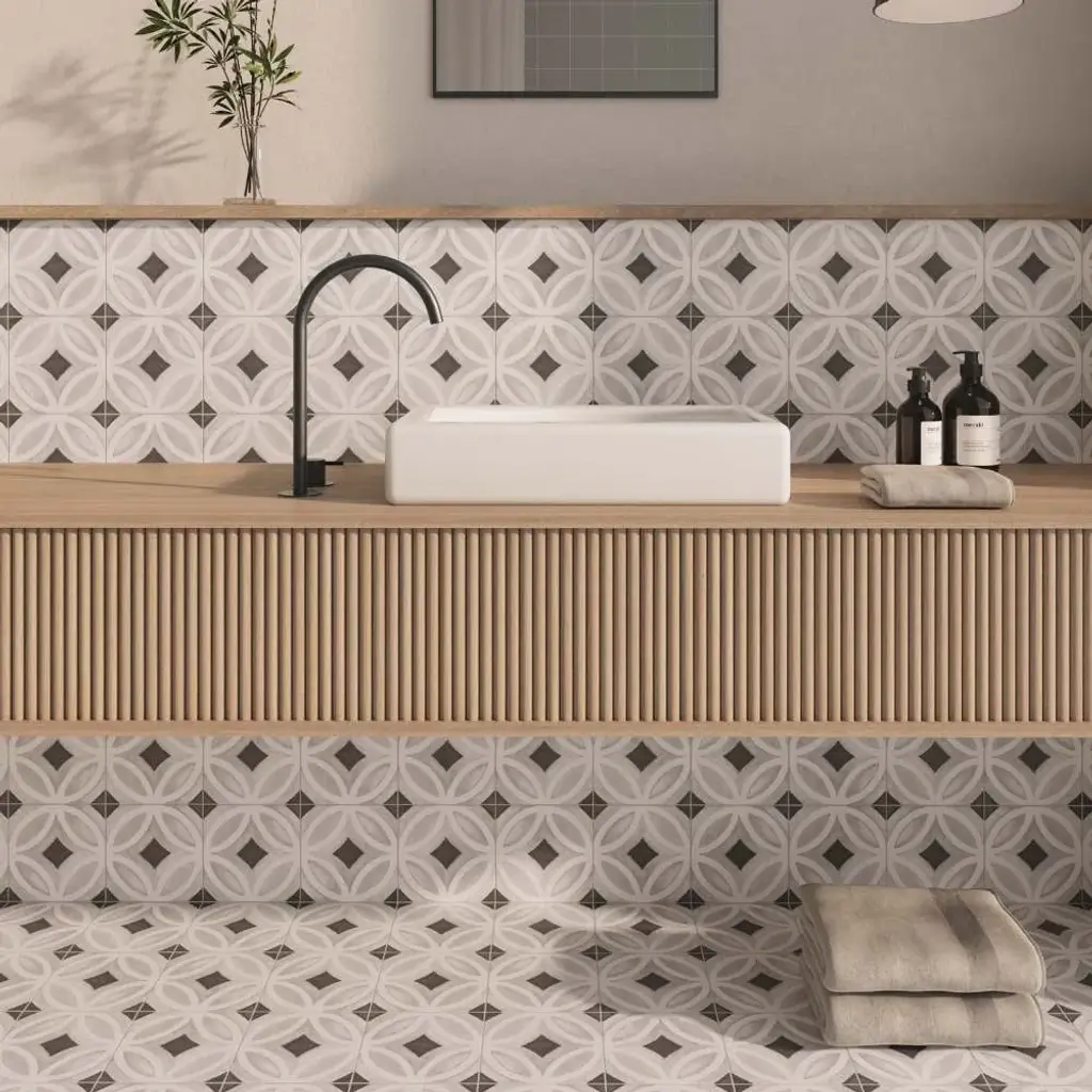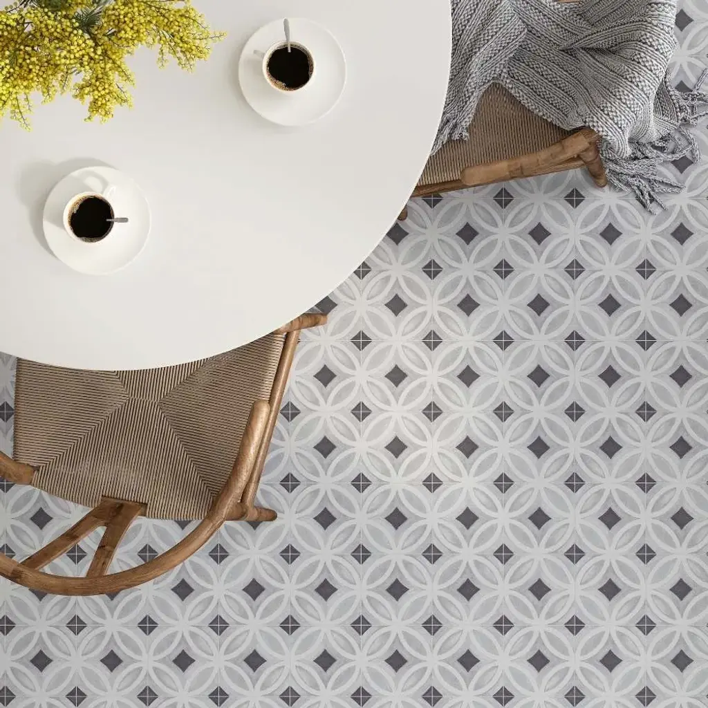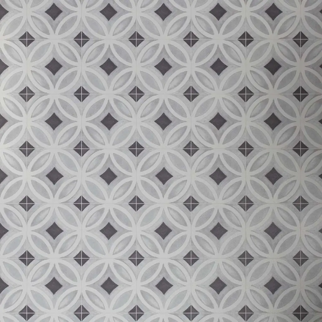 Crafted in Spain, the Cadence collection captures the beauty of intricate pattern work on a smooth, matte porcelain surface, bringing a sense of quiet artistry to any space. Inspired by traditional encaustic designs, each tile carries a depth of detail that feels both rich and effortless. Available in four versatile shades—Sky, Noir, Black, and Grey—Cadence adapts beautifully to both indoor and outdoor settings, lending a touch of old-world craftsmanship to modern surroundings. Whether underfoot or as a statement wall, it brings a rhythmic flow to the spaces it inhabits. FEATURES: A case of this product includes 25 pieces and covers 6.03 square feet Porcelain, singular, geometric, encaustic, patterned, matte, pressed, straight edge floor and wall tile Impervious and waterproof; Withstands sun and rain Matte finish with a shade 1 rating/ variation (V1 uniform appearance) Made in Spain Crafted from durable, long-lasting porcelain Features a modern, subtle matte finish Available in four (4) versatile colors: Sky, Noir, Black, and Grey Intricate encaustic patterned design to peak visual interest Suitable for interior and exterior spaces This product has a PEI rating of 3 (endurance and hardness indicator) and therefore is suited for residential countertops, walls, and medium-traffic floors Ideal for backsplashes, bathrooms, showers, kitchens, outdoors, pools, floors, walls Approved for residential and commercial installations Easy to install 6 inches x 6 inches decorative geometric pattern porcelain floor and wall tile DIMENSIONS: Individual tile size: 6 inches L x 6 inches W Surface area per carton: 6.03 square feet Sample tile size: Full size 6 inches L x 6 inches W
